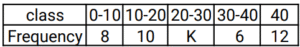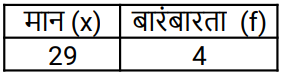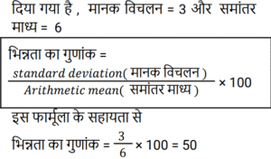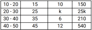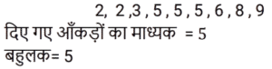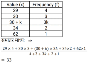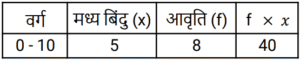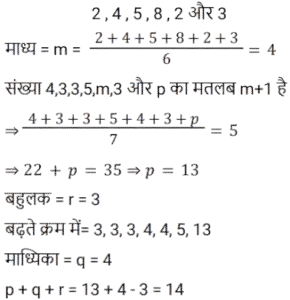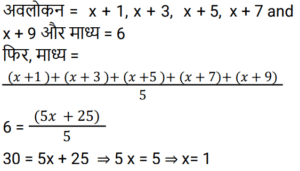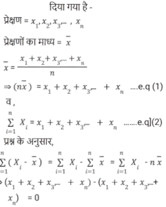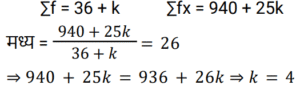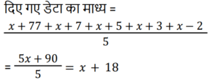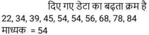 माध्य, माध्यिका और बहुलक Part-4Total Questions: 5041. निम्नलिखित संख्याओं के समूह के लिए माध्यिका और बहुलक ज्ञात कीजिए। [RRB NTPC 07/04/2021 (Evening)]2, 2, 3, 5, 5, 5, 6, 8, 9(a) माध्यिका = 5, मोड = 5(b) माध्यिका = 0, मोड = 9(c) माध्यिका = 2, मोड = 5(d) माध्यिका = 5, मोड = 2Correct Answer: (a) माध्यिका = 5, मोड = 5Solution:42. x और y का माध्य 400 है और x से y का अनुपात 3 : 7 है। y − x का मान क्या है? [RRB NTPC 07/04/2021 (Evening)](a) 130 (b) 800 (c) 320(d) 230Correct Answer: (c) 320Solution:43. निम्नलिखित आँकड़ों का माध्यिका क्या है? [RRB NTPC 08/04/2021 (Morning)]78, 56, 22, 34, 45, 54, 39, 68, 54, 84(a) 55 (b) 51 (c) 54(d) 53Correct Answer: (c) 54Solution:44. x + 77, x + 7, x + 5, x + 3 और x − 2 का माध्य ज्ञात कीजिए। [RRB NTPC 08/04/2021 (Morning)](a) x − 3 (b) x + 8 (c) x − 8 (d) x + 18Correct Answer: (d) x + 18Solution:45. यदि संख्याओं के एक समूह का मानक विचलन 3 है और इन संख्याओं का समांतर माध्य 6 है, तो इन संख्याओं की भिन्नता का गुणांक क्या है? [RRB NTPC 08/04/2021 (Morning)](a) 125 (b) 75 (c) 50(d) 100Correct Answer: (c) 50Solution:46. यदि निम्नलिखित बंटन का माध्य 26 है, तो k का मान क्या है? [RRB NTPC 08/04/2021 (Evening)](a) 8 (b) 1 (c) 4(d) 10Correct Answer: (c) 4Solution:47. 2, 4, 5, 8, 2 और 3 संख्याओं का माध्य m है। संख्या 4, 3, 3, 5, m, 3 और p का माध्य m + 1, माध्यिका q और बहुलक r है। (p + q − r) का मान क्या है? [RRB NTPC 08/04/2021 (Evening)](a) 13 (b) 21 (c) 20 (d) 14Correct Answer: (d) 14Solution:48. यदि x₁, x₂, x₃ … , xₙ प्रेक्षणों का माध्य x̄ है, तो: [RRB NTPC 24/07/2021 (Morning)](a)(b)(c)(d)Correct Answer: (a)Solution:49. दिए गए प्रेक्षणों का माध्य x + 1, x + 3, x + 5, x + 7 और x + 9 है, तो x का मान है: [RRB NTPC 24/07/2021 (Morning)](a) 5 (b) 6 (c) 3 (d) 1Correct Answer: (d) 1Solution:50. निम्न तालिका में बारंबारता बंटन दिया गया है जिसका समांतर माध्य 33 है। बंटन से k के संभावित मानों का गुणनफल ज्ञात कीजिए। [RRB NTPC 24/07/2021 (Evening)](a) 4 (b) 3 (c) 5 (d) 2Correct Answer: (d) 2Solution:Submit Quiz« Previous12345