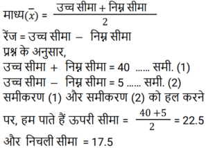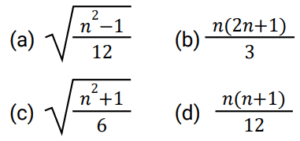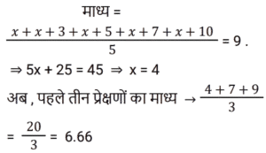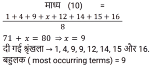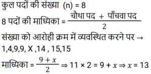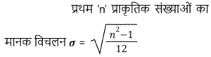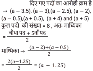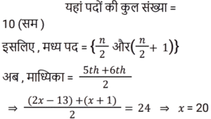 माध्य, माध्यिका और बहुलक Part-5Total Questions: 201. यदि ⁿC₃ = ⁿC₈, तो n का मान ज्ञात करें। [RRB NTPC 26/07/2021 (Evening)](a) 12 (b) 10 (c) 14 (d) 11Correct Answer: (d) 11Solution:2. निम्नलिखित विभिन्न मानों की माध्यिका (median) ज्ञात कीजिए। [RRB JE 27/05/2019 (Afternoon)](a + 4), (a − 3.5), (a − 2.5), (a − 3), (a − 2),(a + 0.5), (a + 5) और (a − 0.5)(a) a − 0.75(b) a − 1.5(c) a − 1.25(d) a − 2.5Correct Answer: (c) a − 1.25Solution:3. अवरोही क्रम में लिखे गए दस प्रेक्षण 45, 34, 32, 30, 2x − 13, x + 1, 17, 15, 14, 8 की माध्यिका (median) 24 है। x का मान ज्ञात करें। [RRB JE 28/05/2019 (Morning)](a) 15 (b) 20(c) 12 (d) 18Correct Answer: (b) 20Solution:4. प्रथम ‘n’ प्राकृतिक संख्याओं का मानक विचलन ज्ञात करें। [RRB JE 02/06/2019 (Afternoon)](a)(b)(c)(d)Correct Answer: (a)Solution:5. यदि किसी कक्षा का माध्य मान 20 है और कक्षा का प्रसार (width) 5 है, कक्षा की निचली और ऊपरी सीमाएं ज्ञात करें। [RRB JE 02/06/2019 (Evening)](a) 17 – 22(b) 17.5 – 22.5(c) 17 – 23(d) 18 – 22Correct Answer: (b) 17.5 – 22.5Solution:6. x, x + 3, x + 5, x + 7, x + 10 का माध्य (mean) 9 है। पहले 3 प्रेक्षणों का माध्य ज्ञात कीजिए। [RRB JE 28/06/2019 (Evening)](a) 7 (b) 6.66(c) 7.8 (d) 7.3Correct Answer: (b) 6.66Solution:7. 1, 4, 9, x, 12, 14, 15 और 16 का माध्य 10 है। बहुलक ज्ञात कीजिए। [ALP Tier II 21/01/2019 (Afternoon)](a) 10 (b) 11 (c) 9 (d) 12Correct Answer: (c) 9 Solution:8. पहली 100 प्राकृतिक संख्याओं का माध्य ज्ञात कीजिए? [ALP Tier II 21/01/2019 (Afternoon)](a) 50 (b) 51.5 (c) 50.5(d) 51Correct Answer: (c) 50.5Solution:9. 2, 5, 8, 14, 21 का माध्य (mean) ज्ञात कीजिए? [ALP Tier II 21/01/2019 (Morning)](a) 9 (b) 10(c) 9.5 (d) 8.5Correct Answer: (b) 10Solution:10. यदि संख्याओं 9, 15, 1, 15, 14, 9, 4 और x की माध्यिका 11 है, तो x का मान ज्ञात कीजिए। [ALP Tier II 23/01/2019 (Afternoon)](a) 11 (b) 13(c) 10 (d) 12Correct Answer: (b) 13Solution:Submit Quiz12Next »