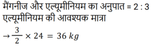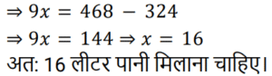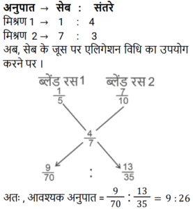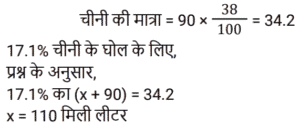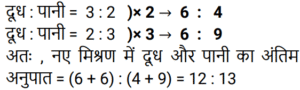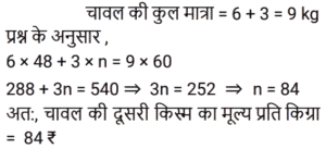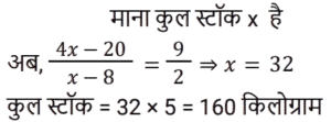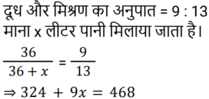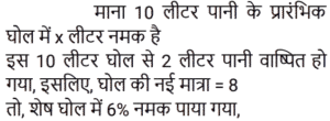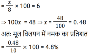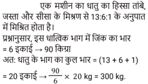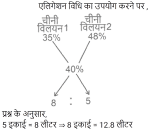 मिश्रण और पृथक्कीकरणTotal Questions: 5011. एक मिश्र धातु बनाने के लिए मैंगनीज और एल्यूमिनियम को 2 : 3 के अनुपात में मिलाया जाता है। 24 किलो मैंगनीज के साथ पिघलाने के लिए आवश्यक एल्यूमिनियम की मात्रा (किलोग्राम में) ______ है। [Group D 14/09/2022 (Morning)](a) 36(b) 12(c) 48(d) 72Correct Answer: (a) 36Solution:12. यदि एक दूधवाला 9 लीटर दूध में 4 लीटर पानी मिलाता है, तो दूध और पानी का अनुपात समान बनाए रखने के लिए उसे 36 लीटर दूध में कितना पानी मिलाना चाहिए? [Group D 18/09/2022 (Afternoon)](a) 16 लीटर(b) 12 लीटर(c) 10 लीटर(d) 14 लीटरCorrect Answer: (a) 16 लीटरSolution:13. ₹48 प्रति kg वाले 6 kg चावल को अन्य किस्म के 3 kg चावल के साथ मिश्रित करके ₹60 प्रति kg मूल्य वाला मिश्रण तैयार किया जाता है। इस मिश्रण में मिश्रित किए गए अन्य किस्म के चावल का प्रति kg मूल्य ज्ञात करें। [Group D 30/09/2022 (Afternoon)](a) ₹64(b) ₹72(c) ₹84(d) ₹80Correct Answer: (c) ₹84Solution:14. 3 : 2 के अनुपात में दूध और पानी वाले एक द्रव की 2 लीटर मात्रा को 2 : 3 के अनुपात में दूध और पानी वाले एक अन्य द्रव की 3 लीटर मात्रा में मिलाया जाता है। नए मिश्रण में दूध और पानी का अनुपात ज्ञात कीजिए। [Level 5 (12/06/2022) Shift 1](a) 9 : 4(b) 5 : 6(c) 12 : 13(d) 1 : 1Correct Answer: (c) 12 : 13Solution:15. 38% चीनी के घोल के 90 मिलीलीटर में कितना पानी मिलाना चाहिए ताकि यह 17.1% चीनी का घोल बन जाए? [Level 2 (13/06/2022) Shift 1](a) 110 मिलीलीटर(b) 100 मिलीलीटर(c) 81 मिलीलीटर(d) 95 मिलीलीटरCorrect Answer: (a) 110 मिलीलीटरSolution:16. 40% चीनी वाला विलयन प्राप्त करने के लिए 35% चीनी वाले विलयन की एक निश्चित मात्रा को 48% चीनी वाले विलयन की 8 लीटर मात्रा में मिश्रित किया जाता है। मिश्रण में 35% चीनी वाले विलयन की मात्रा कितनी थी? [Level 5 (15/06/2022) Shift 1](a) 12.8(b) 13.6(c) 13.2(d) 12.5Correct Answer: (a) 12.8Solution:17. सेब के रस और संतरे के रस वाले एक मिश्रण में 20% सेब का रस था। दोनों रसों वाले एक अन्य मिश्रण में 30% संतरे का रस था। दोनों मिश्रणों को एक निश्चित अनुपात में मिलाया गया, जिसकी वजह से निर्मित नए मिश्रण में सेब के रस और संतरे के रस का अनुपात 4 : 3 हो गया। अंतिम मिश्रण में पहले मिश्रण और दूसरे मिश्रण का क्रमशः अनुपात ज्ञात कीजिए। [Level 5 (15/06/2022) Shift 3](a) 10 : 29(b) 9 : 26(c) 2 : 7(d) 5 : 14Correct Answer: (b) 9 : 26Solution:18. दो उत्पादों A और B के स्टॉक में, आरंभ में कुल स्टॉक का 80% भाग उत्पाद A था। यदि स्टॉक से 20 kg उत्पाद A और 8 kg उत्पाद B निकाला जाता है, तो स्टॉक में उत्पाद A और उत्पाद B का अनुपात बदल कर 9 : 2 हो जाता है। आरंभ में कुल स्टॉक (kg में) कितना था? [Level 3 (17/06/2022) Shift 2](a) 150 kg(b) 165 kg(c) 220 kg(d) 160 kgCorrect Answer: (d) 160 kgSolution:19. दस लीटर विलयन से 2 लीटर पानी वाष्पित हो गया। शेष विलयन में 6% नमक पाया गया। वास्तविक विलयन में नमक का प्रतिशत कितना था?(a) 5.4%(b) 5.6%(c) 5%(d) 4.8%Correct Answer: (d) 4.8%Solution:20. एक मशीन का धातु भाग तांबे, जिंक और सीसा के मिश्रण से 13 : 6 : 1 के अनुपात में बनाया जाता है। यदि इसमें जिंक का वजन 90 किग्रा है, तो कुल वजन कितना होगा? [RRB NTPC 30/12/2020 (Morning)](a) 210 kg(b) 195 kg(c) 300 kg(d) 285 kgCorrect Answer: (c) 300 kgSolution:Submit Quiz« Previous12345Next »