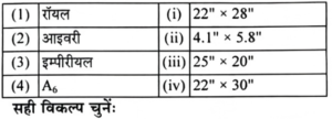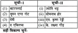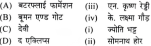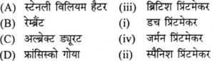 यू.जी.सी. NTA नेट (दिसम्बर) परीक्षा, 2019 दृश्य कलाTotal Questions: 10071. सूची-1 को सूची-11 से सुमेलित करें:(a) (1)-(iv), (2)-(iii), (3)-(i), (4)-(ii)(b) (1)-(iii), (2)-(i), (3)-(ii), (4)-(iv)(c) (1)-(i), (2)-(ii), (3)-(iv), (4)-(iii)(d) (1)-(ii), (2)-(iv), (3)-(iii), (4)-(i)Correct Answer: (a) (1)-(iv), (2)-(iii), (3)-(i), (4)-(ii)Solution:72. सूची-1 को सूची-II से सुमेलित करें:(a) (1)-(ii), (2)-(i), (3)-(iii), (4)-(iv)(b) (1)-(iv), (2)-(iii), (3)-(ii), (4)-(i)(c) (1)-(iii), (2)-(iv), (3)-(i), (4)-(ii)(d) (1)-(i), (2)-(ii), (3)-(iv), (4)-(iii)Correct Answer: (c) (1)-(iii), (2)-(iv), (3)-(i), (4)-(ii)Solution:73. सूची-1 को सूची-11 से सुमेलित करें:(a) (1)-(ii), (2)-(i), (3)-(iv), (4)-(ii)(b) (1)-(ii), (2)-(i), (3)-(iv), (4)-(iii)(c) (1)-(iii), (2)-(i), (3)-(ii), (4)-(iv)(d) (1)-(i), (2)-(iv), (3)-(ii), (4)-(iii)Correct Answer: (a) (1)-(ii), (2)-(i), (3)-(iv), (4)-(ii)Solution:74. सूची-1 को सूची-II से सुमेलित करें:(a) (1)-(iii), (2)-(iv), (3)-(ii), (4)-(i)(b) (1)-(i), (2)-(ii), (3)-(iii), (4)-(iv)(c) (1)-(iii), (2)-(i), (3)-(iv), (4)-(ii)(d) (1)-(iv), (2)-(iii), (3)-(ii), (4)-(i)Correct Answer: (c) (1)-(iii), (2)-(i), (3)-(iv), (4)-(ii)Solution:75. कागज का सही आकार ज्ञात कीजिए:(a) (1)-(iii), (2)-(i), (3)-(iv), (4)-(ii)(b) (1)-(ii), (2)-(iv), (3)-(iii), (4)-(i)(c) (1)-(iv), (2)-(iii), (3)-(ii), (4)-(i)(d) (1)-(i), (2)-(iv), (3)-(ii), (4)-(iii)Correct Answer: (a) (1)-(iii), (2)-(i), (3)-(iv), (4)-(ii)Solution:76. कलाकारों का सही कालक्रम चुनें(1) मेसैचियो (2) दोनातेलो(3) बोतिचेली(4) एंड्रिया डेल वेरोचियो सही विकल्प चुनें:(a) (1), (2), (3), (4)(b) (2), (1), (4), (3)(c) (1), (3), (2), (4)(d) (2), (3), (1), (4)Correct Answer: (b) (2), (1), (4), (3)Solution:कलाकारों का सही कालक्रम-दोनातेलो-(1386), मैसेंच्यो-(1401), एंड्रिया डेल वेरोचियो-(1435), बोतिचेली-(1445)77. निम्नांकित स्मारकों के सही कालक्रम की पहचान करें(1) अलाई दरवाजा (3) गोल गुम्बज (2) ताज महल (4) हुमायूं का मकबरा सही विकल्प चुनें;(a) (4), (3), (2), (1)(b) (2), (3), (1), (4)(c) (1), (2), (3), (4)(d) (1), (4), (2), (3)Correct Answer: (d) (1), (4), (2), (3)Solution:स्मारकों का सही कालक्रम-अलाइ दरवाजा-1311 ई.,हुमायूं का मकबरा-1562 ई.,ताजमहल-1631 ई.,गोल गुंबज-1650 ई.78. सामान्य व्यवहार में उनके प्रयोग के अनुसार रंगों के सही क्रम का चयन करें(1) मैजेंटा(2) येलो(3) सियान(4) ब्लैक सही क्रम है:(a) (1), (2), (3), (4)(b) (3), (1), (2), (4)(c) (2), (3), (4), (1)(d) (3), (1), (4), (2)Correct Answer: (b) (3), (1), (2), (4)Solution:रंगों का सही क्रम- CMYK- सियान, मैजेंटा, येलो, ब्लैक79. निम्नांकित कला आंदोलनों की अवधि के अनुसार उनके सही क्रम का चयन करें(1) संरचनावाद(2) यथार्थवाद(3) बरोक(4) मैनिरिज्म सही क्रम है:(a) (3), (4), (1), (2)(b) (4), (3), (2), (1)(c) (1), (2), (3), (4)(d) (2), (1), (4), (3)Correct Answer: (b) (4), (3), (2), (1)Solution:कला आंदोलनों की अवधि के अनुसार सही क्रम है-मैनिरिज्म, बरोक, यथार्थवाद, संरचनावाद।80. निम्नांकित मूर्तियों के नाम हैं:(1) सारनाथ बुद्ध(2) यक्ष(3) डांसिंग गर्ल(4) शिव-नटराज उपर्युक्त मूर्तियों के कालक्रमानुसार सही क्रम का चयन करें:(a) (4), (3), (2), (1)(b) (1), (4), (3), (2)(c) (2), (1), (4), (3)(d) (3), (2), (1), (4)Correct Answer: (d) (3), (2), (1), (4)Solution:मूर्तियों का काल क्रमानुसार सही क्रम है- डांसिंग गर्ल, यक्ष, सारनाथ बुद्ध, शिव नटराजनSubmit Quiz« Previous12345678910Next »