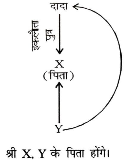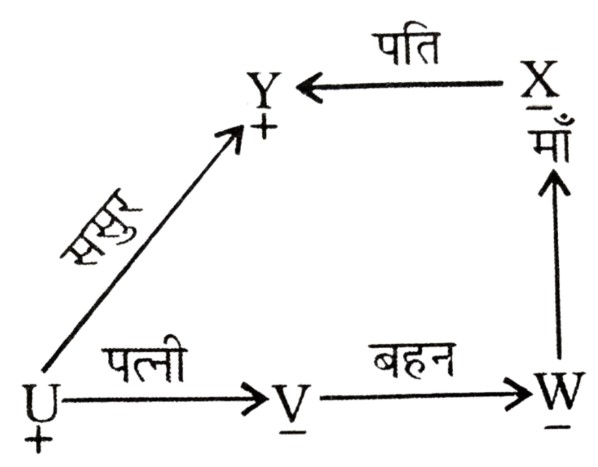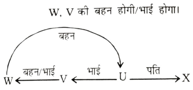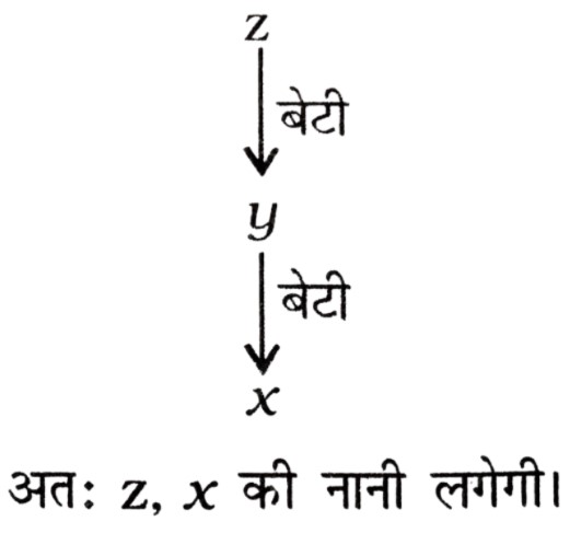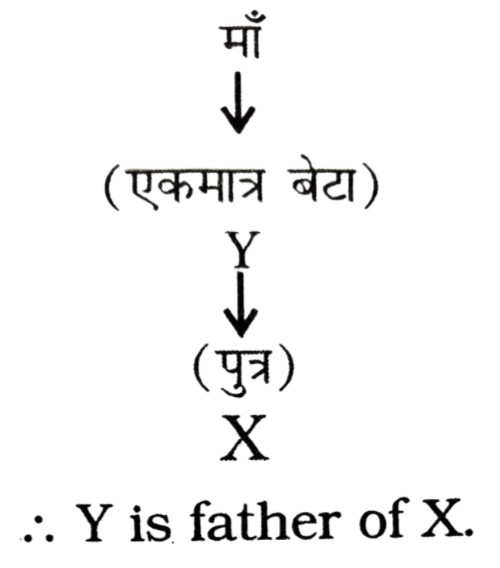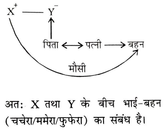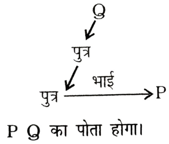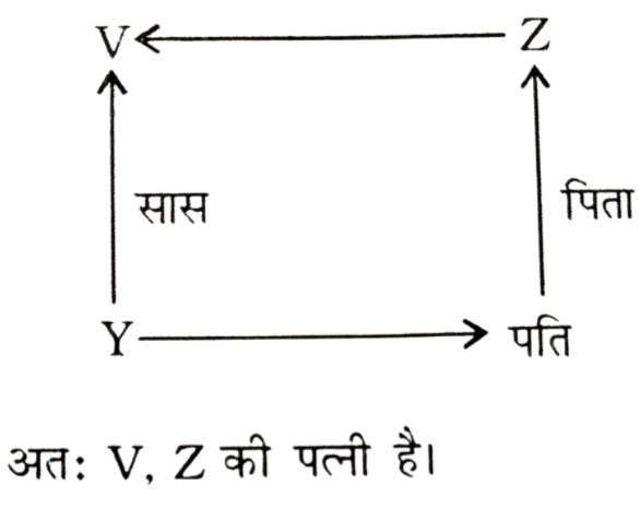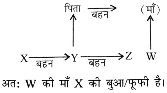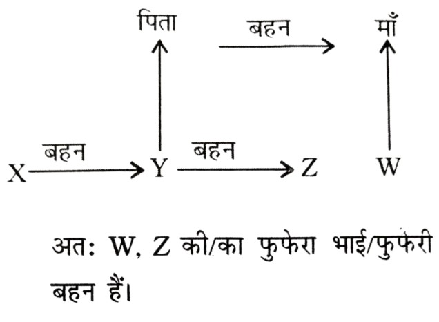 रक्त संबंध Type-I (प्रश्न 151-201)Total Questions: 511. यदि X, Y की बेटी है और Y, Z की बेटी है, तो Z, X की ....... है [RRB Group 'D' CBT परीक्षा, 26.11.2018 (प्रथम पाली)](1) माँ(2) बेटी(3) नानी/नाना(4) पोतीCorrect Answer: (3) नानी/नानाSolution:2. V, Y की सास है। Z, Y के पति का पिता है। V, Z का ....... है। [RRB Group 'D' CBT परीक्षा, 28.11.2018 (प्रथम पाली)](1) बहन(2) माँ(3) बेटी(4) पत्नीCorrect Answer: (4) पत्नीSolution:3. श्री X सुश्री Y से कहते हैं, "आपके पिता की पत्नी की बहन मेरी मौसी है"। श्री X का सुश्री Y से क्या संबंध है? [RRB Group 'D' CBT परीक्षा, 14.12.2018 (द्वितीय पाली)](1) चचेरा/ममेरा/फुफेरा भाई-बहन(2) पिता(3) साला/बहनोई(4) पुत्रCorrect Answer: (1) चचेरा/ममेरा/फुफेरा भाई-बहनSolution:4. यदि X की दो बहनें Y और Z हैं और W की माँ Y के पिता की बहन है तो W Z का (की) ....... है। [RRB ALP एवं Technician परीक्षा, 10.08.2018 (तृतीय पाली)](1) पिता(2) भतीजी/भाँजी(3) माँ(4) चचेरा/ममेरा/मौसेरा/फुफेरा भाई, चचेरी/ममेरी/मौसेरी/फुफेरी बहनCorrect Answer: (4) चचेरा/ममेरा/मौसेरा/फुफेरा भाई, चचेरी/ममेरी/मौसेरी/फुफेरी बहनSolution:5. यदि 'U', 'V', का पति है, 'V' और 'W', 'X', की पुत्रियाँ हैं, 'Y', 'X' का पति है तो 'Y', 'U' का ....... है। [RRB ALP एवं Technician परीक्षा, 14.08.2018 (तृतीय पाली)](1) भाई(2) ससुर(3) पिता(4) बेटाCorrect Answer: (2) ससुरSolution:6. X की ओर संकेत करते हुए, Y कहता है, "X ही मेरी माँ के एकमात्र बेटे का पुत्र है" फिर Y X का ....... है। [RRB ALP एवं Technician परीक्षा, 17.08.2018 (प्रथम पाली)](1) ससुर(2) भाई(3) पिता(4) दादाCorrect Answer: (3) पिताSolution:7. यदि V, U का भाई है, U, W की बहन है और X, U का पति है तो W, V का/की ....... है। [RRB ALP एवं Technician परीक्षा, 17.08.2018 (तृतीय पाली)](1) साला/जेठ/देवर/जीजा या साली/जेठानी/देवरानी/भाभी(2) चाचा/मामा/मौसा/फूफा/ताऊ या चाची/मामी/मौसी/फूफी/ताई(3) भाई या बहन(4) माँCorrect Answer: (3) भाई या बहनSolution:8. यदि P, Q के पुत्र के पुत्र का भाई हो, तो P, Q से किस प्रकार सम्बंधित है? [RRB ALP एवं Technician परीक्षा, 20.08.2018 (तृतीय पाली)](1) भाई(2) पुत्र(3) पोता(4) भतीजाCorrect Answer: (3) पोताSolution:9. श्री X कुमारी Y के दादा का इकलौता बेटा है। यदि श्री X का कोई भाई या बहन नहीं हैं और उनके पिता कुमारी Y के दादा हैं तो श्री X का कुमारी Y से क्या सम्बंध है? [RRB ALP एवं Technician परीक्षा, 21.08.2018 (प्रथम पाली)](1) ससुर(2) चाचा/मामा/फूफा/मौसा/ताऊ(3) भाई(4) पिताCorrect Answer: (4) पिताSolution:10. यदि श्रीमान X की दो बहनें Y और Z हैं और W की माँ Y के पिता की बहन है, तो W की माँ X की ....... है। [RRB ALP एवं Technician परीक्षा, 29.08.2018 (तृतीय पाली)](1) चाची/मौसी/बुआ/फूफी/मामी(2) माँ(3) दादी/नानी(4) बहनCorrect Answer: (1) चाची/मौसी/बुआ/फूफी/मामीSolution:Submit Quiz123456Next »