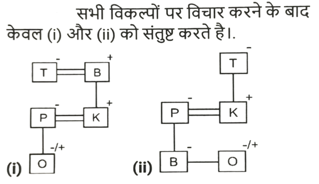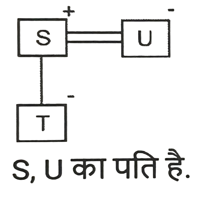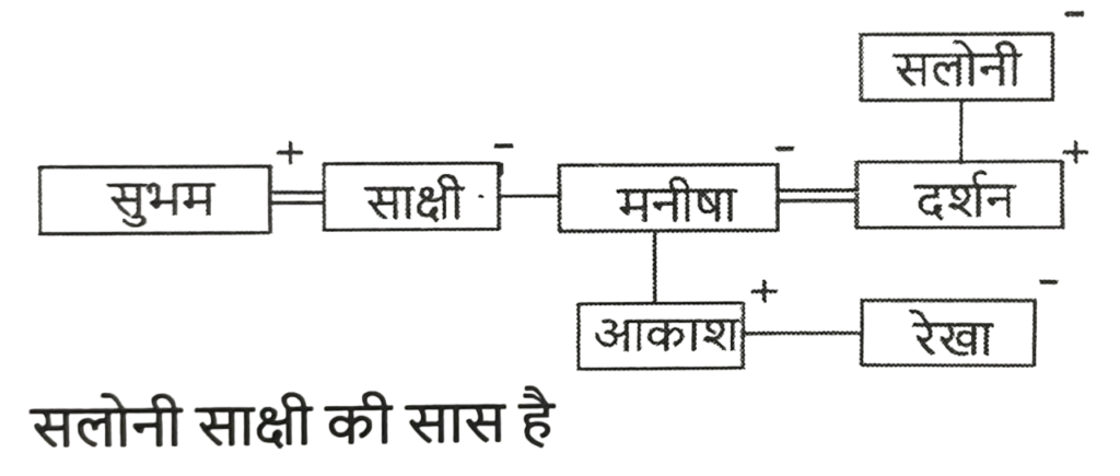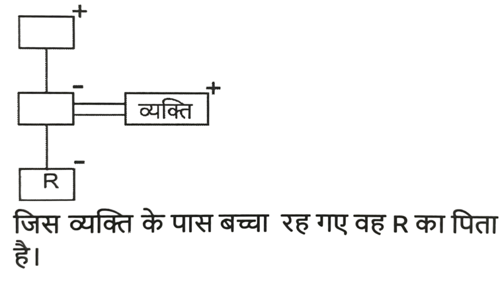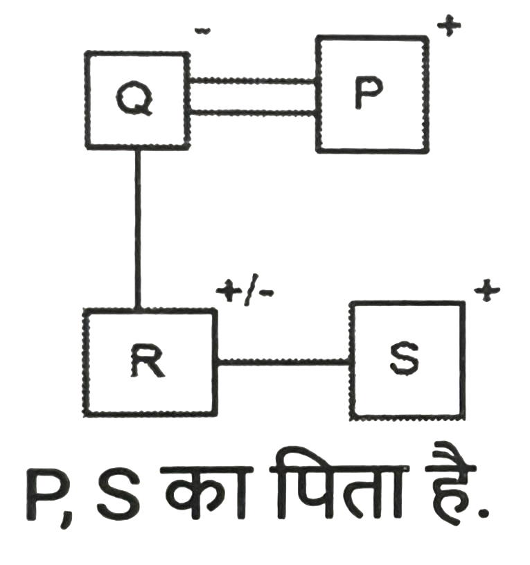 रक्त सम्बन्ध (भाग-I)Total Questions: 501. एक निश्चित कूट भाषा में, ‘A + B’ का अर्थ है ‘A, B की माँ है’, ‘A – B’ का अर्थ है ‘A, B का पिता है’, ‘A $ B’ का अर्थ है ‘A, B का पुत्र है’, ‘A % B’ का अर्थ है ‘A, B की बहन है’, ‘A / B’ का अर्थ है ‘A, B की पत्नी है’ और ‘A * B’ का अर्थ है ‘A, B का पति है’। निम्नलिखित में से किसका अर्थ है कि P, T की पुत्रवधू है ? [SSC CGL 13/09/2024 (2nd Shift)]i. T / B - K * P + O ii. T + K + P + B % O iii. K * P + B % T + P iv. P + T * K + B % O(a) केवल ।(b) । और ii दोनों(c) iii और iv(d) केवल iiCorrect Answer: (b) । और ii दोनोंSolution:2. T + W' का अर्थ है 'T, W का पिता है' 'T - W' का अर्थ है 'T, W की पत्नी है' 'T × W' का अर्थ है 'T, W का भाई है' 'T ÷ W' का अर्थहै 'T, W की पुत्री है'। ‘S + T ÷ U’ का क्या अर्थ है ? [SSC CHSL 09/07/2024 (4th Shift)](a) S, U का भाई है(b) S, U का पति है(c) S, U का पुत्र है(d) S, U का अंकल हैCorrect Answer: (b) S, U का पति हैSolution:3. Q, R की माँ है। P, Q का पति है। S, R का भाई है। P का S से क्या संबंध है ? [SSC CGL Tier II 26/10/2023](a) पिता(b) भाई(c) पुत्र(d) सालाCorrect Answer: (a) पिताSolution:4. "A = B" का अर्थ है कि "A, B का पिता है"। "A $ B" का अर्थ है कि "A, B की बहन है"। "A * B" का अर्थ है कि "A, B की माता है"। "A ? B" का अर्थ है कि "A, B का पुत्र है"। यदि M ? C $ J * Z है, तो J का M से क्या संबंध है? [SSC CPO 03/10/2023 (1st Shift)](a) भाई(b) बहन(c) मौसी(d) नानीCorrect Answer: (c) मौसीSolution:5. एक निश्चित कूट भाषा में, 'W + V' का अर्थ 'W, V की बहन है', 'W # V' का अर्थ 'W, V का पति है', 'W' $ 'V' का अर्थ 'W, V की बेटी है', 'W % V' का अर्थ 'W, V की मां है', 'W @ V' का अर्थ 'W, V का भाई है'। [SSC CHSL 08/08/2023 (4th Shift)]उपरोक्त के आधार पर, निम्नलिखित में से कौन-सा व्यंजक दर्शाता है कि 'Y, Z की पत्नी है'?(a) Z @ R + K + P % Y(b) P $ Y % R + K % Z(c) Y % P # K + R % Z(d) Y % P + K @ R $ ZCorrect Answer: (d) Y % P + K @ R $ ZSolution:6. एक फोटो की ओर इशारा करते हुए महेश ने कहा, "वह मेरे दादा के इकलोते बेटे की बेटी है।" फोटो में लड़की का महेश से क्या संबंध है? [SSC CHSL 03/08/2023 (1st Shift)](a) बहन(b) बेटी(c) माँ की बहन(d) माँCorrect Answer: (a) बहनSolution:7. L, G की बहन है। G, M का बेटा है। M का विवाह D से हुआ है। D, E की बहन है। E, C का बेटा है। C का विवाह S से हुआ है। S, P की बहन है। L का E से क्या संबंध है? [SSC CHSL 02/08/2023 (1st Shift)](a) पत्नी की बहन(b) भाई की बेटी(c) बहन की बेटी(d) बेटीCorrect Answer: (c) बहन की बेटीSolution:8. एक परिवार बँट गया और R के बच्चे R के नाना की इकलौती नवासी के पिता के पास रह गए। वह व्यक्ति जिसके पास बच्चे रह गए है, R से किस प्रकार संबंधित है ? [SSC CGL 25/07/2023 (3rd shift)](a) R का बेटा(b) R के दादा(c) R के नाना(d) R के पिताCorrect Answer: (d) R के पिताSolution:9. D, P, W, Y और M का एक परिवार एक-दूसरे से मिलने के लिए यात्रा कर रहा है। W अपनी पुत्रियों D और P के साथ यात्रा कर रहा है M अपनी नानी Y के साथ यात्रा कर रहा/रही है। D, M की माता है Y, P से किस प्रकार संबंधित है? [SSC CGL 18/07/2023 (3rd shift)](a) पुत्र(b) माता(c) दादी /नानी(d) बहनCorrect Answer: (b) माताSolution:10. मनीषा की बहन साक्षी सुभम की पत्नी है। सुभम दर्शन का भाई है। मनीषा के बेटे आकाश की एक बहन रेखा है, जो दर्शन की बेटी है। रेखा के पिता दर्शन, की माँ सलोनी है। सलोनी का साक्षी से क्या संबंध है ? [SSC CHSL 16/03/2023 (4th Shift)](a) बहू(b) बहन(c) सास(d) बेटीCorrect Answer: (c) सासSolution:Submit Quiz12345Next »