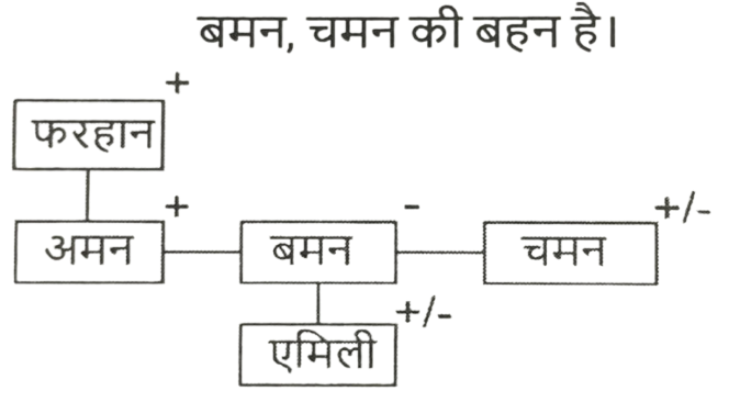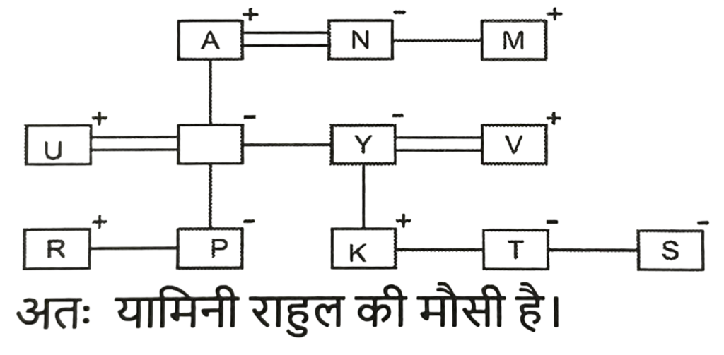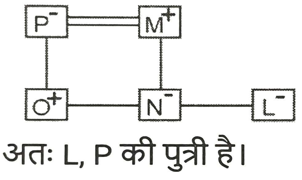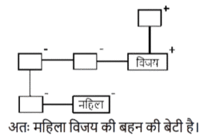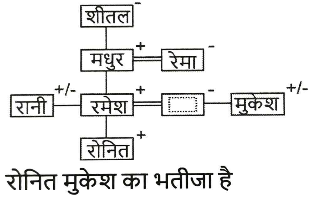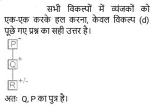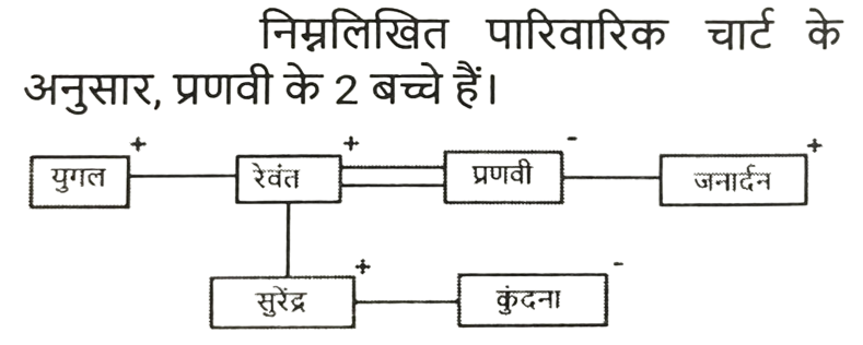 रक्त सम्बन्ध (भाग-I)Total Questions: 5011. मुकेश की बहन रमेश की पत्नी है। रमेश रानी का इकलौता भाई है। रमेश के पिता मधुर हैं। शीतल रमेश की दादी हैं। रेमा शीतल की बहू है। रोनित रानी के भाई का बेटा है। रोनित का मुकेश से क्या संबंध है? [SSC CHSL 15/03/2023 (3rd Shift)](a) बेटा(b) भाई(c) साला(d) भतीजाCorrect Answer: (d) भतीजाSolution:12. अमन, बमन और चमन का भाई हैI बमन, एमिली की माँहै। फरहान अमन के पिता हैं तो निम्नलिखित में से कौन-सा निहित रूप से सत्य है? [SSC CHSL 13/03/2023 (2nd Shift)](a) अमन और एमिली भाई - बहन हैं।(b) चमन पुरुष है।(c) चमन, अमन का भाई है।(d) बमन, चमन की बहन है।Correct Answer: (d) बमन, चमन की बहन है।Solution:13. A + B का अर्थ है कि 'A, B के पिता है' A * B का अर्थ है कि 'A, B की बहन है' A % B का अर्थ है कि 'A, B की पुत्री है' A $ B का अर्थ है कि 'A, B का पुत्र है यदि L % M + N * O $ P है, तो L का P से क्या संबंध है? [SSC CGL 03/12/2022 (3rd Shift)](a) बहन(b) पुत्री(c) माता(d) सासCorrect Answer: (b) पुत्रीSolution:14. यदि A + B का अर्थ है कि A, B का पिता है, A - B का अर्थ है कि A, B की माता है, A × B का अर्थ है कि A, B का भाई है, तो निम्नलिखित में से कौन सा व्यंजक यह निरूपित करता है, कि Q, P का पुत्र है? [SSC CGL 01/12/2022 (3rd Shift)](a) P × P - Q(b) P + Q - R(c) P + R × Q(d) P - Q + RCorrect Answer: (d) P - Q + RSolution:15. छः बच्चे अर्थात् 1, 2, 3, 4, 5, और 6 लूडो खेल रहे हैं। 1 और 5 भाई हैं। 6, 5 की बहन है। 3, 1 के पिता के भाई का इकलौता पुत्र है। 2 और 4, 3 के पिता के इकलौते भाई की बेटियां हैं। 4, 1 से किस प्रकार संबंधित है? [SSC CPO 10/11/2022 (Afternoon)](a) बहन(b) चाचा(c) भतीजी(d) चचेरा भाईCorrect Answer: (a) बहनSolution:16. प्रियांश, जो रजत (पुरुष) का इकलौता पुत्र है, प्रकाश से कहता है, "तुम्हारी माँ, वीणा मेरे पिता की बड़ी बहन है, जो कृष्ण जी के इकलौते पुत्र है"। रजत, प्रकाश से किस प्रकार संबंधित है ? [SSC CHSL 07/06/2022 (Afternoon)](a) मामा(b) कजिन(c) पिता(d) बेटाCorrect Answer: (a) मामाSolution:17. एक तस्वीर में एक महिला की ओर इशारा करते हुए, विजय ने कहा, "उसकी बहन की मां मेरे पिता की बेटी की बहन है।" वह महिला विजय से किस प्रकार संबंधित है ? [SSC CHSL 25/05/2022 (Afternoon)](a) माँ(b) बहन की बेटी(c) बेटी(d) बहनCorrect Answer: (b) बहन की बेटीSolution:18. जाह्नवी, तरुणी की बहन हैं, तरुणी की शादी दिलीप से हुई है, दिलीप, रघुका पिता है, मनोज, हेमा का पुत्र है, तरुणी, हेमा की सास हैं। दिलीप का एक ही बेटा हैऔर कोई बेटी नहीं है, जाह्नवी की शादी बरुण से हुई है, लेखा बरुण की पुत्री है।जाह्नवी की बहन का मनोज के दादा से क्या संबंध है ? [SSC CGL 18/04/2022 (Evening)](a) बहन(b) पत्नी(c) सास(d) मांCorrect Answer: (b) पत्नीSolution:19. परमिला , अकुन की पोती है जिसकी शादी निकिता से हुई है। मुरली , अकुन का साला है जिसकी दो बेटियां हैं लेकिन कोई बेटा नहीं है। राहुल , कमल का चचेरा भाई और परमिला का भाई है। उदय और वनमय निकिता के दामाद हैं। वनमय की शादी यामिनी से हुई है और उनकी दो बेटियां और एक बेटा है। उदय का एक बेटा और एक बेटी है। टीना और स्मिता यामिनी की बेटियां हैं। मुरली अविवाहित है। यामिनी का राहुल से क्या संबंध है ? [SSC CGL 11/04/2022 (Afternoon)](a) मौसी(b) 
