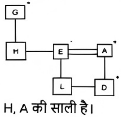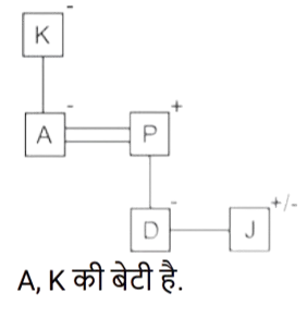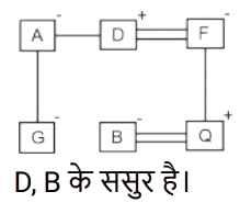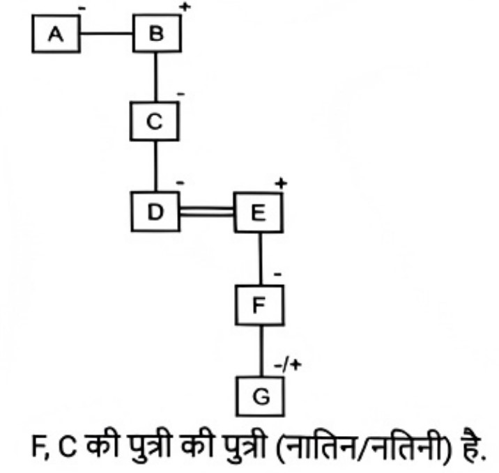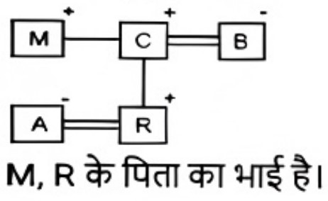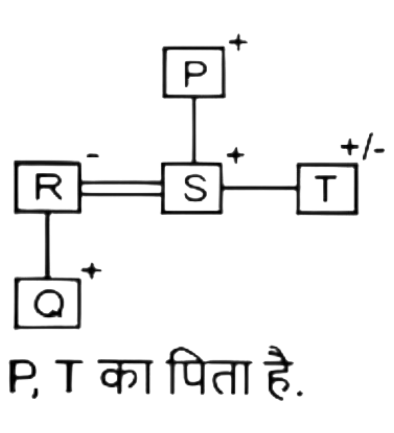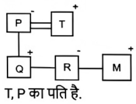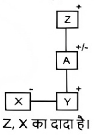 रक्त सम्बन्ध (भाग-I)Total Questions: 5021. अमित की तस्वीर की तरफ इशारा करते हुए गगन ने कहा, "इसकी बहन की माँ के पति मेरी बेटी की माँ के पति के पिता है| " अमित गगन से किस प्रकार सम्बंधित है ? [SSC CHSL 19/03/2020 (Afternoon)](a) भतीजा(b) मामा(c) पिता(d) भाईCorrect Answer: (d) भाईSolution:22. यदि X, Y की बहन है, Z, A का पिता है और Y, A का पुत्र है, तो Z का X से क्या संबंध है ? [SSC Stenographer 10/12/2024 (Morning)](a) परदादा/परनाना(b) पोती/नातिन/नवासी(c) पिता(d) दादा/नानाCorrect Answer: (d) दादा/नानाSolution:23. A, R की पत्नी है। R, C का पुत्र है। B, C की पत्नी है और M, C का भाई है। M का R से क्या संबंध है? [SSC Stenographer 10/12/2024 (Afternoon)](a) बुआ(b) पिता(c) चाचा(d) पुत्रCorrect Answer: (c) चाचाSolution:24. एक निश्चित कूट भाषा में, 'M & N' का अर्थ है, 'M, N की पत्नी है', 'M @ N' का अर्थ है, 'M, N के दादा है', 'M % N' का अर्थ है, 'M, N का भाई है', 'M # N' का अर्थ है, 'M, N का पुत्र है'। [SSC Stenographer 10/12/2024 (Evening)]उपरोक्त के आधार पर, यदि 'P @ Q # R & S% T' है, तो P, T से किस प्रकार संबंधित है?(a) ससुर(b) पिता(c) भाई(d) पिता के भाईCorrect Answer: (b) पिताSolution:25. D, F से विवाहित है। B, Q की पत्नी है। G, A की पुत्री है। F, Q की माता है। A, D की बहन है। D, B से किस प्रकार संबंधित है? [SSC Stenographer 11/12/2024 (Morning)](a) ससुर(b) सास(c) दामाद(d) पुत्र-वधुCorrect Answer: (a) ससुरSolution:26. E, L की माता है। G, H का पिता है। L, D की बहन है। H, E की बहन है। D, A का पुत्र है। H, A से किस प्रकार संबंधित है ? [SSC Stenographer 11/12/2024 (Evening)](a) जीजा(b) साला(c) साली(d) भाभीCorrect Answer: (c) सालीSolution:27. एक निश्चित कूट भाषा में, ‘A + B’ का अर्थ है ‘A, B की माँहै’, ‘A – B’ का अर्थ है ‘A, B का पिता है’, ‘A $ B’ का अर्थ है ‘A, B का पुत्र है’, ‘A % B’ का अर्थ है ‘A, B की बहन है’, ‘A / B’ का अर्थ है ‘A, B की पत्नी है’ ‘A = B’ का अर्थ है ‘A, B का भाई है’। [SSC CGL 09/09/2024 (1st Shift)]निम्नलिखित में से किसका अर्थ है कि A, K की पुत्री है? i. A + K / J – P = D ii. J % P = K + A = D iii. K + A / P – D % J iv. D + K = A / P – J(a) ii(b) i(c) iii(d) ivCorrect Answer: (c) iiiSolution:28. एक निश्चित कूट भाषा में, R + T का अर्थ है कि 'R, T की बहन है'। R – T का अर्थ है कि 'R, T का पिता है'। R * T का अर्थ है कि 'R, T की पत्नी है'। R ÷ T का अर्थ है कि 'R, T की माता है'। [SSC CGL 09/09/2024 (2nd Shift)]उपरोक्त के आधार पर, यदि 'A + B – C ÷ D * E – F ÷ G' है, तो F का C से क्या संबंध है?(a) नातिन/नतिनी(b) पत्नी(c) पुत्री(d) माताCorrect Answer: (a) नातिन/नतिनीSolution:29. एक निश्चित कूट भाषा में, A + B का अर्थ है 'A, B का पुत्र है', A − B का अर्थ है 'A, B की बहन है', A × B का अर्थ है 'A, B का भाई है' और A ÷ B का अर्थ है 'A, B की माता है'। [SSC CGL 09/09/2024 (3rd Shift)]उपरोक्त के आधार पर, यदि 'P ÷ Q × R - M + T' है, तो T, P से किस प्रकार संबंधित है?(c) पिता(b) भाई(a) पुत्र(d) पतिCorrect Answer: (d) पतिSolution:30. एक निश्चित कूट भाषा में, A + B का अर्थ है कि 'A, B का भाई है। A - B का अर्थ है कि 'A, B का पिता है। A ✕ B का अर्थ है कि 'A, B की माता है'। A ÷ B का अर्थ है कि 'A, B की पत्नी है। [SSC CGL 10/09/2024 (2nd Shift)]उपर्युक्त के आधार पर, यदि 'P ✕ Q + R ÷ S - T' है, तो P का T से क्या संबंध है?(a) बहन(b) पत्नी(c) माता(d) नानीCorrect Answer: (d) नानीSolution:Submit Quiz« Previous12345Next »