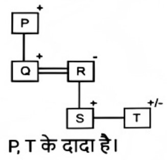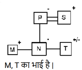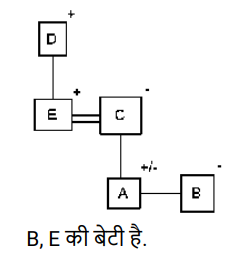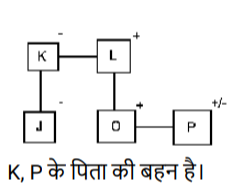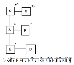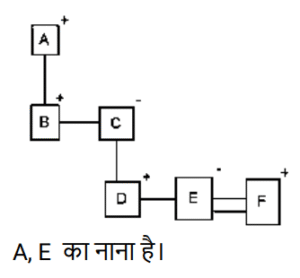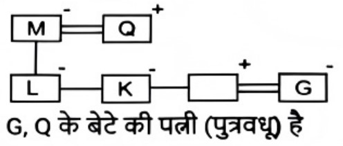 रक्त सम्बन्ध (भाग-II)Total Questions: 5031. एक निश्चित कूट भाषा में, 'M & N' का अर्थ है 'M, N की पत्नी है', 'M @ N' का अर्थ है 'M, N का भाई है', 'M $ N' का अर्थ है 'M, N की मां है', 'M # N' का अर्थ है 'M, N की बहन है'। इसके आधार पर, , यदि 'P & Q @ R $ T # U' है, तो Q, U से किस प्रकार संबंधित है? [SSC CHSL 11/07/2024 (2nd Shift)](a) पिता(b) पिता के भाई(c) मां के भाई(d) भाईCorrect Answer: (c) मां के भाईSolution: Q, U की माँका भाई है।32. एक निश्चित कूट भाषा में, ‘A + B’ का अर्थ है, ‘A, B की बहन है’, ‘A – B’ का अर्थ है, ‘A, B का भाई है’, ‘A × B’ का अर्थ है, ‘A , B के पिता है’, ‘A ÷ B’ का अर्थ है, ‘A, B की पुत्री है’. [SSC CHSL 11/07/2024 (3rd Shift)]उपरोक्त के आधार पर, यदि‘ J ÷ K + L × O – P’ है, तो K का P से क्या संबंध है?(a) माता की बहन(b) माता(c) बहन(d) पिता की बहनCorrect Answer: (d) पिता की बहनSolution:33. एक निश्चित कूट भाषा में, A + B का अर्थ है 'A, B के भाई की पत्नी है, A - B का अर्थ है 'A, B की बहन है, A × B का अर्थ है 'A, B की पत्नी है', A ÷ B का अर्थ है 'A, B की पुत्री है'। [SSC CPO 27/06/2024 (1st Shift)]उपरोक्त के आधार पर, यदि 'G + K - L ÷ M × Q' हैतो G, Q से किस प्रकार संबंधित है ?(a) पुत्रवधू(b) बहन(c) साली(d) पुत्रीCorrect Answer: (a) पुत्रवधूSolution:34. एक निश्चित कूट भाषा में, 'A + B' का अर्थ है 'A, B का पिता है', 'A - B' का अर्थ है 'A, B का पति है', 'A × B' का अर्थ है 'A, B की मां है', 'A ÷ B' का अर्थ है 'A, B का भाई है'। [SSC CPO 27/06/2024 (2nd Shift)]यदि 'P + Q - R × S ÷ T' है तो P का T से क्या संबंध है ?(a) दादा(b) नाना(c) चाचा/ताऊ(d) मामाCorrect Answer: (a) दादाSolution:35. एक निश्चित कूट भाषा में, 'A + B' का अर्थ है'A, B की माता है' 'A - B' का अर्थ है' A, B का पति है 'A × B' का अर्थ है'B, A की बहन है' 'A ÷ B' का अर्थ है' A, B का पिता है' [SSC CPO 27/06/2024 (3rd Shift)]उपर्युक्त के आधार पर, यदि ''D ÷ E - C + A × B है”, तो B, E से किस प्रकार संबंधित है ?(a) पुत्र(b) माता(c) पत्नी(d) पुत्रीCorrect Answer: (d) पुत्रीSolution:36. A, B, C, D, E और F एक परिवार के छह सदस्य हैं। परिवार में माता-पिता, उनके बच्चे और पोते-पोतियाँ हैं। A, C का पुत्र है और E, A की पुत्री है। D, F की पुत्री है जो E की माता है। निम्नलिखित में से कौन-सा युग्म माता-पिता के पोते-पोतियों का है ? [SSC CPO 27/06/2024 (3rd Shift)](a) D, E(b) C, E(c) A, D(d) A, ECorrect Answer: (a) D, ESolution:37. एक निश्चित कूट भाषा में, A + B का अर्थ है 'A, B की मां है' A − B का अर्थ है 'A, B का भाई है' A × B का अर्थ है 'A, B की पत्नी है' A ÷ B का अर्थ है 'A, B का पिता है' [SSC CPO 28/06/2024 (1st Shift)]उपर्युक्त के आधार पर, यदि 'A ÷ B - C + D - E × F' है, तो A का E से क्या संबंध है ?(a) पिता(b) दादा(c) नाना(d) भाईCorrect Answer: (c) नानाSolution:38. एक निश्चित कूट भाषा में, 'A × B' का अर्थ है कि 'A, B का पुत्र है', 'A – B' का अर्थ है कि 'A, B का भाई है', 'A + B' का अर्थ है कि 'A, B की पत्नी है', 'A % B' का अर्थ है कि 'A, B का पिता है'। [SSC CPO 28/06/2024 (2nd Shift)]यदि 'M + N × P % S – T' है तो M का T से क्या संबंध है ?(a) पत्नी की दादी(b) भाभी(c) नानी(d) भाभी की दादीCorrect Answer: (b) भाभीSolution:39. एक निश्चित कूट भाषा में, 'A × B' का अर्थ है कि 'A, B का पुत्र है', 'A – B' का अर्थ है कि 'A, B का भाई है', 'A + B' का अर्थ है कि'A, B की पत्नी है', 'A % B' का अर्थ है कि 'A, B का पिता है'। [SSC CPO 28/06/2024 (3rd Shift)]यदि 'M × N + P – S % T' है तो M का T से क्या संबंध है ?(a) मामा(b) माँ का मामा(c)