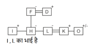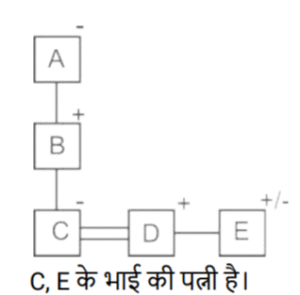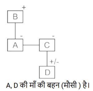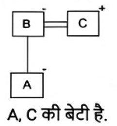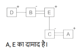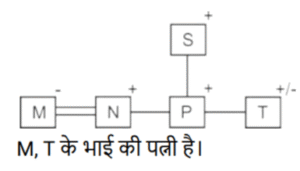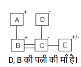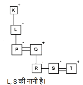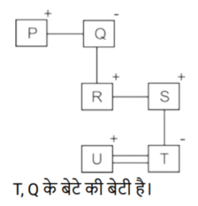 रक्त सम्बन्ध (भाग-II)Total Questions: 5041. एक निश्चित कूट भाषा में, A + B का अर्थहै 'A, B की मां है' A − B का अर्थ है 'A, B का भाई है' A × B का अर्थ है 'A, B की पत्नी है' A ÷ B का अर्थ है 'A, B का पिता है' [SSC CPO 29/06/2024 (2nd Shift)]उपर्युक्त के आधार पर, यदि ‘P − Q + R − S ÷ T × U’ है, तो T का Q से क्या संबंध है ?(a) बहन(b) पोती(c) नातिन(d) सालीCorrect Answer: (b) पोतीSolution:42. एक निश्चित कूट भाषा में, 'A × B' का अर्थ है कि 'A, B का पुत्र है', 'A – B' का अर्थ है कि 'A, B का भाई है', 'A + B' का अर्थ है कि 'A, B की पत्नी है', 'A % B' का अर्थ है कि 'A, B का पिता है'। [SSC CPO 29/06/2024 (2nd Shift)]यदि 'M + N – P × S % T' है तो M का T से क्या संबंध है ?(a) चाचा की पुत्रवधू(b) भाभी(c) मामा की पुत्री(d) सालीCorrect Answer: (b) भाभीSolution:43. एक निश्चित कूट भाषा में, 'A × B' का अर्थ है कि 'A, B का पुत्र है', 'A – B' का अर्थ है कि 'A, B का भाई है', 'A + B' का अर्थ है कि 'A, B की पत्नी है', 'A % B' का अर्थ है कि 'A, B का पिता है'। [SSC CPO 29/06/2024 (3rd Shift)]यदि 'M × N % P – S + T' है तो M का T से क्या संबंध है ?(a) भाभी का नाना(b) पत्नी का नाना(c) ससुर का मामा(d) सालाCorrect Answer: (d) सालाSolution:44. एक निश्चित कूट भाषा में, ‘X + Y’ का अर्थ है ‘X, Y की माँ है’, ‘X * Y’ का अर्थ है ‘X, Y का पिता हैं’, ‘X − Y’ का अर्थ है ‘X, Y’ की बेटी है’, ‘X % Y’ का अर्थ है ‘X, Y की पत्नी है’। [Matriculation Level 20/06/2024 (Shift - 4)]उपर्युक्त के आधार पर, यदि ‘A − B * C + D’ है, तो A, D से किस प्रकार संबंधित है?(a) बेटी(b) मौसी(c) माँ(d) नानीCorrect Answer: (b) मौसीSolution:45. एक निश्चित कूट भाषा में, ‘A + B’ का अर्थ है ‘A , B की माँ है’, ‘A – B’ का अर्थ है ‘A, B का भाई है’, ‘A × B’ का अर्थ है ‘A, B की पत्नी है’ और ‘A ÷ B’ का अर्थ है ‘A, B का पिता है’। [Matriculation Level 20/06/2024 (Shift - 4)]यदि A + B ÷ C × D - E है, तो C का E से क्या संबंध है?(a) भाई की पत्नी(b) बहन(c) बहन का पति(d) माँCorrect Answer: (a) भाई की पत्नीSolution:46. एक निश्चित कूट भाषा में, R + T का अर्थ है कि 'R, T की बहन है'। R – T का अर्थ है कि 'R, T का पिता है'। R * T का अर्थ है कि 'R, T की पत्नी है'। R ÷ T का अर्थ है कि 'R, T की माता है'। [Matriculation Level 20/06/2024 (Shift - 1)]उपरोक्त के आधार पर, यदि 'K – L ÷ P * Q – R + S * T' है, तो L का S से क्या संबंध है?(a) बहन(b) माता(c) नानी(d) पत्नीCorrect Answer: (c) नानीSolution:47. 'X # Y' का अर्थ है कि 'X, Y की पत्नी है', 'X $ Y' का अर्थ है कि 'X, Y की पुत्री है', 'X @Y' का अर्थ है कि 'X, Y का भाई है, 'X & Y' का अर्थ है कि 'X, Y का पिता है', 'X ✕ Y' का अर्थ है कि 'X,Y की बहन है।' [Matriculation Level 21/06/2024 (Shift - 4)]यदि ' I @ H $ F # D & L # K @ O है', तो। का L से क्या संबंध है?(a) चाचा(b) भाई(c) बहन(d) भांजा/भतीजाCorrect Answer: (b) भाईSolution:48. 'P × Q' का अर्थ है कि 'P, Q का भाई है', 'P - Q' का अर्थ है कि 'P, Q की पत्नी है', 'P + Q' का अर्थ है कि 'P, Q का पिता है', 'P ÷ Q' का अर्थ है कि 'P, Q की पुत्री है' [Matriculation Level 24/06/2024 (Shift - 1)](a) दामाद(b) ससुर(c) बेटा(d) भांजा/भतीजाCorrect Answer: (a) दामादSolution:49. एक निश्चित कूट भाषा में, 'A + B' का अर्थ है 'A, B की पुत्री है', 'A - B' का अर्थ है 'A, B का पति है', 'A × B' का अर्थ है 'A, B की माँ है' और 'A ÷ B' का अर्थ है 'A, B का पिता है'। [Matriculation Level 24/06/2024 (Shift - 4)]यदि A ÷ B - C + D × E है, तो D का B से क्या संबंध है?(a) माँ(b) पत्नी(c) पत्नी की माँ(d) पुत्री का पतिCorrect Answer: (c) पत्नी की माँSolution:50. एक निश