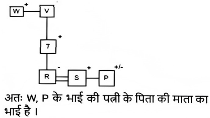 रक्त सम्बन्ध (भाग-III)Total Questions: 5011. एक निश्चित कूट भाषा में, ‘A + B’ का अर्थ है ‘A, B की पत्नी है' ‘A – B’ का अर्थ है ‘A, B की बहन है' ‘A × B’ का अर्थ है ‘A, B की माता है' ‘A ÷ B’ का अर्थ है ‘A, B की पुत्री है [Higher Secondary 25/06/2024 (Shift - 4)]उपरोक्त के आधार पर, यदि ‘O − M ÷ N + L’ है, तो O का L से क्या संबंध है?(a) पुत्री(b) बहन(c) बहू(d) माताCorrect Answer: (a) पुत्रीSolution:12. एक निश्चित कूट भाषा में, 'M & N' का अर्थ है, ‘M, N की माँ है', 'M @ N' का अर्थ है, 'M, N का पुत्र है', 'M # N' का अर्थ है, ‘M, N की पुत्री है'। [Higher Secondary 25/06/2024 (Shift - 4)]उपरोक्त के आधार पर, यदि 'K & L & M # N @ O' है, तो L, O से किस प्रकार संबंधित है?(a) पुत्री(b) पुत्र की पत्नी(c) बहन(d) भाई की पत्नीCorrect Answer: (b) पुत्र की पत्नीSolution:13. एक निश्चित कूट भाषा में, A + B का अर्थ है 'A, B की माता है' A – B का अर्थ है 'A, B का भाई है' A × B का अर्थ है 'A, B की पत्नी है' A # B का अर्थ है 'A, B का पिता है' [Graduate Level 20/06/2024 (Shift - 3)]उपर्युक्त के आधार पर, यदि ‘W – V + T # R × S – P’ है, तो W का P से क्या संबंध है ?(a) भाई की पत्नी के पिता की माता का भाई(b) पत्नी के पिता की माता का भाई(c) पत्नी के पिता की माता का पिता(d) भाई की पत्नी के पिता की माता का पिताCorrect Answer: (a) भाई की पत्नी के पिता की माता का भाईSolution:14. एक निश्चित कूट भाषा में, 'A + B' का अर्थ है कि 'A, B की माँ है', 'A − B' का अर्थ है कि 'A, B का भाई है', 'A × B' का अर्थ है कि 'A, B की पत्नी है', 'A ÷ B' का अर्थ है कि 'A, B का पिता है' [Graduate Level 20/06/2024 (Shift - 3)]यदि 'P + Q ÷ R × S − T ÷ U' है तो उपरोक्त जानकारी के आधार पर, R की पुत्री का T से क्या संबंध है?(a) भतीजी(b) भाभी(c) भतीजा(d) पिताCorrect Answer: (a) भतीजीSolution:15. एक निश्चित कूट भाषा में, A + B का अर्थ है 'A, B की माता है' A - B का अर्थ है 'A, B का भाई है' A × B का अर्थ है 'A, B की पत्नी है' A# B का अर्थ है 'A, B का पिता है' [Graduate Level 24/06/2024 (Shift - 3)]उपर्युक्त के आधार पर, यदि 'W × V #T - R + P' है, तो W का P से क्या संबंध है?(a) माता(b) बहन(c) नानी(d) मौसीCorrect Answer: (c) नानीSolution:16. R, Q का पुत्र है। M, B का भाई है, जो Q की पुत्री हैऔर P की माता है। M, R से किस प्रकार संबंधित है? [Graduate Level 24/06/2024 (Shift - 3)](a) भाई(b) पिता(c) भांजा/भतीजा(d) पतिCorrect Answer: (a) भाईSolution:17. आयुष ने नेहा से कहा, "मैं भले ही तुम्हारे पिता का बेटा हूं, लेकिन तुम मेरे भाई नहीं हो"। नेहा का आयुष से क्या संबंध है? [Graduate Level 25/06/2024 (Shift - 3)](a) पुत्री(b) सौतेली पुत्री(c) बहन(d) कजनCorrect Answer: (c) बहनSolution:18. एक निश्चित कूट भाषा में, 'A + B' का अर्थ है कि 'A, B की माँ है', 'A - B' का अर्थ है कि 'A, B का भाई है', 'A × B' का अर्थ है कि 'A, B की पत्नी है', 'A ÷ B' का अर्थ है कि 'A, B का पिता है'। [Graduate Level 26/06/2024 (Shift - 4)](a) साली(b) सास(c) साला(d) ससुरCorrect Answer: (d) ससुरSolution:19. L, Q की पत्नी है। P, M की माता है। J, L का पिता है। M, H की बहन है। J, H का पति है। P का L से क्या संबंध है? [SSC CPO 03/10/2023 (1st Shift)](a) मौसी(b) भांजा(c) नानी(d) बहनोईCorrect Answer: (c) नानीSolution:20. "M $ K" का अर्थ है कि "M, K की माता है"। "M # K" का अर्थ है कि "M, K का पिता है"। "M @ K" का अर्थ है कि "M, K का पति है"। "M % K" का अर्थ है कि "M, K की पुत्री है"। [SSC CPO 03/10/2023 (2nd Shift)]यदि A $ C @ R है, तो R का A से क्या संबंध है?(a) ससुर(b) 