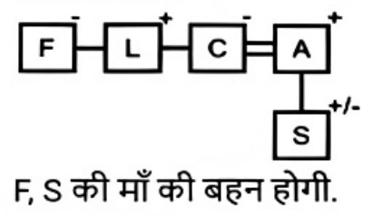 रक्त सम्बन्ध (भाग-III)Total Questions: 5041. एक निश्चित कूट भाषा में, A + B का अर्थ 'A, B का बेटा है', A - B का अर्थ 'A, B की पत्नी है', A × B का अर्थ 'A, B का भाई है', A ÷ B का अर्थ 'A, B की मां है' | [SSC CHSL 09/08/2023 (1st Shift)]उपर्युक्त के आधार पर, यदि 'P × Q ÷ R - S + T' है, तो R का T से क्या संबंध है?(a) बेटेकी पत्नी(b) बेटी(c) मां का भाई(d) भाईCorrect Answer: (a) बेटेकी पत्नीSolution:42. एक निश्चित कूट भाषा में, A & B का अर्थ है A, B की पत्नी है, A / B का अर्थ है A, B का भाई है, A × B का अर्थ है A, B की बहन है, A - B का अर्थ है कि A, B का पिता है। [SSC CHSL 09/08/2023 (2nd Shift)]उपरोक्त के आधार पर, L / M × D - K में L का K से क्या संबंध है?(a) पिता(b) माँकी बहन(c) माँ(d) पिता का भाईCorrect Answer: (d) पिता का भाईSolution:43. एक निश्चित कूट भाषा में, A + B का अर्थ 'A, B की बेटी है', A - B का अर्थ 'A, B का भाई है’, A × B का अर्थ 'A, B का बेटा है' और A ÷ B का अर्थ 'A, B का पति है'। [SSC CHSL 09/08/2023 (3rd Shift)]उपरोक्त के आधार पर, यदि ‘H ÷ O + A - M + N' है, तो M का O से क्या संबंध है?(a) पिता की पत्नी(b) पिता की मां(c) पिता की बहन(d) भाई की मांCorrect Answer: (c) पिता की बहनSolution:44. K. S की बेटी है। S की शादी G से हुई है। A, M का इकलौता पोता है। G, M का बेटा है। A की एक बेटी H है, जो S की इकलौता पोती है। K का A से क्या संबध है? [SSC CHSL 10/08/2023 (1st Shift)](a) बहन(b) मां की मां(c) बेटी(d) मां की बहनCorrect Answer: (a) बहनSolution:45. एक निश्चित कूट भाषा में, A + B का अर्थ 'A, B की पत्नी है', A − B का अर्थ 'A, B का पिता है', A × B का अर्थ 'A, B का भाई है', और A ÷ B का अर्थ 'A, B की बहन है' । [SSC CHSL 10/08/2023 (3rd Shift)]उपरोक्त के आधार पर, यदि '𝐹 ÷ 𝐿 × 𝐶 + 𝐴 − 𝑆 ‘ है, तो F, का S से क्या संबंध है ?(a) भाई की बेटी(b) मां की मां(c) मां की बहन(d) पिता की बहनCorrect Answer: (c) मां की बहनSolution:46. अपने बगल में बैठी एक महिला को देखकर गौरव ने कहा, "यह मेरी पत्नी के पति की बहन है।" महिला का गौरव से क्या संबंध है? [SSC CHSL 11/08/2023 (1st Shift)](a) बेटी(b) माँ(c) पत्नी की बहन(d) बहनCorrect Answer: (d) बहनSolution:47. P, C का बेटा है। C का विवाह D से हुआ है। D, O की बहन है। O, M की बेटी है। X, C की माँ है और W से विवाहित है। P का W से क्या संबंध है ? [SSC CHSL 11/08/2023 (3rd Shift)](a) बेटेका बेटा(b) भाई का बेटा(c) बहन का बेटा(d) बेटी का बेटाCorrect Answer: (a) बेटेका बेटाSolution:48. H, M का पिता है। M, C का भाई है। C, I की बेटी है और F से विवाहित है। D, C की बेटी है। Z, M की बेटी है। H का I से क्या संबंध है ? [SSC CHSL 11/08/2023 (4th Shift)](a) पति(b) बहन(c) भाई(d) बेटाCorrect Answer: (a) पतिSolution:49. L, H की बेटी है। H का विवाह K से हुआ है। K,। की मां है। ।, J का पिता है। J का विवाह M से हुआ है। M, N की बहन है। J का H से क्या संबंध है ? [SSC CHSL 14/08/2023 (1st Shift)](a) भाई का बेटा(b) बेटी का बेटा(c) बेटेका बेटा(d) बेटाCorrect Answer: (c) बेटेका बेटाSolution:50. F, G के पिता का पिता है। G, H से विवाहित है। H, I की मां है। J, G की बहन है। K, J का पिता है। J, L से विवाहित है, M, I का भाई है और N से विवाहित है। J का I से क्या संबंध है ? [SSC CHSL 14/08/2023 (2nd Shift)](a) पिता की बहन(b) बहन(c) पिता का भाई(d) मां की मांCorrect Answer: (a) पिता की बहनSolution:Submit Quiz« Previous12345