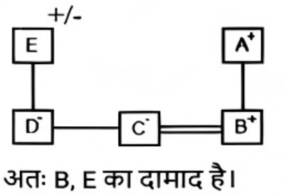 रक्त सम्बन्ध (भाग-V)Total Questions: 501. 'A # B' का अर्थ है 'A, B का भाई है'। 'A @ B' का अर्थ है 'A, B की पुत्री हैं। 'A & B' का अर्थ है 'A, B का पति है। 'A % B' का अर्थ है 'A, B की पत्नी है'। यदि Z % X # C @ V & B @ N है, तो Z , B से किस प्रकार संबंधित है? [SSC CGL Tier II (07/03/2023)](a) पुत्रवधू(b) पुत्री(c) सास(d) माताCorrect Answer: (a) पुत्रवधूSolution:2. 'A # B' का अर्थ है 'A, B का भाई है। 'A @ B' का अर्थ है 'A, B की पुत्री हैं। 'A & B' का अर्थ है 'A, B का पति है'। 'A % B' का अर्थ है 'A, B की पत्नी है'। यदि D @ N @ H & Y @ F % V है, तो Y, D से किस प्रकार संबंधित है? [SSC CGL Tier II (07/03/2023)](a) नानी(b) भांजी(c) माँ(d) पुत्री की पुत्रीCorrect Answer: (a) नानीSolution:3. A # B का अर्थ है कि 'A, B की बहन है' A @ B का अर्थ है कि 'A, B की पुत्री है' A & B का अर्थ है कि 'A, B का पति है ' A % B का अर्थ है कि 'A, B का पिता है' यदि A % B & C # D @ E है, तो B, E से किस प्रकार संबंधित है ? [SSC CGL 01/12/2022 (1st Shift)](a) भाई(b) दामाद(c) पिता(d) पुत्रCorrect Answer: (b) दामादSolution:4. A # B का अर्थ है 'A, B की बहन है'। A @ B का अर्थ है 'A, B का बेटा है। A & B का अर्थ है 'A, B के पिता है। A % B का अर्थ है 'A, B की माँ है। यदि W @ Q % T & Y @ M % K है, तो Q, K से किस प्रकार संबंधित है? [SSC CGL 02/12/2022 (1st Shift)](a) बेटी(b) दादी(c) माँ(d) नानीCorrect Answer: (b) दादीSolution:5. A + B का अर्थ है कि 'A, B के पिता हैं' A - B का अर्थ है कि 'A, B की माता हैं' A % B का अर्थ है कि 'A, B का भाई है' A & B का अर्थ है कि 'A, B का पुत्र है' यदि A + B & C - D + E है, तो A का E से क्या संबंध है? [SSC CGL 02/12/2022 (2nd Shift)](a) चाचा(b) पिता(c) भाई(d) दादाजीCorrect Answer: (d) दादाजीSolution:6. यदि A ÷ B का अर्थ है कि A, B का पिता है, A × B का अर्थ है कि A, B की माता है, A + B का अर्थ है कि A, B का भाई है, तो निम्नलिखित में से कौन सा व्यंजक यह निरूपित करता है, कि Q, P की पुत्री है? [SSC CGL 02/12/2022 (2nd Shift)](a) P ÷ Q × R(b) P ÷ Q + R(c) P × Q ÷ R(d) P + Q ÷ RCorrect Answer: (a) P ÷ Q × RSolution:7. यदि A + B का अर्थ है कि A, B का भाई है, A × B का अर्थ है कि A, B की बहन है, A ÷ B का अर्थ है कि A, B का पिता है, तो निम्नलिखित में से कौन सा व्यंजक यह निरूपित करता है, कि P, R का भाई है? [SSC CGL 02/12/2022 (3rd Shift)](a) P + Q ÷ R(b) P + Q × R(c) P × Q + R(d) Q + R × PCorrect Answer: (b) P + Q × RSolution:8. A # B का अर्थ है 'A, B की माँ है'। A @ B का अर्थ है 'A, B का बेटा है'। A & B का अर्थ है 'A, B का भाई है'। A % B का अर्थ है 'A, B की पत्नी है'। यदि W # Q @ T & Y @ M % K है, तो K, W से किस प्रकार संबंधित है? [SSC CGL 03/12/2022 (1st Shift)](a) पिता(b) ससुर(c) देवर(d) भाईCorrect Answer: (b) ससुरSolution:9. A # B का अर्थ है कि 'A, B का भाई है' A @ B का अर्थ है कि 'A, B की पुत्री है' A & B का अर्थ है कि 'A, B का पति है' A % B का अर्थ है कि 'A, B की पत्नी है' यदि G % M # L @ P & C @ B है, तो L, B से किस प्रकार संबंधित है ? [SSC CGL 03/12/2022 (2nd Shift)](a) बेटी(b) पोती / नातिन(c) बहन(d) बहूCorrect Answer: (b) पोती / नातिनSolution:10. A + B का अर्थ है कि 'A, B के पिता हैं' A – B का अर्थ है कि 'A, B की माता है' A @ B का अर्थ है कि 'A, B का पुत्र है A # B का अर्थ है कि 'A, B की पुत्री है' यदि A # B – C @ D + E है, तो A का E से क्या संबंध है? [SSC CGL 03/12/2022 (4th Shift)](a) भाभी(b) माता(c) बहन(d) पुत्रीCorrect Answer: (c) बहनSolution:Submit Quiz12345Next »