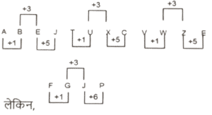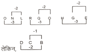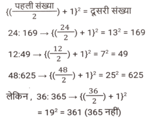 वर्गीकरण (भाग-VI)Total Questions: 5011. असंगत अक्षर-समूह का चयन करें। [SSC CGL 24/07/2023 (4th shift)](a) FGJP(b) ABEJ(c) TUXC(d) VWZECorrect Answer: (a) FGJPSolution:12. विषम संख्या - युग्म ज्ञात करें। [SSC CGL 24/07/2023 (4th shift)](a) 16 : 2(b) 100 : 5(c) 36 : 3(d) 186 : 7Correct Answer: (d) 186 : 7Solution:तर्क :- पहली संख्या दूसरी संख्या से पूर्णतः विभाजित होती है (186 : 7) को छोड़कर (16 : 2,100 : 5,36 : 3) में, पहली संख्या दूसरी संख्या से पूर्णतः विभाज्य है।13. असंगत अक्षर समूह का चयन कीजिए। [SSC CGL 25/07/2023 (1st shift)](a) ONL(b) RQO(c) HGE(d) DCBCorrect Answer: (d) DCBSolution:14. असंगत संख्या -युग्म ज्ञात कीजिए। [SSC CGL 25/07/2023 (3rd shift)](a) (21,238)(b) (17, 194)(c) (13, 150)(d) (23, 270)Correct Answer: (d) (23, 270)Solution:(पहली संख्या) × 11 + 7 = दूसरी संख्या 21 : 38 :- (21) × 11 + 7 = 231 + 7 = 238 17 : 94 :- (17) × 11 + 7 = 187 + 7 = 194 (13, 150) :- (13) × 11 + 7 = 143 + 7 = 150 लेकिन, (23, 270) :- (23) × 11 + 7 = 253 + 7 = 260 (270 नहीं)15. विकल्पों में दिए त्रिकों में से कौन- सा त्रिक समूह से संबंधित नहीं है? [SSC CGL 25/07/2023 (4th shift)](a) 24 : 25 : 5(b) 35 : 36 : 6(c) 8 : 15 : 3(d) 3 : 10 : 2Correct Answer: (b) 35 : 36 : 6Solution:तर्क:- (तीसरी संख्या)² - 1= संख्या और (तीसरी संख्या × 5) = दूसरी संख्या 24 : 25 : 5 → 5² - 1 = 24 और 5 × 5 = 25 8 : 15 : 3 → 3² - 1 = 8 और 3 × 5 = 15 3 : 10: 2 → 2² - 1 = 3 और 2 × 5 = 10 लेकिन, 35 : 36 : 6 → 6² - 1 = 35 और 6 × 5 = 30 (36 नहीं)16. असंगत संख्या-युग्म ज्ञात कीजिए। [SSC CGL 26/07/2023 (1st shift)](a) (7,252)(b) (6,216)(c) (8,392)(d) (5,80)Correct Answer: (b) (6,216)Solution:तर्क :- (पहली संख्या)³ = (दूसरी संख्या) केवल विकल्प b तर्क का अनुसरण करता है। 6 : 216 :- (6)³ = 21617. विषम संख्या-युग्म ज्ञात कीजिए। [SSC CGL 26/07/2023 (3rd shift)](a) 24 : 169(b) 12 : 49(c) 48 : 625(d) 36 : 365Correct Answer: (d) 36 : 365Solution:18. कौन-सा अक्षर-समूह, समूह से संबंधित नहीं है? [SSC CGL 26/07/2023 (4th shift)](a) OPK(b) ABY(c) LMO(d) IJQCorrect Answer: (c) LMOSolution:LMO को छोड़कर, सभी शब्द स्वरों से शुरू होते हैं, और LMO व्यंजन से शुरू होता हैं इसलिए LMO उस समूह से संबंधित नहीं है।19. असंगत संख्या-युग्म ज्ञात कीजिए । [SSC CGL 27/07/2023 (1st shift)](a) (1826, 1472)(b) (1984, 1505)(c) (1805, 1326)(d) (2136, 1657)Correct Answer: (a) (1826, 1472)Solution:(पहली संख्या - दूसरी संख्या) = 479 (1984, 1505) :- (1984 - 1505) = 479 (1805, 1326) :- (1805 - 1326) = 479 (2136, 1657):- (2136 - 1657) = 479 लेकिन, (1826, 1472) :- (1826 - 1472) = 354 (479 नहीं)20. असंगत संख्या-युग्म का चयन कीजिए । [SSC CHSL Tier II (26/06/2023)](a) (837, 948)(b) (671,782)(c) (456, 765)(d) (258, 369)Correct Answer: (c) (456, 765)Solution:तर्क :- (दूसरी संख्या) - (पहली संख्या) = 111 (837, 948) :- (948) - (837) = 111 (671, 782) :- (782 - 671) = 111 (258, 369) :- (369 - 258) = 111 लेकिन, (456, 765) :- (765 - 456) = 309Submit Quiz« Previous12345Next »
