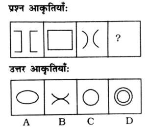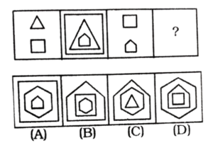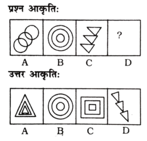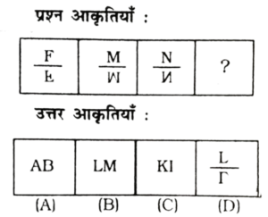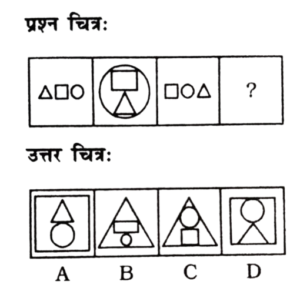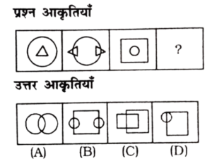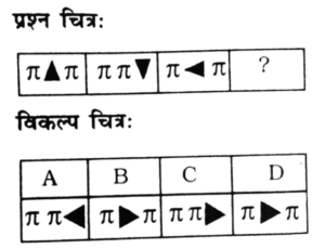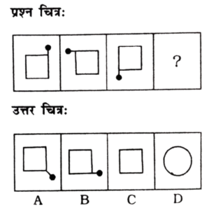 विविध : श्रृंखला (151-200 प्रश्न)Total Questions: 5021. निम्न प्रश्न चित्र श्रृंखला में '?' के स्थान पर कौन-सा विकल्प चित्र आएगा? [RRB Group 'D' CBT परीक्षा, 25.09.2018 द्वितीय पाली](1) A(2) C(3) D(4) BCorrect Answer: (2) CSolution:पहले दो आकृति में संबंध-त्रिभुज एक स्थान आगे बढ़कर विपरीत (उल्टा) हो जाता है। इसी प्रकार तीसरी आकृति का त्रिभुज एक स्थान आगे बढ़कर विपरीत (उल्टा) हो जाएगा। अतः प्रश्न चिह्न के स्थान पर विकल्प चित्र 'C' होगा।22. उस उत्तर चित्र का चयन कीजिए जो दी गई प्रश्न चित्र श्रृंखला में' के स्थान पर आएगा। [RRB Group 'D' CBT परीक्षा, 03.10.2018 द्वितीय पाली](1) A(2) B(3) D(4) CCorrect Answer: (4) CSolution:जिस प्रकार पहली आकृति से दूसरी आकृति में आने पर तीसरा चिह्न बड़ा तथा दूसरा ऊपर एवं पहला नीचे होता है। उसी प्रकार प्रश्न चिह्न के स्थान पर अंतर चित्र 'C' आएगा।23. उस उत्तर चित्र का चयन कीजिए जो दी गई प्रश्न चित्र श्रृंखला में '?' के स्थान पर आएगा। [RRB Group 'D' CBT परीक्षा, 03.10.2018 द्वितीय पाली](1) B(2) A(3) D(4) CCorrect Answer: (1) BSolution:प्रत्येक आकृति बढ़ते क्रम में घड़ी की विपरीत दिशा में 90° घुम जाता है। अतः प्रश्न चिह्न के स्थान पर आकृति 'B' आएगा।24. उपयुक्त आकृति का चयन करें, जो दी गई श्रृंखला को पूर्ण करें। [RRB Group 'D' CBT परीक्षा, 04.10.2018 द्वितीय पाली](1) B(2) C(3) A(4) DCorrect Answer: (1) BSolution:प्रश्न में दिए गए आकृति श्रृंखला के रिक्त स्थान को उत्तर आकृति का विकल्प B पूर्ण करेगा।25. उपयुक्त आकृति का चयन करें, जो खाली स्थान पर रखने से निम्न श्रृंखला पूर्ण हो जाए। [RRB Group 'D' CBT परीक्षा, 04.10.2018 द्वितीय पाली](1) C(2) B(3) D(4) ACorrect Answer: (2) BSolution:प्रश्न में दिए गए आकृति श्रृंखला में प्रारम्भिक आकृति में दोनों आकृति समाविष्ट हैं। उसी प्रकार उत्तर आकृति विकल्प B इसश्रृंखला को पूर्ण करेगी।26. दी गई श्रृंखला के लिए अगली आकृति ज्ञात करें। [RRB Group 'D' CBT परीक्षा, 04.10.2018 द्वितीय पाली](1) D(2) A(3) C(4) BCorrect Answer: (1) DSolution:प्रश्न में दी गई तीनों आकृतियाँ जल प्रतिबिम्ब के उदाहरण हैं। अतः रिक्त स्थान पर उत्तर आकृति का विकल्प D श्रृंखला को पूर्ण करेगा।27. श्रृंखला को पूर्ण करने के लिए सही विकल्प चुनें। [RRB Group 'D' CBT परीक्षा, 04.10.2018 द्वितीय पाली](1)(2)(3)(4)Correct Answer: (4)Solution:प्रश्न में दिए गए प्रारम्भिक आकृति को आपस में सही ढंग से जोड़ने पर द्वितीयक आकृति प्राप्त होती है। उसी प्रकार रिक्त स्थान पर उत्तर आकृति विकल्प 1 श्रृंखला को पूर्ण करेगा।28. दिए गए क्रम के लिए अगली आकृति ज्ञात करें। [RRB Group 'D' CBT परीक्षा, 04.10.2018 तृतीय पाली](1) D(2) A(3) B(4) CCorrect Answer: (2) ASolution:जिस प्रकार पहली आकृति के तीनों वृत्त अगली आकृति में आने पर एक के अंदर एक शिफ्ट हो रहा है उसी प्रकार प्रश्न चिन्ह के स्थान पर त्रिभुज एक के अंदर एक शिफ्ट होगा।29. श्रृंखला को पूर्ण करने के लिए उपयुक्त विकल्प चुनें। [RRB Group 'D' CBT परीक्षा, 04.10.2018 तृतीय पाली](1)(2)(3)(4)Correct Answer: (1)Solution:पहली आकृति से दूसरी आकृति में आने पर 5 चिन्हों में से तीन एक तरफ तथा 2 एक