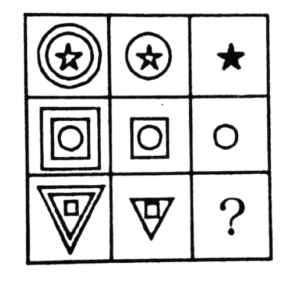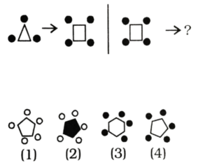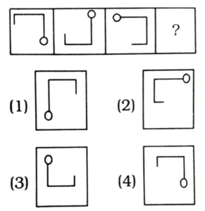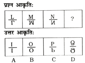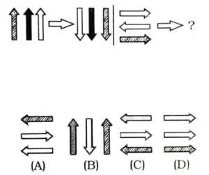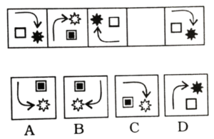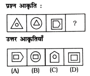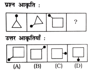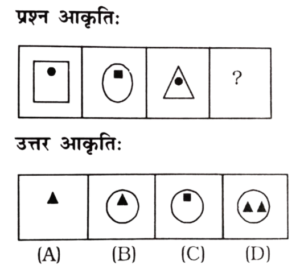 विविध : श्रृंखला (151-200 प्रश्न)Total Questions: 5031. निम्न प्रश्न चित्र श्रृंखला में '?' के स्थान पर कौन-सा उत्तर चित्र आएगा? [RRB Group 'D' CBT परीक्षा, 05.10.2018 प्रथम पाली](1) A(2) B(3) C(4) DCorrect Answer: (1) ASolution:जिस प्रकार प्रश्न के प्रश्न चित्र को प्रारम्भिक दो आकृति में जो सम्बन्ध है, उसी प्रकार प्रश्न चित्र के तृतीय आकृति व उत्तर आकृति के विकल्प A आपस में सम्बन्धित है।32. निम्न में से उस आकृति का चयन करें जो उपरोक्त चित्र श्रृंखला में '?' के स्थान पर आएगा? [RRB Group 'D' CBT परीक्षा, 05.10.2018 प्रथम पाली](1) C(2) D(3) B(4) ACorrect Answer: (2) DSolution:प्रश्न के प्रारम्भिक दो पंक्तियों में जो संक्रियाएँ सम्पन्न हो रही है उसी प्रकार तीसरे पंक्ति में रिक्त स्थान पर उत्तर आकृति के विकल्प D श्रृंखला को पूर्ण करेगा।33. निम्न श्रृंखला को कौन सी विकल्प आकृति पूर्ण करेगी? [RRB Group 'D' CBT परीक्षा, 05.10.2018 प्रथम पाली](1)(2)(3)(4)Correct Answer: (2)Solution:प्रश्न में दिए गए आकृति श्रृंखला को उत्तर आकृति के विकल्प 2 श्रृंखला के रिक्त स्थान को पूर्ण करेगा।34. निम्न प्रश्न चित्र श्रृंखला में '?' के स्थान पर कौन सा उत्तर चित्र आएगा? [RRB Group 'D' CBT परीक्षा, 05.10.2018 प्रथम पाली](1) D(2) C(3) A(4) BCorrect Answer: (3) ASolution:प्रश्न में दिए गए आकृति श्रृंखला में प्रारम्भिक दो आकृति में समानता के अनुसार तीसरे आकृति व उत्तर आकृति के विकल्प A के साथ उसी प्रकार सम्बन्ध बनाता है।35. नीचे दिए गए वैकल्पिक आकृतियों में से श्रृंखला को पूरा करने वाली आकृति का चुनाव कीजिए: [RRB Group 'D' CBT परीक्षा, 09.10.2018 तृतीय पाली](1) C(2) A(3) B(4) DCorrect Answer: (4) DSolution:प्रत्येक आकृति के बढ़ते क्रम में छायांकित त्रिभुजों की संख्या बढ़ते क्रम में है तथा बढ़ते क्रम में सितारे का त्रिभुज घड़ी की दिशा में बढ़ रहा है। अतः अगली आकृति विकल्प 'D' होगी।36. दी गई प्रश्न आकृति श्रृंखला की अगली आकृति उत्तर आकृति श्रृंखला से ज्ञात करें: [RRB Group 'D' CBT परीक्षा, 10.10.2018 द्वितीय पाली](1) B(2) C(3) D(4) ACorrect Answer: (1) BSolution:∴ प्रश्न चिह्न के स्थान पर आकृति Ο/O आएगी।37. उपरोक्त क्रम का अनुपस्थित चित्र हैः [RRB Group 'D' CBT परीक्षा, 10.10.2018 तृतीय पाली](1) B(2) A(3) D(4) CCorrect Answer: (1) BSolution:प्रश्न में रिक्त स्थान पर उत्तर आकृति के विकल्प B पूर्ण करेगा, क्योंकि प्रत्येक आकृति में अन्तर्निहित चित्रों के क्रम में परिवर्तन हो रहा है।38. वह सही चित्र जो प्रश्न चिन्ह को प्रतिस्थापित करता है, वह है: [RRB Group 'D' CBT परीक्षा, 10.10.2018 तृतीय पाली](1) 3(2) 4(3) 2(4) 1Correct Answer: (2) 4Solution:यहाँ प्रश्न आकृतियों में भुजाओं की संख्या में बढ़ोतरी हो रही है। अतः उत्तर आकृति के विकल्प D श्रृंखला को पूर्ण करेगा39. नीचे दी गई आकृतियों में से कौन-सी उपरोक्त रिक्त स्थान (?) में सही ढंग से फिट बैठती है? [RRB Group 'D' CBT परीक्षा, 11.10.2018 प्रथम पाली](1) A(2) B(3) D(4) CCorrect Answer: (1) ASolution:प्रश्न में दिए गए आकृति श्रृंखला को उत्तर आकृति विकल्प A पूर्ण करेगी।40. दी गई प्रश्न श्रृंखला की अगली आकृति का चयन उत्तर आकृति श्रृं