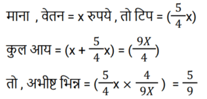 14. एक ब्यूटीशियन की आय में उसका वेतन और उसकी सेवाओं के लिए मिलने वाली युक्तियाँ शामिल होती हैं। एक विशेष सप्ताह के दौरान, यदि उसकी युक्तियाँ उसके वेतन का 5/4 थी, तो उसकी आय का कितना अंश युक्तियों से आया? [RRB NTPC 01/02/2021 (Morning)]