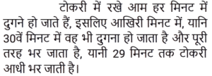 11. टोकरी में रखें आम हर एक मिनट में दोगुने हो जाते हैं। यदि टोकरी 30 मिनट में आमों से पूरी तरह से भर जाती है, तो टोकरी का आधा भाग कितने मिनट में भर जाएगा? [RRB NTPC 04/01/2021 (Morning)]