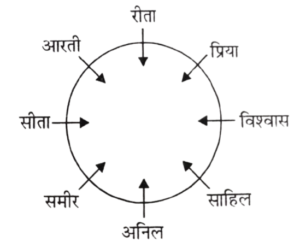 आठ मित्र - रीता, प्रिया, सीता, आरती, साहिल, समीर, विश्वास और अनिल - एक वृत्ताकार मेज के गिर्द एक-दूसरे के सामने बैठे हैं। रीता का पति रीता से सीधे मेज के पार बैठा है। प्रिया का पति एवं उसकी सबसे अच्छी मित्र, रीता उसके दोनों ओर बैठे हैं। अनिल के ठीक बाएँ तथा रीता के दाएँ तीसरे स्थान पर समीर है। रीता के ठीक दाएँ तथा समीर की पत्नी के बाएँ आरती बैठी है। केवल आरती और साहिल समूह में दो अविवाहित व्यक्ति हैं।