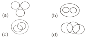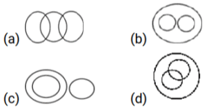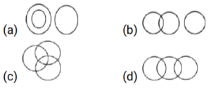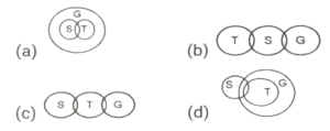 वेन आरेख (भाग-IV)Total Questions: 5031. राजा, रानियाँ और माताएँ [SSC CHSL 09/08/2021 (Afternoon)](a)(b)(c)(d)Correct Answer: (b)Solution:हम जानते हैं कि कुछ रानियां, माताएँ हो सकती हैं लेकिन कोई भी रानी या माताएँ, राजा नहीं हो सकती हैं। इसलिए विकल्प (b) सही है।32. इंजीनियर, शिक्षित व्यक्ति और पुरुष [SSC CHSL 10/08/2021 (Morning)](a)(b)(c)(d)Correct Answer: (d)Solution:जैसा कि सभी इंजीनियर, शिक्षित हैं, और शिक्षित व्यक्ति, पुरुष हो भी सकता है या नहीं भी।33. सामान्यत: ज्ञात तथ्यों की अवहेलना करते हुए कथन को पढ़ें और फिर दिए गए चार विकल्पों में से वेन आरेख की पहचान करें जो कथनों को सही ढंग से दर्शाता है। [SSC CHSL 11/08/2021 (Morning)]कथन: कुछ शर्ट(S), तौलिये(T) हैं। कुछ तौलिये(T), दस्ताने(G) हैं। (a)(b)(c)(d)Correct Answer: (c)Solution:चूंकि कुछ शर्ट(S), तौलिये(T) है और कुछ तौलिये(T), दस्ताने(G) हैं। इसलिए विकल्प (c) सही उत्तर है।34. लौकी, सब्जी, शलजम [SSC CHSL 12/08/2021 (Morning)](a)(b)(c)(d)Correct Answer: (c)Solution:35. वर्गों के उस समुच्चय का चयन करें जिसके बीच का संबंध निम्नलिखित वेन आरेख द्वारा सर्वोत्तम रूप से दर्शाया गया है। [SSC CHSL 12/08/2021 (Evening)](a) उल्लू, स्तनधारी, सरीसृप(b) स्टेशनरी, पेन, पेंसिल(c) डॉक्टर, पिता, भाई(d) मां, इंजीनियर, महिलाएंCorrect Answer: (c) डॉक्टर, पिता, भाईSolution:पिता, भाई और डॉक्टर में कुछ का रिश्ता होता है। तो, विकल्प (c) सबसे तार्किक विकल्प है।36. निम्नलिखित वेन आरेख में, ‘वृत्त’ का अर्थ ‘पत्रकार’, ‘त्रिभुज’ का अर्थ‘महिलाएँ’ तथा आयत का अर्थ‘शहरी निवासी’ है। दी गयी संख्याएँ उस विशेष श्रेणी में लोगों की संख्या को दर्शाती हैं। [SSC CPO 23/11/2020 (Morning)]कितनी पत्रकार महिलाएँ हैं लेकिन शहरी निवासी नहीं हैं ?(a) 25(b) 9(c) 18(d) 13Correct Answer: (c) 18Solution:वह संख्या जो वृत्त और त्रिभुज में उभयनिष्ठ, लेकिन आयत में नहीं, 18 है।37. निम्नलिखित वेन आरेख में, ‘वृत्त’ वकीलों के लिए है, ‘षट्भुज’ महिलाओं के लिए है तथा ‘आयत’ भोजन प्रेमियों के लिए है। दी गयी संख्या उस विशेष श्रेणी में लोगों की संख्या को दर्शाती है। [SSC CPO 24/11/2020 (Morning)]कितनी महिलाएं भोजन प्रेमी तथा वकील हैं?(a) 27(b) 12(c) 19(d) 7Correct Answer: (b) 12Solution:महिलाएं जो भोजन-प्रेमी और वकील हैं, वेवह है जो तीनों षट्भुज, वृत्त और आयत (जोकि 12 है) में उभनिष्ट है।38. निम्नलिखित वेन आरेख में, ’आयत’ ’न्यायाधीशों के लिए ’त्रिभुज’ पुरुषो के लिए, ‘षट्भुज’ गोल्फ खिलाडियों के लिए, है। दिए गए नंबर उस विशेष श्रेणी के व्यक्तियों की संख्या को दर्शाते हैं। [SSC CPO 24/11/2020 (Evening)]कुल कितने पुरुष न्यायाधीश हैं ?(a) 34(b) 22(c) 17(d) 26Correct Answer: (a) 34Solution:वे व्यक्ति जो आयत और त्रिभुज में हैं, पुरुष न्यायाधीश हैं। अत: पुरुष न्यायाधीशोंकी संख्या = 26 + 8 = 3439. लड़कियां, टेनिस खिलाड़ी, लड़के [SSC CPO 25/11/2020 (Morning)](a)(b)(c)(d)Correct Answer: (d)Solution:कुछ लड़कियां, टेनिस खिलाड़ी हो सकती हैं। इसी प्रकार कुछ लड़के, टेनिस खिलाड़ी हो सकते हैं। लेकिन लड़के, लड़कियां नहीं हो सकते। अत: विकल्प (d) सही उत्तर है।40. शिक्षक, गिटारवादक, छात्र [SSC CPO 25/