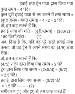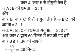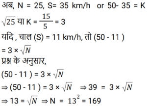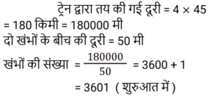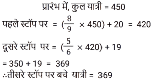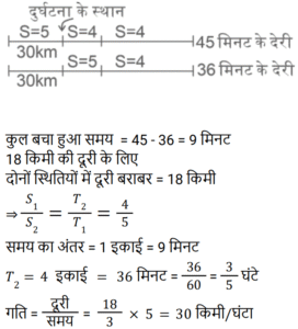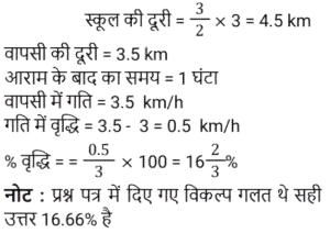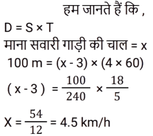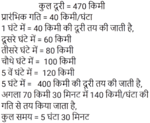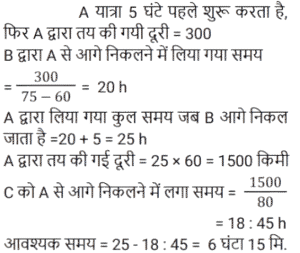 समय , चाल और दूरीTotal Questions: 5021. 450 यात्रियों के साथ एक रेलगाड़ी शुरू होती है। पहले स्टॉप पर, 1⁄9 यात्री नीचे उतर जाते हैं और 20 नए यात्री चढ़ जाते हैं। दूसरे स्टॉप पर 1⁄6 यात्री नीचे उतर जाते हैं और 19 नए यात्री सवार होते हैं। ट्रेन तीसरे स्टॉप पर कितने यात्रियों के साथ पहुँचेगी? [NTPC CBT-I 09/01/2021 (Evening)](a) 420 (b) 400 (c) 369(d) 394Correct Answer: (c) 369Solution:22. एक छात्र 3 km/h की गति से ³⁄₂ घंटे में अपनी साइकिल पर विद्यालय पहुँचता है। अपनी वापसी की यात्रा पर वह आधे घंटे के लिए आराम करता है, और उस मार्ग से जाता है जो 1 km छोटा है। उसकी साइकिल की गति में कितने प्रतिशत की वृद्धि होनी चाहिए कि वह समान समय में घर पहुँच जाए। [NTPC CBT-I 10/01/2021 (Evening)](a) 16⅔% (b) 37% (c) 35% (d) 30.5%Correct Answer: (a) 16⅔% Solution:23. कार A, कार B से दोगुनी तेज है, और कार B, कार C से तीन गुना तेज है। कार C द्वारा 60 मिनट में तय की गई दूरी को कार B द्वारा ______ में तय की जाएगी। [NTPC CBT-I 13/01/2021 (Evening)](a) 25 मिनट (b) 16 मिनट (c) 20 मिनट(d) 18 मिनटCorrect Answer: (c) 20 मिनटSolution:24. कोहरे में चल रही एक सवारी गाड़ी उसी दिशा में 3 km/h की गति से चल रहे एक व्यक्ति को पार कर गई। वह सवारी गाड़ी को 4 मिनट तक देख सकता था और यह उसे 100 m की दूरी तक दिखाई दे रही थी। गाड़ी की गति क्या थी? [NTPC CBT-I 25/01/2021 (Morning)](a) 4.5 km/h (b) 5.5 km/h (c) 5 km/h (d) 6 km/hCorrect Answer: (a) 4.5 km/h Solution:25. एक आदमी 4 घंटे में 360 km की यात्रा आंशिक रूप से हवाई और आंशिक रूप से ट्रेन से करता है। यदि उसने पूरे रास्ते हवाई यात्रा की होती, तो वह ट्रेन से की गयी यात्रा की 4⁄5 समय बचा लेता, और वह अपने गंतव्य पर 2 घंटे पहले पहुँच जाता। उसने हवाई मार्ग से कितनी दूरी तय की? [NTPC CBT-I 28/01/2021 (Morning)](a) 270 km (b) 280 km (c) 290 km (d) 260 kmCorrect Answer: (a) 270 km Solution:26. ट्रेन 4 घंटे में कितने खंभों को तय करेगी यदि ट्रेन 45 km/h की गति से चल रही है, यह देखते हुए कि रेलवे ट्रैक पर खंभे 50 m की दूरी पर हैं और ट्रेन अपनी यात्रा की शुरुआत में एक खंभे को पार करती है? [NTPC CBT-I 01/02/2021 (Evening)](a) 3606 (b) 3636 (c) 3600 (d) 3601Correct Answer: (d) 3601Solution:27. 30 किमी की यात्रा के बाद दुर्घटना के कारण एक ट्रेन सेवा बाधित हो गई। गति को मूल गति से घटाकर 4⁄5 कर दिया गया था। इस वजह से 45 मिनट की देरी हुई। अगर दुर्घटना 18 किमी आगे होती, तो 36 मिनट की देरी से चल रही होती। ट्रेन की मूल गति क्या थी? [NTPC CBT-I 02/02/2021 (Evening)](a) 30 km/h (b) 60 km/h (c) 50 km/h (d) 40 km/hCorrect Answer: (a) 30 km/h Solution:28. A, B और C सभी एक ही स्थान से अपनी यात्रा शुरू करते हैं और तीनों एक ही मार्ग का अनुसरण करते हैं। हालांकि, A 60 km/h की गति से यात्रा करता है, B 75 km/h की गति से और C 80 km/h की गति से यात्रा करता है। साथ ही, A, B के पाँच घंटे पहले यात्रा शुरू करता है। यदि यात्रा करते समय B और C दोनों एक ही समय पर A से आगे निकल जाते हैं, तो A द्वारा यात्रा शुरू करने के कितने समय बाद C ने अपनी यात्रा शुरू की? [NTPC CBT-I 10/02/2021 (Evening)](a) 6 घंटे 15 मिनट (b) 6 घंटे 30 मिनट(c) 6 घंटे 25 मिनट (d) 6 घंटे 12 मिनटCorrect Answer: (a) 6 घंटे 15 मिनट Solution:29. एक ट्रेन 40 km/h की गति से चलती है। इसकी गति हर 1 घंटे में 20 km/h बढ़ जाती है। 470 km 