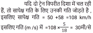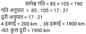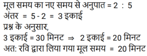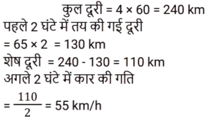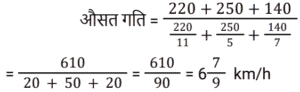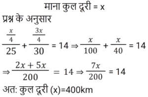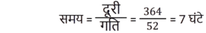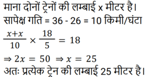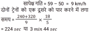 समय , चाल और दूरी Part-2Total Questions: 5021. दो रेलगाड़ियाँ, एक ही समय पर A और B से चलना शुरू करती हैं, और क्रमशः 85 km और 105 km प्रति घंटे की चाल से एक-दूसरे की ओर बढ़ती हैं। जब वे एक-दूसरे से मिलती हैं, तो यह पाया जाता है कि B से चली रेलगाड़ी ने, A से चली रेलगाड़ी की तुलना में 200 km अधिक दूरी तय की है। A और B के बीच की दूरी ज्ञात कीजिए। [Group D 19/09/2022 (Evening)](a) 1950 km (b) 2000 km(c) 1800 km (d) 1900 kmCorrect Answer: (d) 1900 kmSolution:22. 240 m और 320 m लंबी दो ट्रेनें समानांतर पटरियों पर समान दिशा में 59 km/h और 50 km/h की चाल से यात्रा कर रही हैं। दोनों रेलगाड़ियों के मिलने के क्षण से एक-दूसरे को पार करने में कितना समय लगेगा? [Group D 20/09/2022 (Afternoon)](a) 3 मिनट 44 सेकंड (b) 3 मिनट 24 सेकंड(c) 2 मिनट 18 सेकंड (d) 2 मिनट 24 सेकंडCorrect Answer: (a) 3 मिनट 44 सेकंड Solution:23. बबली ने 14 घंटे का सफर तय किया। यदि वह एक चौथाई यात्रा 25 km/h की चाल से और शेष 30 km/h की चाल से तय करती है, तो उसके द्वारा तय की गई कुल दूरी कितनी है? [Group D 22/09/2022 (Morning)](a) 140 km (b) 400 km(c) 225 km (d) 340 kmCorrect Answer: (b) 400 kmSolution:24. 64 km/h की चाल से चल रही 400 m लंबी रेलगाड़ी, 80 km/h की चाल से चल रही 720 m लंबी एक अन्य रेलगाड़ी को पार करती है। दूसरी रेलगाड़ी को, पहली रेलगाड़ी में बैठे एक आदमी को पार करने में कितना समय लगेगा? [Group D 22/09/2022 (Afternoon)](a) 18 सेकंड (b) 16 सेकंड(c) 12 सेकंड (d) 15 सेकंडCorrect Answer: (a) 18 सेकंड Solution:25. चक्रवर्ती 52 km/h की गति से कार चलाता है। 364 km की दूरी तय करने में उसे कितना समय लगेगा? [Group D 27/09/2022 (Afternoon)](a) 6 घंटे (b) 4 घंटे(c) 5 घंटे (d) 7 घंटेCorrect Answer: (d) 7 घंटेSolution:26. दो रेलगाड़ियाँ समानांतर पटरियों पर विपरीत दिशाओं में चल रही हैं। यदि उनकी चालें 50 km/h और 58 km/h हैं, तो उनकी सापेक्ष चाल ज्ञात कीजिए। [Group D 27/09/2022 (Afternoon)](a) 20 m/s (b) 40 m/s (c) 30 m/s(d) 50 m/sCorrect Answer: (c) 30 m/sSolution:27. समान लंबाई की दो रेलगाड़ियाँ 36 km/h और 26 km/h की चाल से समानांतर पटरियों पर समान दिशा में चल रही हैं। तेज रेलगाड़ी, धीमी रेलगाड़ी को 18 सेकंड में पार करती है। प्रत्येक रेलगाड़ी की लंबाई ज्ञात कीजिए। [Group D 28/09/2022 (Morning)](a) 50 मीटर (b) 25 मीटर(c) 75 मीटर (d) 70 मीटरCorrect Answer: (b) 25 मीटरSolution:28. X ने 220 km, 250 km और 140 km की दूरियाँ क्रमशः 11 km/h, 5 km/h और 7 km/h की चाल से तय कीं। उनकी औसत चाल km/h में ज्ञात कीजिए। [Group D 30/09/2022 (Morning)](a) 7 7⁄9 (b) 6 5⁄9 (c) 6 7⁄9(d) 6 2⁄9Correct Answer: (c) 6 7⁄9Solution:29. 4 घंटे की एक यात्रा के दौरान एक कार की औसत चाल 60 km/h है। यदि वह पहले 2 घंटे के दौरान 65 km/h की चाल से चलती है, तो अगले 2 घंटे के दौरान कार की चाल ज्ञात कीजिए। [Group D 30/09/2022 (Afternoon)](a) 55 km/h (b) 50 km/h(c) 53 km/h (d) 60 km/hCorrect Answer: (a) 55 km/h Solution:30. रवि शहर A से शहर B की ओर जा रहा है। यदि रवि अपनी कार को अपनी सामान्य चाल की 2⁄5 चाल से चलाता है, तो वह शहर B तक 30 मिनट की देरी से पहुँचेगा। यदि वह अपनी सामान्य चाल से कार चलाता है, तो उसे शहर A से शहर B तक पहुँचने में कितना समय (मिनट में) लगेगा? [Group D 06/10/2022 (Evening)](a) 18 (b) 22(c) 15 (d) 20Correct Answer: (d) 20Solution:Submit Quiz« Previous12345Next »