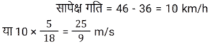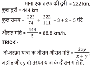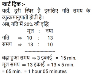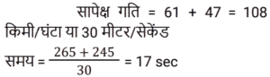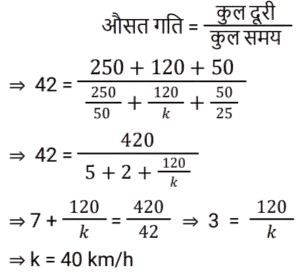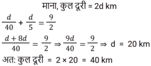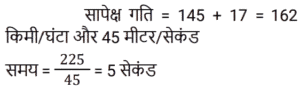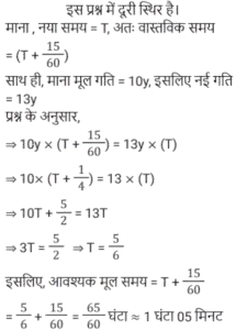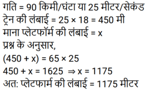 समय , चाल और दूरी Part-2Total Questions: 5031. एक व्यक्ति ने 40 km/h की चाल से एक निश्चित दूरी तय की और उसी मार्ग से 5 km/h की चाल से चलते हुए वापस लौटा। यदि इस दोतरफा यात्रा में उसे कुल 4 घंटे 30 मिनट का समय लगा, तो इस यात्रा में उसके द्वारा तय की गई कुल दूरी ज्ञात कीजिए। [Group D 06/10/2022 (Evening)](a) 25 km (b) 30 km(c) 20 km (d) 40 kmCorrect Answer: (d) 40 kmSolution:32. समान लंबाई की दो ट्रेनें समानांतर लाइनों पर समान दिशा में 46 km/h और 36 km/h की गति से चल रही हैं। तेज ट्रेन धीमी ट्रेन को 36 सेकंड में पार करती है। इन दोनों ट्रेनों की सापेक्ष गति (m/s में) है: [Group D 11/10/2022 (Afternoon)](a) 25⁄9 (b) 25⁄18(c) 25⁄8 (d) 25⁄7Correct Answer: (a) 25⁄9 Solution:33. एक प्लेटफॉर्म पर खड़े एक व्यक्ति को पार करने के लिए 54 km/h की गति से चलने वाली 450 m लंबी ट्रेन द्वारा लिया गया समय क्या है? [Level 6 (09/05/2022) Shift 1](a) 25 सेकंड (b) 32 सेकंड(c) 28 सेकंड (d) 30 सेकंडCorrect Answer: (d) 30 सेकंडSolution:34. एक व्यक्ति एक निश्चित गति से एक निश्चित दूरी तय करता है। यदि वह गति को 30% तक बढ़ाता है, तो उसे समान दूरी को तय करने में 15 मिनट कम लगते हैं। उसकी मूल गति से यात्रा करते समय दूरी तय करने में उसके द्वारा लिया गया समय ज्ञात कीजिए। [Level 6 (09/05/2022) Shift 1](a) 1 घंटा 12 मिनट (b) 1 घंटा (c) 1 घंटा 05 मिनट(d) 1 घंटा 10 मिनटCorrect Answer: (c) 1 घंटा 05 मिनटSolution:35. अवरा A से B तक 74 km/h की गति से यात्रा करती है और उसी मार्ग से 111 km/h की गति से B से A तक लौटती है। दो-तरफा यात्रा के दौरान उसकी औसत गति क्या थी? [Level 6 (09/05/2022) Shift 2](a) 92.5 km/h (b) 88.8 km/h(c) 87.5 km/h (d) 90 km/hCorrect Answer: (b) 88.8 km/hSolution:36. एक व्यक्ति क्रमशः 50 km/h, k km/h और 25 km/h की गति से 250 km, 120 km और 50 km की दूरी तय करता है। यदि पूरी यात्रा के लिए उसकी औसत गति 42 km/h है, तो k का मान क्या है? [Level 4 (10/05/2022) Shift 1](a) 45 (b) 35(c) 36 (d) 40Correct Answer: (d) 40Solution:37. एक रेलगाड़ी 57.6 km की दूरी 48 मिनट में तय करती है। इसकी चाल m/s में ज्ञात करें। [Level 5 (12/06/2022) Shift 1](a) 20 (b) 24(c) 21 (d) 18Correct Answer: (a) 20 Solution:38. 90 km/h की चाल से चल रही एक रेलगाड़ी एक बिजली के खंभे को 18 सेकंड में और एक प्लेटफॉर्म को 65 सेकंड में पार करती है। प्लेटफॉर्म की लंबाई कितनी है? [Level 5 (12/06/2022) Shift 1](a) 1175 m (b) 1250 m(c) 1050 m (d) 1020 mCorrect Answer: (a) 1175 m Solution:39. 225 मीटर लंबी एक ट्रेन 145 किमी/घंटा की गति से चल रही है। ट्रेन के विपरीत दिशा में 17 किमी/घंटा की गति से चलने वाले इंजन से चलने वाले व्यक्ति को वह कितने समय (सेकंड में) में पार करेगा? [Level 2 (13/06/2022) Shift 1](a) 4 (b) 5(c) 6 (d) 7Correct Answer: (b) 5Solution:40. एक 265 मीटर लंबी ट्रेन 61 किमी/घंटा की गति से चल रही है। विपरीत दिशाओं में 47 किमी/घंटा की गति से चल रही 245 मीटर लंबी दूसरी ट्रेन को वह कितने समय (सेकंड में) पार करेगी? [Level 2 (13/06/2022) Shift 1](a) 17 (b) 15(c) 19 (d) 14Correct Answer: (a) 17 Solution:Submit Quiz« Previous12345Next »