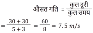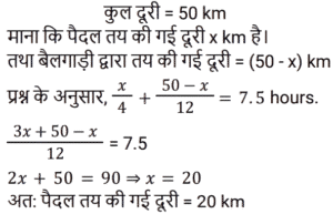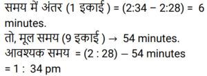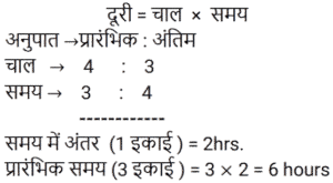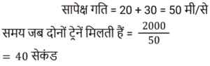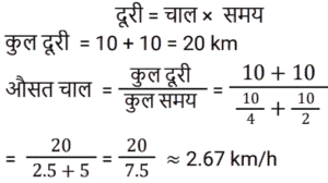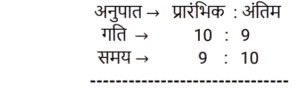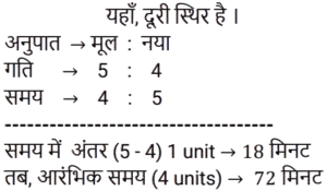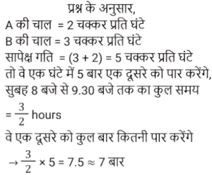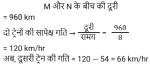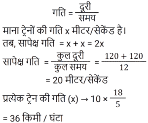 समय , चाल और दूरी Part-6Total Questions: 551. एक ठेला पहले 10 किमी की दूरी 4 किमी/घंटा की चाल से तय करता है और दूसरे 10 किमी की दूरी 2 किमी/घंटा की चाल से तय करता है। उस ठेले की औसत चाल किमी/घंटा में ज्ञात करें। [RRB JE 27/06/2019 (Morning)](a) 2.67 किमी/घंटा(b) 3.33 किमी/घंटा(c) 2 किमी/घंटा(d) 5.54 किमी/घंटाCorrect Answer: (a) 2.67 किमी/घंटाSolution:2. A और B एक वृत्ताकार मार्ग पर विपरीत दिशाओं में क्रमशः 2 चक्कर प्रति घंटे और 3 चक्कर प्रति घंटे की चाल से चलते हैं। यदि वे एक साथ समान बिंदु से सुबह 8 बजे चलना शुरू करते हैं, सुबह के 9:30 बजे तक वे एक-दूसरे को कितनी बार पार करेंगे? [RRB JE 27/06/2019 (Evening)](a) 6(b) 7(c) 4(d) 5Correct Answer: (b) 7Solution:3. यदि चाल, सामान्य चाल से 25% कम हो जाती है, तो एक यात्रा करने में 2 घंटे अधिक समय लगता है। यदि यात्रा सामान्य चाल से की जाती है, तो लगने वाला समय ज्ञात करें। [RRB JE 27/06/2019 (Evening)](a) 5.5 घंटे(b) 4.5 घंटे(c) 6 घंटे(d) 5 घंटेCorrect Answer: (c) 6 घंटेSolution:4. दो रेलगाड़ियाँ समान चाल से विपरीत दिशाओं में चल रही हैं। यदि प्रत्येक रेलगाड़ी की लंबाई 120 मीटर है, और वे एक-दूसरे को 12 सेकंड में पार करती हैं, तो प्रत्येक रेलगाड़ी की चाल ज्ञात करें। [RRB JE 28/06/2019 (Evening)](a) 18 किमी/घंटा(b) 72 किमी/घंटा(c) 36 किमी/घंटा(d) 10 किमी/घंटाCorrect Answer: (c) 36 किमी/घंटाSolution:5. दो ट्रेनें एक ही समय पर चलना शुरू करती हैं। ट्रेन A, 54 km की औसत चाल से चलते हुए शहर M से शहर N तक जाती है, जबकि ट्रेन B, शहर N से शहर M तक जाती है। दोनों शहरों के बीच की दूरी 960 km है। यदि दोनों ट्रेनें 8 घंटे बाद एक-दूसरे को पार करती हैं तो ट्रेन B की औसत चाल (km/hr में) ज्ञात कीजिए। [ALP Tier II – 21/01/2019 (Afternoon)](a) 66(b) 72(c) 60(d) 76Correct Answer: (a) 66Solution:6. इंजन में खराबी के कारण, एक एक्सप्रेस ट्रेन अपनी सामान्य चाल की 9/10 चाल से चलती है और 2 : 28 pm के बजाय 2 : 34 pm पर पहुँचती है। उसने किस समय चलना शुरू किया था? [ALP Tier II – 21/01/2019 (Afternoon)](a)1 : 40pm(b) 1: 32 pm(c)1 : 34 pm(d) 1: 36pmCorrect Answer: (c)1 : 34 pmSolution:7. एक तीर्थयात्री ने 7.5 घंटे में 50 km की दूरी तय की। उसने कुछ दूरी 4 km/hr की चाल से पैदल चलकर और कुछ दूरी 12 km/hr की चाल से चल रही बैलगाड़ी पर बैठकर तय की। पैदल चलकर तय की गई दूरी ______ km है। [ALP Tier II – 21/01/2019 (Afternoon)](a) 24(b) 20(c) 30(d) 26Correct Answer: (b) 20Solution:8. यदि कोई व्यक्ति अपने घर से कार्यालय तक अपनी सामान्य गति का 80% पैदल चलकर जाता है, तो उसे कार्यालय पहुँचने में 18 मिनट की देरी होती है। उसकी सामान्य गति के साथ उसी दूरी को कवर करने के लिए उसके द्वारा लिया गया सामान्य समय क्या है? [ALP Tier II – 21/01/2019 (Evening)](a) 70 मिनट(b) 78 मिनट(c) 75 मिनट(d) 72 मिनटCorrect Answer: (d) 72 मिनटSolution:9. कोई वस्तु 5 s में 30 m की पहली दूरी तय करती है और अगली 30 m की दूरी के लिए 3 s का समय लगाती है। वस्तु की औसत गति कितनी है? [ALP Tier II – 21/01/2019 (Evening)](a) 6.5 m/s(b) 7.5 m/s(c) 9.0 m/s(d) 4.5 m/sCorrect Answer: (b) 7.5 m/sSolution:10. 2000 मीटर की दूरी पर दो ट्रेनें एक-दूसरे की ओर बढ़ने लगती हैं। पहली ट्रेन 20 m/s की गति से और दूसरी 30 m/s की गति से चलती है। कितने सेकंड के बाद वे एक-दूसरे से मिलती हैं? [ALP Tier II – 21/01/2019 (Evening)](a) 40(b) 50(c) 35(d) 45Correct Answer: (a)