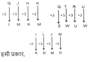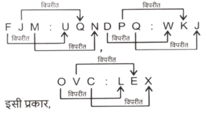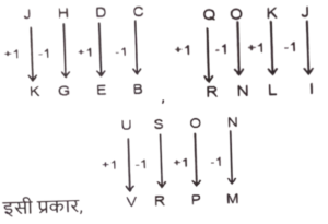 समानता (प्रश्न 301-350) भाग-VIITotal Questions: 5031. उस समुचय का चयन कीजिए जिसमें संख्याएं ठीक उसी प्रकार संबंधित हैं जिस प्रकार दिए गए समुचयों की संख्याएं संबंधित हैं। [SSC CHSL 10/07/2024 (4th Shift)](32, 35, 201)(26, 29, 165)(a) (34, 37, 203)(b) (39, 42, 256)(c) (23, 26, 147)(d) (28,31,197)Correct Answer: (a) (34, 37, 203)Solution:तर्क :- (पहली संख्या + दूसरी संख्या) × 3 = तीसरी संख्या(32, 35, 201) :- (32 + 35) × 3⇒ (67) × 3 = 201(26, 29, 165) :- (26 + 29) × 3⇒ (55) × 3 = 165इसी प्रकार,(23, 26,147) :- (23 + 26) × 3⇒ (49) × 3 = 14732. उस शब्द-युग्म का चयन कीजिए जो नीचे दिए गए शब्दों के युग्म में व्यक्त किए गए समान संबंध का सबसे अच्छा निरूपण करता है। [SSC CHSL 10/07/2024 (4th Shift)]कर्ज़ देना : उधार लेना(a) साफ : स्वच्छ(b) मौन : शांत(c) क्रूर : दयालु(d) शीत: ठंडाCorrect Answer: (c) क्रूर : दयालुSolution:जैसे 'कर्ज़ देना' और 'उधार लेना' एक दूसरे के विपरीत हैं उसी प्रकार 'क्रूर' और 'दयालु' एक दूसरे के विपरीत हैं।33. अंग्रेजी वर्णमाला क्रम के आधार पर JHDC, KGEB से एक निश्चित प्रकार से संबंधित है। उसी प्रकार, QOKJ, RNLI से संबंधित है। समान तर्क का अनुसरण करते हुए, USON निम्नलिखित में से किससे संबंधित है ? [SSC CHSL 11/07/2024 (1st Shift)](a) VRQM(b) VRPM(c) VSQM(d) VSPMCorrect Answer: (b) VRPMSolution:34. 14 का संबंध एक निश्चित तर्क से 43 से है। उसी तर्क का अनुसरण करते हुए, 17 का संबंध 52 से है। उसी तर्क का अनुसरण करते हुए, 19 का संबंध निम्नलिखित में से किससे है? [SSC CHSL 11/07/2024 (1st Shift)](a) 57(b) 38(c) 50(d) 58Correct Answer: (d) 58Solution:तर्क :- (पहली संख्या × 3) + 1 = दूसरी संख्या(14, 43) :- (14 ×3) + 1 = 43(17, 52) :- (17 × 3) + 1 = 52इसी प्रकार,(19, 58) :- (19 × 3) + 1 = 5835. अंग्रेजी वर्णमाला क्रम के आधार पर GJHK, IMKM से एक निश्चित प्रकार से संबंधित है। उसी प्रकार, QTRU, SWUW से संबंधित है। समान तर्क का अनुसरण करते हुए, ILJM निम्नलिखित में से किससे संबंधित है? [SSC CHSL 11/07/2024 (1st Shift)](a) KPNP(b) KOMO(c) KMON(d) KNMNCorrect Answer: (b) KOMOSolution:36. उस युग्म को चुनिए, जो उसी पैटर्न का अनुसरण करता है जो नीचे दिए गए युग्मों के दो समुच्चय द्वारा किया जाता है। दोनों युग्म समान पैटर्न का अनुसरण करते हैं। [SSC CHSL 11/07/2024 (2nd Shift)]FJM : UQNDPQ : WKJ(a) OVC : LEX(b) IEB : ACK(c) LHE : VUT(d) MNO : ONMCorrect Answer: (a) OVC : LEXSolution:37. एक निश्चित तर्क के अनुसार 38 का संबंध 80 से है। उसी तर्क का अनुसरण करते हुए, 42 का संबंध 88 से है। उसी तर्क का अनुसरण करते हुए, 29 का संबंध निम्नलिखित में से किससे है ? [SSC CHSL 11/07/2024 (2nd Shift)](a) 62(b) 78(c) 66(d) 54Correct Answer: (a) 62Solution:तर्क :- (पहली संख्या × 2) + 4 = दूसरी संख्या(38, 80) :- (38 × 2) +4 ⇒ (76) + 4 = 80(42, 88) :- (42 × 2) + 4 ⇒ (84) + 4 = 88इसी प्रकार,(29, 62) :- (29 × 2) +4 ⇒ (58) + 4 = 6238. उस समुचय का चयन कीजिए जिसमें संख्याएं ठीक उसी प्रकार संबंधित हैं जिस प्रकार दिए गए समुचयों की संख्याएं संबंधित हैं। [SSC CHSL 11/07/2024 (2nd Shift)](81, 53, 70)(94, 66, 83)(a) (86, 58, 65)(b) (77, 59, 76)(c) (68, 40, 67)(d) (99, 71, 88)Correct Answer: (d) (99, 71, 88)Solution:तर्क:- (पहली संख्या - 28) = दूसरी संख्या, (दूसरी संख्या + 17) = तीसरी संख्या(81, 53, 70) :- (81 - 28)) = 53(53 + 17) = 70(94, 66, 83) :- (94 - 28)) = 66(66 + 17) = 83इसी प्रकार,(99, 71, 88) :- (99 - 28)) = 71 ,(71 + 17) = 8839. उस समुचय का चयन कीजिए जिसमें संख्याएं ठीक उसी प्रकार संबंधित हैं जिस प्रकार दिए गए समुचयों की संख्याएं संबंधित हैं। [SSC CHSL 11/07/2024 (3rd Shift)](25, 8, 11)(28, 8, 12)(a) (42, 6, 21)(b) (22, 13, 