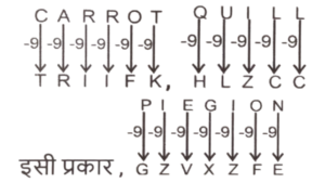 समानता (प्रश्न 501-550) भाग-XITotal Questions: 5021. एक निश्चित तर्क के अनुसार 11, 1210 से संबंधित है। समान तर्क के अनुसार, 13, 1690 से संबंधित है। समान तर्क का प्रयोग करते हुए 17 निम्नलिखित में से किससे संबंधित है? [SSC CHSL 14/08/2023 (3rd Shift)](a) 2690(b) 2990(c) 2790(d) 2890Correct Answer: (d) 2890Solution:तर्क : (पहली 11041)² × 10 = दूसरी संख्या11 - 1210 → 11² × 10 ⇒ 121 × 10 = 121013 - 1690 → 13² × 10 ⇒ 169 × 10 = 1690इसी प्रकार,17 - ? 17² × 10 ⇒ 289 × 10 = 289022. उस समुच्चय को चुनिए जिसमें संख्याएँ ठीक उसी प्रकार संबंधित हैं जिस प्रकार निम्नलिखित समुच्चयों की संख्याएँ संबंधित हैं। [SSC CHSL 14/08/2023 (4th Shift)]13 - 15 - 7 और 9 - 11 - 5(a) 16 - 24 - 10(b) 15 - 18 - 9(c) 26 - 37 - 15(d) 22 - 45 - 21Correct Answer: (a) 16 - 24 - 10Solution:तर्कः (पहली संख्या + दूसरी संख्या) ÷ 4 = तीसरी संख्या(13+15) ÷ 4 = 7 ⇒ (9 + 11) ÷ 4 = 5इसी प्रकार(16 + 24) ÷ 4 = 1023. उस विकल्प को चुनिए जो पांचवे पद से ठीक उसी प्रकार संबंधित है जिस प्रकार दूसरा पद पहले पद से संबंधित है और चोथा पद तीसरे पद से संबंधित है। [SSC CHSL 14/08/2023 (4th Shift)]20 : 1200 :: 28 : 2352 :: 50 : ?(a) 7250(b) 7500(c) 7000(d) 7550Correct Answer: (b) 7500Solution:तर्क :- (पहली संख्या)² × 3 = दूसरी संख्या(20)² × 3 = 400 × 3 = 1200(28)² × 3 = 784 × 3 = 2352इसी प्रकार(50)² × 3 = 2500 × 3 = 750024. निम्नलिखित संख्या-युग्मों में, पहली संख्या पर कुछ गणितीय संक्रियाएँ करके दूसरी संख्या प्राप्त की जाती है। उस विकल्प को चुनिए जिसमें संख्याएँ ठीक उसी प्रकार संबंधित हैं जिस प्रकार निम्नलिखित युग्मों की संख्याएँ संबंधित हैं। [SSC CHSL 17/08/2023 (1st Shift)]8,10814, 186(a) 5, 73(b) 11, 147(c) 16, 204(d) 9, 107Correct Answer: (b) 11, 147Solution:तर्क : - (पहली संख्या) × 13) + 4 = दूसरी संख्या8, 108 → (8 × 13) + 4 ⇒ 104 + 4 = 1084, 186 → (14 × 13) + 4 ⇒ 182 + 4 = 186इसी प्रकार,11, 147 → (11 × 13) + 4 ⇒ 143 + 4 = 14725. एक निश्चित तर्क के अनुसार 23, 34 से संबंधित है। समान तर्क के अनुसार, 84, 95 से संबंधित है। समान तर्क का प्रयोग करते हुए 59 निम्नलिखित में से किससे संबंधित है? [SSC CHSL 17/08/2023 (2nd Shift)](a) 74(b) 68(c) 70(d) 64Correct Answer: (c) 70Solution:तर्कः पहली संख्या + 11 = दूसरी संख्या23 + 11 = 3484 + 11 = 95इसी प्रकार,59 + 11 = 7026. उस शब्द-युग्म का चयन कीजिए जो नीचे दिए गए शब्दों के युग्म में व्यक्त किए गए समान संबंध का सबसे अच्छा निरूपण करता है। [SSC CHSL 17/08/2023 (2nd Shift)]कड़वा : कसैला(a) चकित होना : आश्चर्य होना(b) अंकीकरण : विषयांतर(c) सेब का आसव : चलचित्र(d) उल्लेख करना : पक्षाभCorrect Answer: (a) चकित होना : आश्चर्य होनाSolution:कड़वा और कसैला एक दूसरे के पर्यायवाची हैं। इसी प्रकार चकित होना और आश्चर्य होना एक दूसरे के समान हैं।27. उस समुच्चय को चुनिए जिसमें संख्याएँ ठीक उसी प्रकार संबंधित है जिस प्रकार निम्नलिखित समुच्चयों की संख्याएँ संबंधित हैं। [SSC CHSL 17/08/2023 (3rd Shift)](122, 136, 24)(222, 248, 36)(a) (301, 367, 78)(b) (189, 213, 32)(c) (145, 244, 89)(d) (212, 258, 56)Correct Answer: (d) (212, 258, 56)Solution:तर्कः (पहली संख्या + तीसरी संख्या) - 10 = दूसरी संख्या(122 + 24) - 10 = 146 - 10 = 136(222 + 36) - 10 = 258 - 10 = 248इसी प्रकार( 212 + 56) - 10 = 268 - 10 = 25828. अंग्रेजी वर्णमाला क्रम के आधार पर CARROT, TRIIFK से एक निश्चित प्रकार से संबंधित है। उसी प्रकार QUILL, HLZCC से संबंधित है। समान तर्क का अनुसरण करते हुए, PIEGION निम्नलिखित में से किससे संबंधित है? [SSC CHSL 17/0
