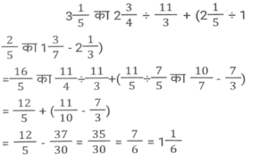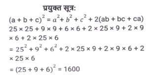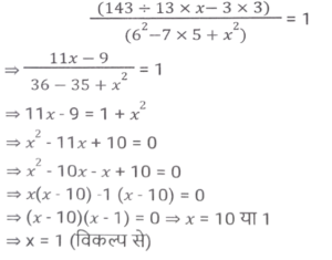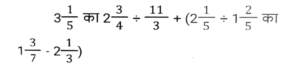 सरलीकरण (भाग-II)Total Questions: 5021. इसका मान क्या है। [SSC CHSL 10/07/2024 (3rd Shift) ][3³{(40 × 5) + (7 × 6)} ÷ 11] + (2³ × 15 ÷ 24)(a) 559(b) 595(c) 599(d) 959Correct Answer: (c) 599Solution:22. यदि'÷' का अर्थ'×', '×' का अर्थ '÷', '+' का अर्थ '-', '-' का अर्थ '+' है, तो 47 ÷ (10 × 5) + (4 - 5) - 6 का मान ज्ञात कीजिए। [SSC CHSL 10/07/2024 (4th Shift)](a) 100(b) 59(c) 79(d) 91Correct Answer: (d) 91Solution:दिया गया व्यंजक :-47 ÷ (10 × 5) + (4 - 5) - 6निर्देशों के अनुसार चिन्हों को बदलने पर ;47 × (10 ÷ 5) - (4 + 5) + 6= 47 × 2 - 9 + 6 = 94 - 3 = 9123. इसका मान क्या है। [SSC CHSL 11/07/2024 (1st Shift) ](a) 1(b) 0(c) 3(d) 2Correct Answer: (a) 1Solution:24. इसका मान ज्ञात कीजिए। [SSC CPO 27/06/2024 (1st Shift)] (a)(b)(c)(d)Correct Answer: (d)Solution:25. इसका मान ज्ञात कीजिए। [SSC CPO 27/06/2024 (1st Shift)][18 - 3 × {3 - 3 × (3 ÷ 1/3 - 3) + 3 ÷1/3 + 3} - 4 × 2](a) 18(b) 19(c) 12(d) 15Correct Answer: (b) 19Solution:26. इसका मान ज्ञात कीजिए। [SSC CPO 27/06/2024 (1st Shift)]12 + 24 ÷ 2 - 7 × 30 ÷ 6 + (5 + 4) × 8 + 8 ÷ 8 - 8(a) 45(b) 85(c) 54(d) 58Correct Answer: (c) 54Solution:27. x का संभव मान क्या होगा ? [SSC CPO 27/06/2024 (1st Shift)](a) 1(b) 3(c) 2(d) 4Correct Answer: (a) 1Solution:28. इसका मान ज्ञात कीजिए। [SSC CPO 27/06/2024 (2nd Shift)](a) 5(b) 3(c) 1(d) 2Correct Answer: (b) 3Solution:29. निम्नलिखित व्यंजक को सरल कीजिए: [SSC CPO 27/06/2024 (2nd Shift)]25 × 25 + 9 × 9 + 6 × 6 + 2 × 25 × 9 + 2 × 9 × 6 + 2 × 25 × 6(a) 900(b) 1200(c) 1600(d) 2500Correct Answer: (c) 1600Solution:30. इसका मान कितना होगा ? [SSC CPO 27/06/2024 (2nd Shift)](a) 2(b) 0(c) 1(d) -1Correct Answer: (b) 0Solution:Submit Quiz« Previous12345Next »