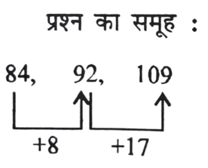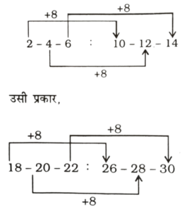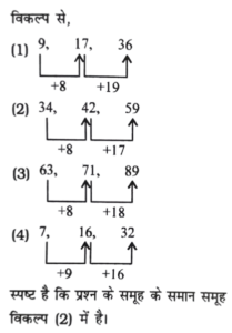 सादृश्यता या समसंबंध Type-III (प्रश्न 1-4)Total Questions: 41. नीचे दिये संख्या समूह के समान चार विकल्पों में से वही विकल्प छाँटिए: [आरआरबी सिकंदराबाद गुड्स गार्ड परीक्षा 15.07.2001]दिया हुआ संख्या समूह : 84, 92, 109(1) 9, 17, 36(2) 34, 42, 59(3) 63, 71, 89(4) 7, 16, 32Correct Answer: (2) 34, 42, 59Solution:2. दिए गए समुच्चय (23, 29, 31) के सर्वाधिक सदृश समुच्चय का चयन विकल्प से करें। [आरआरबी भुवनेश्वर सहायक स्टेशन मास्टर परीक्षा 30.08.2009](1) (17, 21, 29)(2) (31, 37, 49)(3) (13, 15, 23)(4) (41, 43, 47)Correct Answer: (4) (41, 43, 47)Solution:सतत् अभाज्य संख्याओं का समुच्चय3. (2, 14, 16), (3, 21, 24), (8, 56, 64), (5, 35, 41) [RRB सहायक लोको पायलट एवं तकनीशियन (CBT) परीक्षा 10.08.2018 द्वितीय पाली]ऐसा सेट जो किसी समूह से संबंध नहीं रखता है, वह है :(1) (5, 35, 41)(2) (2, 14, 16)(3) (3, 21, 24)(4) (8, 56, 64)Correct Answer: (1) (5, 35, 41)Solution:(2, 14, 16)=> 2 x 7 = 14; 2 x 8 = 16(3, 21, 24)=> 3 x 7 = 21; 3 x 8 = 24(8, 56, 64)=> 8 x 7 = 56; 8 x 8 = 64परंतु,(5, 35, 41)=> 5 x 7 = 355 x 8 + 1 = 414. उस युग्म को चुनें जो नीचे दिए गए युग्म के समान संबंध को दर्शाता है। [RRB Junior Engineer परीक्षा, 31.05.2019 (द्वितीय पाली)]2 - 4 - 6 : 10 - 12 - 14(1) 18-20-2226-28-30(2) 13-14-15:18-19-20(3) 31-33-35:37-39-41(4) 3-4-5:6-7-8Correct Answer: (1) 18-20-2226-28-30Solution:Submit Quiz