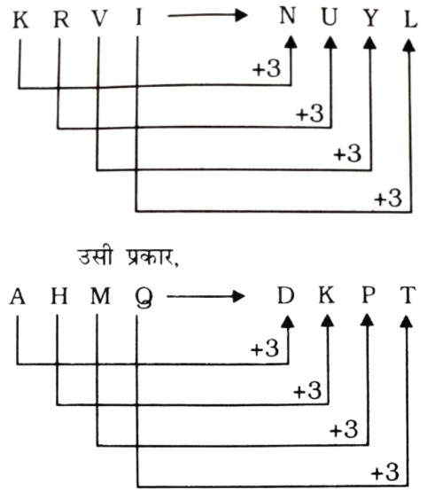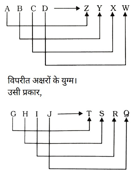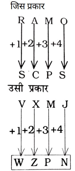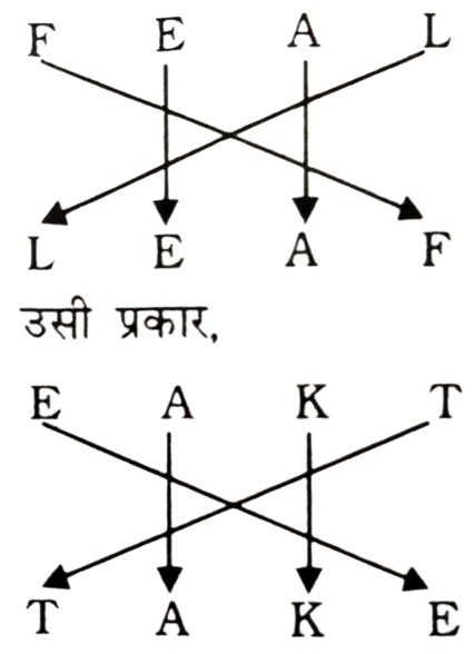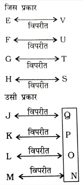 सादृश्यता या समसंबंध Type-IV (प्रश्न 101-128)Total Questions: 2821. उस विकल्प का चयन करें, जिसका तीसरे अक्षर-समूह के साथ वही संबंध है, जो दूसरे अक्षर-समूह का पहले अक्षर-समूह से है। [RRB NTPC CBT-I परीक्षा, 30.12.2020 (प्रथम पाली)]ABCD : ZYXW : : GHIJ : ?(1) TSRQ(2) PQRS(3) MLKJ(4) LMNOCorrect Answer: (1) TSRQSolution:22. उस विकल्प का चयन करें, जिसका तीसरे अक्षर-समूह के साथ वही संबंध है, जो दूसरे अक्षर-समूह का पहले अक्षर समूह से है। [RRB NTPC CBT-I परीक्षा, 30.12.2020 (प्रथम पाली)]AEJ : ZVQ : : BFK : ?(1) YUP(2) CGK(3) LPT(4) TPLCorrect Answer: (1) YUPSolution:23. उस विकल्प का चयन करें जो तीसरे पद से उसी प्रकार से संबंधित है जिस प्रकार दूसरा पद, पहले पद से संबंधित है। [RRB NTPC CBT-I परीक्षा, 23.01.2021 (प्रथम पाली)]RAW : WAR : : STAR : ?(1) ARTS(2) MOON(3) RATS(4) STARTCorrect Answer: (3) RATSSolution:24. उस विकल्प का चयन करें जो तीसरे पद से उसी प्रकार से संबंधित है जिस प्रकार दूसरा पद, पहले पद से संबंधित है। [RRB NTPC CBT-I परीक्षा, 23.01.2021 (प्रथम पाली)]FEAL : LEAF : : EAKT : ?(1) ETAK(2) KETA(3) KATE(4) TAKECorrect Answer: (4) TAKESolution:25. उस विकल्प का चयन करें, जिसका तीसरे पद के साथ वही संबंध है, जो दूसरे पद का पहले पद से है। [RRB NTPC CBT-I परीक्षा, 27.01.2021 (द्वितीय पाली)]KRVI : NUYL : : AHMQ : ?(1) DKPT(2) FSCY(3) BJLV(4) WSMTCorrect Answer: (1) DKPTSolution:26. उस विकल्प का चयन कीजिए, जिसका तीसरे अक्षर-समूह के साथ वही संबंध है, जो दूसरे अक्षर-समूह का पहले अक्षर समूह से है। [RRB NTPC CBT-I परीक्षा, 14.03.2021 (द्वितीय पाली)]RAM : PBO : : SPQ : ?(1) QQR(2) QQT(3) QPS(4) QQSCorrect Answer: (4) QQSSolution:27. उस विकल्प का चयन करें, जिसका तीसरे अक्षर-समूह के साथ वही संबंध है, जो दूसरे अक्षर-समूह का पहले अक्षर-समूह से है। [RRB NTPC CBT-I परीक्षा, 28.12.2020 (प्रथम पाली)]RAMO : SCPS : : VXMJ : ?(1) WQZN(2) WQPN(3) WZPN(4) WPZNCorrect Answer: (3) WZPNSolution:28. उस विकल्प का चयन कीजिए, जो कि तीसरे पद से उसी तरह संबंधित है जिस तरह दूसरा पद पहले पद से संबंधित है। [RRB NTPC CBT-I परीक्षा, 09.01.2021 (प्रथम पाली)]EFGH : VUTS : : JKLM : ?(1) QPNO(2) QNPO(3) QOPN(4) QPONCorrect Answer: (4) QPONSolution:Submit Quiz« Previous123