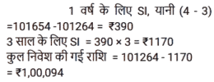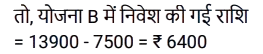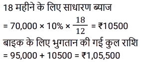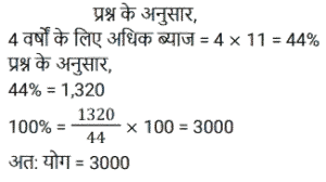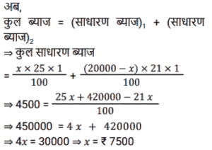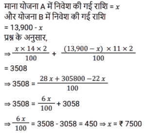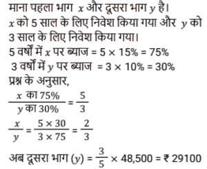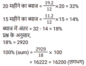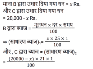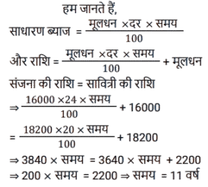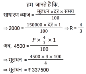 साधारण ब्याज (SSC) (Part-II)Total Questions: 5041. एक व्यक्ति ने साधारण ब्याज पर कुछ धनराशि बैंक में जमा की। 20 वर्षों के बाद, धनराशि जमा की गई धनराशि से नौ गुना हो गई। यदि ब्याज दर समान रहे तो कितने वर्षों में धनराशि 13 गुना हो जाएगी? [SSC CPO 27/06/2024 (3rd Shift)](a) 30(b) 25(c) 28(d) 23Correct Answer: (a) 30Solution:42. एक निश्चित धनराशि 4 वर्षों के लिए एक निश्चित साधारण ब्याज दर पर दी जाती है। यदि इसे समान समय के लिए 11% अधिक दर पर दिया जाता, तो ₹ 1,320 अधिक प्राप्त होते। धनराशि (₹ में) ज्ञात कीजिए। [SSC CPO 28/06/2024 (2nd Shift)](a) 2500(b) 3000(c) 4580(d) 3240Correct Answer: (b) 3000Solution:43. ₹48,500 का एक हिस्सा 15% प्रति वर्ष के साधारण ब्याज पर निवेश किया जाता है। पहले निवेश के 2 वर्ष बाद, शेष धनराशि 10% वार्षिक साधारण ब्याज की दर से निवेश की जाती है। पहली धनराशि के निवेश के समय से 5 वर्ष बाद, ब्याज का अनुपात 5 : 3 है। 10% साधारण ब्याज की दर पर निवेश किया गया दूसरा हिस्सा (₹ में) कितना है ? [SSC CPO 29/06/2024 (1st Shift)](a) 20,940(b) 29,100(c) 24,900(d) 19,400Correct Answer: (b) 29,100Solution:44. यदि एक निश्चित धनराशि पर 20 महीने के लिए 19.2% की वार्षिक दर से प्राप्त साधारण ब्याज, उसी राशि पर 15 महीने के लिए 11.2% की वार्षिक दर से प्राप्त साधारण ब्याज से ₹2,920 अधिक है, तो धनराशि (₹ में, निकटतम सैकड़े तक पूर्णांकित) कितनी है? [SSC CPO 29/06/2024 (2nd Shift)](a) 16,620(c) 16,200(c) 16,200(d) 16,660Correct Answer: (c) 16,200Solution:45. रोहन एक बाइक खरीदता है जिसकी कीमत ₹95,000 है। वह एक बार में ₹25,000 का भुगतान करता है और शेष 18 महीने के बाद, जिस पर उसे 10% की वार्षिक दर से साधारण ब्याज लगाया जाता है। उसके द्वारा बाइक के लिए भुगतान की गई कुल राशि (₹ में) क्या है ? [Matriculation Level 20/06/2024 (Shift-1)](a) 1,23,200(b) 1,02,320(c) 1,03,500(d) 1,05,500Correct Answer: (d) 1,05,500Solution:46. संजना 24% के वार्षिक साधारण ब्याज पर ₹16,000 उधार लेती है और सावित्री 20% के वार्षिक साधारण ब्याज पर ₹18,200 उधार लेती है। कितने वर्षों में उनकी ऋण राशि बराबर हो जाएगी ? [Matriculation Level 20/06/2024 (Shift-4)](a) 10(b) 11(c) 15(d) 12Correct Answer: (b) 11Solution:47. ₹1,50,000 की जमा राशि पर, R को एक वर्ष में साधारण ब्याज दर पर ब्याज के रूप में ₹2,000 मिलते हैं। तो बताइए कि ₹4,500 का ब्याज प्राप्त करने के लिए उसे कितनी राशि (₹ में) जमा करनी चाहिए ? [Matriculation Level 21/06/2024 (Shift-1)](a) 3,77,500(b) 2,77,500(c) 4,25,500(d) 3,37,500Correct Answer: (d) 3,37,500Solution:48. A, B और C से ₹20,000 उधार लेता है। B उसे 25% वार्षिक साधारण ब्याज पर एक निश्चित राशि उधार देता है, जबकि C उसे शेष राशि 21% वार्षिक साधारण ब्याज पर उधार देता है। A द्वारा एक वर्ष में प्रदत्त कुल ब्याज ₹ 4,500 है। B से उधार ली गई राशि (₹ में) कितनी है ? [Matriculation Level 21/06/2024 (Shift-1)](a) 9,000(b) 6,000(c) 7,500(d) 12,500Correct Answer: (c) 7,500Solution:49. श्रीमान गोगिया ने ₹13,900 की राशि को विभाजित करके दो अलग-अलग योजनाओं A और B में क्रमशः 14% वार्षिक और 11% वार्षिक साधारण ब्याज दर पर निवेश किया। यदि 2 वर्षों मेंअर्जित साधारण ब्याज की कुल राशि ₹3,508 है, तो योजना B में निवेश की गई राशि कितनी थी ? [Matriculation Level 21/06/2024 (Shift-1)](a) ₹7,200(b) ₹6,500(c) ₹6,400(d) ₹7,500Correct Answer: (c) ₹6,400Solution:50. साधारण ब्याज पर निवेश की गई एक राशि 3 वर्षों में ₹1