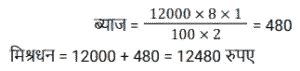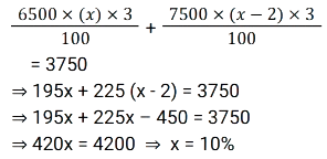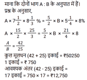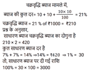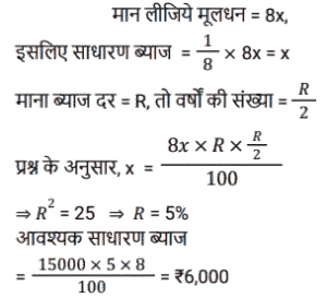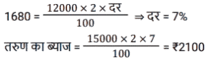 साधारण ब्याज (SSC) (Part-IV)Total Questions: 4031. एक निश्चित राशि पर 2 वर्षों के लिए 7% प्रति वर्ष की दर से साधारण ब्याज, ₹1,000 पर 2 वर्षों के लिए 10% प्रति वर्ष की दर से चक्रवृद्धि ब्याज का दोगुना है, जो वार्षिक रूप से संयोजित है। साधारण ब्याज पर दी गई राशि कितनी है? [SSC MTS 11/07/2022 (Evening)](a) ₹1,000(b) ₹2,000(c) ₹3,000(d) ₹4,000Correct Answer: (c) ₹3,000Solution:32. रिधान ने 8% साधारण ब्याज की वार्षिक दर से 12000 रुपये का ऋण लिया। 6 महीने के बाद उसे कितनी राशि का भुगतान करना होगा, यदि वह उस समय ब्याज के साथ पूरी ऋण राशि चुकाने का फैसला करता है? [SSC MTS 25/07/2022 (Morning)](a) Rs 12,580(b) Rs 12,480(c) Rs 14,690(d) Rs 13,720Correct Answer: (b) Rs 12,480Solution:33. करुण ने वरुण से ₹12,000 और तरुण से ₹15,000, प्रत्येक से दो वर्ष के लिए समान वार्षिक साधारण ब्याज की दर से उधार लिए, यदि उसने 2 वर्ष के अंत में वरुण को ₹1,680 का ब्याज दिया, तो करुण ने 2 वर्ष की अवधि के अंत में तरुण को कितना ब्याज दिया ? [SSC MTS 26/07/2022 (Morning)](a) 2050(b) 1800(c) 2100(d) 2350Correct Answer: (c) 2100Solution:34. एक निश्चित राशि पर साधारण ब्याज उस राशि का 1/8 है जब वर्षों की संख्या प्रति वर्ष दर प्रतिशत के आधे के बराबर होती है। 8 वर्षों के लिए समान साधारण ब्याज की दर से ₹15,000 पर साधारण ब्याज (₹ में) ज्ञात कीजिये। [SSC CGL 12/04/2022 (Afternoon)](a) 5,800(b) 5,000(c) 6,000(d) 5,250Correct Answer: (c) 6,000Solution:35. यदि A द्वारा 10% प्रति वर्ष की दर से तीन वर्षों के लिए ₹9,100 का निवेश करके प्राप्त की गई राशि, साधारण ब्याज पर, B द्वारा 8% प्रति वर्ष की दर से पांच साल के लिए एक निश्चित राशि का निवेश करके प्राप्त राशि के बराबर है।, तो B द्वारा निवेश की गई राशि का 90% (₹ में) है [SSC CGL Tier II (29/01/2025)](a) 8,450(b) 7,605(c) 8,540(d) 7,800Correct Answer: (b) 7,605Solution:36. ₹50,250 की राशि को दो भागों में इस प्रकार विभाजित किया जाता है कि पहले भाग पर 7½ वर्षों के लिए 8⅓% प्रति वर्ष की दर से साधारण ब्याज दूसरे भाग पर 5¼ वर्षों के लिए का 8% प्रति वर्ष की दर से साधारण ब्याज का 5/2 गुना है। दोनों भागों के बीच का अंतर (₹ में) क्या है? [SSC CGL 12/04/2022 (Afternoon)](a) 10,275(b) 12,750(c) 12,570(d) 15,270Correct Answer: (b) 12,750Solution:37. एक विक्रेता, किसी वस्तु की बिक्री को बढ़ावा देने की दृष्टि से साधारण ब्याज के सिद्धांत को लागू करता है। वह घोषणा करता है कि नकद भुगतान पर 300 वस्तु तुरंत प्राप्त किए जा सकते हैं, लेकिन एक ग्राहक को केवल 200 वस्तु ही मिलेंगे यदि वह एक वर्ष के लिए भुगतान को स्थगित करता है। कुल पर ब्याज की दर प्रतिशत क्या है ? [SSC MTS 05/10/2021 (Morning)](a) 30(b) 25(c) 50(d) 40Correct Answer: (c) 50Solution:38. एक व्यक्ति ने साधारण ब्याज पर x% प्रति वर्ष की दर से ₹6,500 की राशि का निवेश किया और (x - 2)% प्रति वर्ष साधारण ब्याज दर पर ₹7,500 की राशि निवेश की। यदि 3 वर्षों के लिए दोनों निवेशों पर अर्जित कुल ब्याज ₹3,750 है, तो ब्याज की दर है: [SSC MTS 12/10/2021 (Morning)](a) 14%(b) 10%(c) 8%(d) 12%Correct Answer: (b) 10%Solution:39. एक आदमी 1 जनवरी 2019 को अपने दोस्त से ₹6,000 का ऋण इस शर्त के साथ लेता है कि वह 6.25% की दर से अर्जित साधारण ब्याज के साथ चुकाएगा जब ब्याज ₹75 तक पहुंच जाएगा। ऋण की अवधि किस तारीख को समाप्