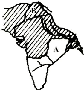 7. दिए गए मानचित्र में, छायांकित भाग एक कालावधि विशेष में अकबर के साम्राज्य को दर्शाता है, 'A' स्वतंत्र देश का परिचायक है और 'B' एक नगर की स्थिति दिखाता है, निम्नलिखित में से कौन-सा विकल्प पूरी सही जानकारी देता है? [I.A.S. (Pre) 1998]