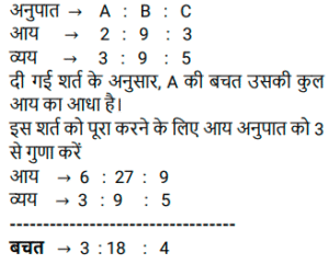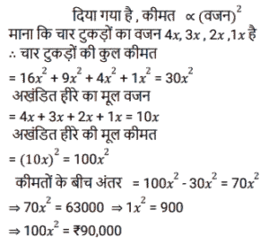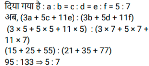 अनुपात – समानुपात (SSC) (Part-II)Total Questions: 5021. एक कंपनी में, पुरुषों और महिलाओं का अनुपात क्रमशः 5 : 3 है। जब कंपनी में 150 अतिरिक्त महिलाओं को नियोजित किया जाता है, तो अनुपात 5 : 4 हो जाता है। कंपनी में कितने पुरुष कार्यरत हैं? [SSC CGL 17/09/2024 (2nd Shift)](a) 850(b) 750(c) 550(d) 950Correct Answer: (b) 750Solution:प्रश्न के अनुसार ⇒ 1 इकाई = 150 कंपनी में पुरुष कर्मचारियों की संख्या (5 इकाई) = 5 × 150 = 75022. एक डिब्बे में y पीले कंचे और b नीले कंचे हैं। 18% पीले कंचों को 24% नीले कंचों में मिलाया गया, और योग 30 था। पीले कंचों की संख्या का तीन गुना, नीले कंचों की संख्या के दो गुने से 200 अधिक है। y² और b² का अनुपात क्या है? [SSC CGL 17/09/2024 (3rd Shift)](a) 6 : 5(b) 4 : 1(c) 2 : 1(d) 5 : 2Correct Answer: (b) 4 : 1Solution:23. 4a² और x का माध्यानुपाती 1/5a है, जहां a धनात्मक संख्या है, तो x का मान _________ है। [SSC CGL 18/09/2024 (2nd Shift)](a)(b)(c)(d)Correct Answer: (a)Solution:24. एक हीरे की कीमत उसके वजन के वर्ग के अनुक्रमानुपाती है। एक बार, यह हीरा वजन के 4 : 3 : 2 : 1 के अनुपात में चार टुकड़ों में टूट गया। जब टुकड़ों को बेचा गया, तो व्यापारी को उस हीरे के एक नग की कीमत से ₹63,000 कम मिले। हीरे की मूल कीमत ज्ञात कीजिए। [SSC CGL 19/09/2024 (1st Shift)](a) ₹86,000(b) ₹80,000(c) ₹90,000(d) ₹75,000Correct Answer: (c) ₹90,000Solution:25. एक कॉलेज में लड़कों और लड़कियों का अनुपात 5 : 6 है। यदि 40 लड़के कॉलेज छोड़ देते हैं और 50 लड़कियां कॉलेज में शामिल हो जाती हैं, तो अनुपात 8 : 11 हो जाता है। कॉलेज में लड़कियों की संख्या ज्ञात कीजिए। [SSC CGL 19/09/2024 (3rd Shift)](a) 740(b) 860(c) 720(d) 640Correct Answer: (c) 720Solution:26. 18 और A का माध्यानुपाती 30 है। A का मान ज्ञात कीजिए। [SSC CGL 23/09/2024 (1st Shift)](a) 60(b) 40(c) 45(d) 50Correct Answer: (d) 50Solution:27. P और Q का कुल वेतन ₹9,60,000 है। P और Q अपने अपने वेतन के क्रमशः 64% और 44% की बचत करते हैं। यदि P का व्यय Q के व्यय का 1.5 गुना है, तो P के वेतन और Q के वेतन का अनुपात ज्ञात करें। [SSC CGL 25/09/2024 (1st Shift)](a) 2 : 3(b) 7 : 3(c) 3 : 7(d) 3 : 2Correct Answer: (b) 7 : 3Solution:28. एक वृत्त की परिधि और व्यास का अनुपात 3 : 5 है। यदि परिधि 6 cm है, तो वृत्त की त्रिज्या ज्ञात कीजिए। [SSC CGL 25/09/2024 (3rd Shift)](a) 10 cm(b) 15 cm(c) 5 cm(d) 1.8 cmCorrect Answer: (c) 5 cmSolution:29. यदि a : b = c : d = e : f = 5 : 7 है, तो (3a + 5c + 11e) : (3b+ 5d + 11f) का अनुपात क्या है? [SSC CGL 26/09/2024 (2nd Shift)](a) 7 : 11(b) 3 : 7(c) 5 : 7(d) 11 : 7Correct Answer: (c) 5 : 7Solution:30. A, B और C की मासिक आय 2 : 9 : 3 के अनुपात में है और उनके खर्चे 3 : 9 : 5 के अनुपात में हैं। यदि A की बचत उसकी कुल आय की आधी है, तो A, B और C की बचत क्रमशः ____________ अनुपात में होगी। [SSC CGL 26/09/2024 (3rd Shift)](a) 3 : 9 : 2(b) 2 : 5 : 2(c) 3 : 18 : 4(d) 1 : 2 : 1Correct Answer: (c) 3 : 18 : 4Solution:Submit Quiz« Previous12345Next »