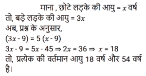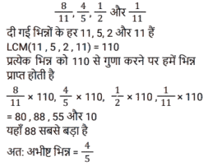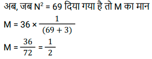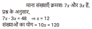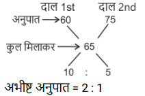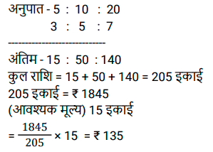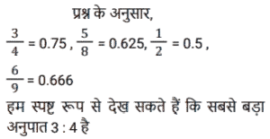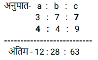 अनुपात – समानुपात (SSC) (Part-II)Total Questions: 5031. राधिका ने एक बैंक के कैशियर से अनुरोध किया कि वह उसके ₹1,845 के चेक के बदले में उसे सिक्के दे दे। कैशियर ने उसे ₹5, ₹10 और ₹20 के सिक्कों का एक पैकेट 3 : 5 : 7 के अनुपात में दिया। उसके द्वारा प्राप्त सबसे छोटे सिक्के का कुल मूल्य कितना है? [SSC CHSL 01/07/2024 (1st Shift)](a) ₹135(b) ₹125(c) ₹145(d) ₹105Correct Answer: (a) ₹135Solution:32. दो लड़कों में से बड़े की आयु छोटे की आयु की तीन गुनी है। 9 वर्ष पहले यह छोटे की आयु से पांच गुना थी। प्रत्येक की वर्तमान आयु ज्ञात कीजिए। [SSC CHSL 01/07/2024 (2nd Shift)](a) 15 वर्ष, 45 वर्ष(b) 18 वर्ष, 54 वर्ष(c) 17 वर्ष, 51 वर्ष(d) 12 वर्ष, 36 वर्षCorrect Answer: (b) 18 वर्ष, 54 वर्षSolution:33. P, Q को ₹2, ₹5 और ₹10 के सिक्कों का उपयोग करके ₹150 का भुगतान करता है। वह कुल 50 सिक्कों का उपयोग करता है। यदि उपयोग किए गए ₹2 और ₹5 के सिक्कों का अनुपात 5 : 2 है, तो भुगतान में ₹10 के कितने सिक्के उपयोग किए गए हैं? [SSC CHSL 01/07/2024 (3rd Shift)](a) 2(b) 1(c) 4(d) 5Correct Answer: (b) 1Solution:34. एक पंसारी को क्रमशः ₹60 और ₹75 प्रति किलोग्राम मूल्य वाली दो प्रकार की दालों को किस अनुपात में मिलाना चाहिए, ताकि ₹65 प्रति किलोग्राम मूल्य का मिश्रण प्राप्त हो? [SSC CHSL 01/07/2024 (3rd Shift)](a) 3 : 4(b) 2 : 1(c) 2 : 3(d) 1 : 2Correct Answer: (b) 2 : 1Solution:35. M,(N² + 3) का व्युत्क्रमानुपाती है। यदि N = 3 होने पर M = 3 होता है, तो N² = 69 होने पर M का मान क्या होगा ? [SSC CHSL 01/07/2024 (4th Shift)](a) 1(b) 1/4(c) √69(d) 1/2Correct Answer: (d) 1/2Solution:36. दो संख्याओं के बीच का अंतर 48 है। इन दोनों संख्याओं का अनुपात 7 : 3 है। इन दोनों संख्याओं का योग क्या है ? [SSC CHSL 01/07/2024 (4th Shift)](a) 110(b) 100(c) 90(d) 120Correct Answer: (d) 120Solution:37. कुछ धनराशि को रवि, रीता और राहुल के बीच इस अनुपात में बांटिए कि 5 (रवि का हिस्सा) = 3 (रीता का हिस्सा) = 11 (राहुल का हिस्सा) हो। रवि : रीता : राहुल की धनराशि का अनुपात __________ के बराबर है। [SSC CHSL 02/07/2024 (4th Shift)](a) 11 : 5 : 3(b) 11 : 33 : 15(c) 5 : 11 : 3(d) 33 : 55 : 15Correct Answer: (d) 33 : 55 : 15Solution:38. 3 : 4, 5 : 8, 1 : 2, 6 : 9 अनुपात में सबसे बड़ा कौन-सा अनुपात होगा? [SSC CHSL 03/07/2024 (1st Shift)](a) 5 : 8(b) 6 : 9(c) 1 : 2(d) 3 : 4Correct Answer: (d) 3 : 4Solution:39. यदि a : b = 3 : 7 और b : c = 4 : 9, तो a : b : c का मान ज्ञात कीजिए। [SSC CHSL 03/07/2024 (2nd Shift)](a) 12 : 28 : 63(b) 3 : 28 : 63(c) 12 : 28 : 9(d) 3 : 28 : 9Correct Answer: (a) 12 : 28 : 63Solution:40. निम्नलिखित में से सबसे बड़ा अनुपात कौन सा है? [SSC CHSL 03/07/2024 (3rd Shift)](a) 4/5(b) 8/11(c) 1/2(d) 1/11Correct Answer: (a) 4/5Solution:Submit Quiz« Previous12345Next »