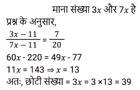 9. दो संख्याएँ 3 : 7 के अनुपात में हैं। यदि प्रत्येक में से 11 घटा दिया जाए, तो संख्याओं के बीच का अनुपात 7 : 20 हो जाता है। छोटी संख्या ज्ञात कीजिए। [SSC CPO 27/06/2024 (1st Shift)]