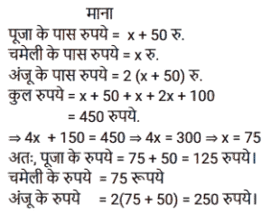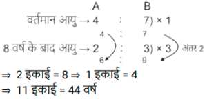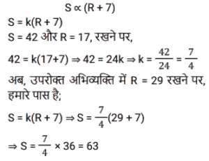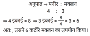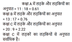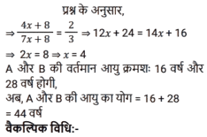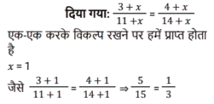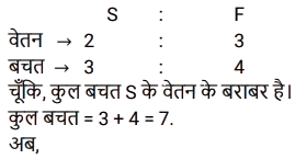अनुपात – समानुपात (SSC) (Part-III)Total Questions: 5021. यदि कक्षा A में 11 लड़के और 18 लड़कियां हैं, कक्षा 8 में 13 लड़के और 17 लड़कियां हैं, और कक्षा C में 20 लड़के और 9 लड़कियां हैं, तो किस कक्षा में लड़कों का लड़कियों से अनुपात सर्वाधिक है? [Matriculation Level 20/06/2024 (Shift - 4)](a) कक्षा A(b) कक्षा A और कक्षा B दोनों(c) कक्षा C(d) कक्षा BCorrect Answer: (c) कक्षा CSolution:22. 4 : 3 के अनुपात में पनीर और मक्खन का उपयोग करके एक रेसिपी बनाई जाती है। यदि आरोही 8 कटोरे पनीर का उपयोग करती है, तो उसे कितने कटोरे मक्खन का उपयोग करना चाहिए? [Matriculation Level 21/06/2024 (Shift - 1)](a) 4(b) 6(c) 8(d) 3Correct Answer: (b) 6Solution:23. S और F के वेतन का अनुपात 2 : 3 है और उनकी बचत का अनुपात 3 : 4 है। यदि उनकी कुल बचत S के वेतन के बराबर है, तो उनके व्यय का अनुपात क्या है? [Matriculation Level 21/06/2024 (Shift - 1)](a) 8 : 15(b) 7 : 1(c) 8 : 13(d) 7 : 12Correct Answer: (c) 8 : 13Solution:24. यदि S, (R + 7) के समानुपातिक है, और R = 17 होने पर S = 42 होता है, तो R = 29 होने पर S का मान क्या होगा? [Matriculation Level 24/06/2024 (Shift - 1)](a) 51(b) 63(c) 58(d) 66Correct Answer: (b) 63Solution:25. एक टेलीविजन सेट और एक वाशिंग मशीन की कीमत 8 : 7 के अनुपात में है। यदि टेलीविजन सेट की कीमत वाशिंग मशीन की कीमत से ₹4,800 अधिक है, तो वाशिंग मशीन की कीमत ज्ञात करें। [Matriculation Level 25/06/2024 (Shift - 1)](a) ₹33,000(b) ₹33,500(c) ₹33,600(d) ₹33,700Correct Answer: (c) ₹33,600Solution:26. पूजा, चमेली और अंजू के पर्स में कुल ₹450 हैं। पूजा के पास चमेली से ₹50 अधिक हैं। अंजू के पास पूजा की तुलना में दो गुना हैं। क्रमशः पूजा, चमेली और अंजू के पर्स में कितने रुपये हैं ? [Higher Secondary 20/06/2024 (Shift - 2)](a) ₹150, ₹75 और ₹225(b) ₹100, ₹50 और ₹300(c) ₹125, ₹75 और ₹250(d) ₹125, ₹50 और ₹275Correct Answer: (c) ₹125, ₹75 और ₹250Solution:27. दो संख्याएँ 4 : 5 के अनुपात में हैं। यदि छोटी संख्या में 3 जोड़ दिया जाए और बड़ी संख्या में से 7 घटा दिया जाए, तो उनका अनुपात 1:1 हो जाता है। तो संख्याएँ ज्ञात कीजिए। [Higher Secondary 20/06/2024 (Shift - 2)](a) 60, 75(b) 40, 50(c) 55, 44(d) 20, 25Correct Answer: (b) 40, 50Solution:28. 45𝓍⁴ और 5y² का मध्यानुपाती क्या है? [ Higher Secondary 21/06/2024 (Shift - 2)](a) 5𝓍²y(b) 25𝓍⁴y(c) 15𝓍²y(d) 45𝓍²y²Correct Answer: (c) 15𝓍²ySolution:29. A और B की आयु क्रमशः 4 : 7 के अनुपात में है। 8 वर्ष बाद उनकी आयु का अनुपात 2 : 3 हो जाएगा। A और B की आयु का योग (वर्षों में) क्या है? [Higher Secondary 21/06/2024 (Shift - 2)](a) 44(b) 36(c) 38(d) 42Correct Answer: (a) 44Solution:30. 3, 11, 4 और 14 को समानुपात में बनाने के लिए इनमें कौन-सी संख्या जोड़ी जानी चाहिए? [Higher Secondary 25/06/2024 (Shift - 2)](a) 3(b) 2(c) 4(d) 1Correct Answer: (d) 1Solution:Submit Quiz« Previous12345Next »
