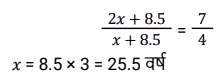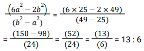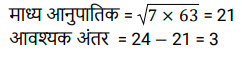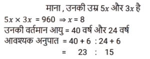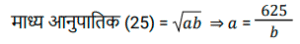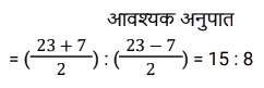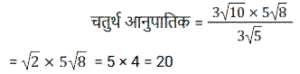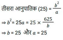 अनुपात – समानुपात (SSC) (Part-IV)Total Questions: 5011. ऐसी 2 संख्याएँ ज्ञात कीजिए जिनका माध्य समानुपाती 25 हो और उनका तृतीय समानुपाती 25 हो। [SSC CHSL 07/08/2023 (1st Shift)](a) 5 और 5(b) 5 और 25(c) 25 और 125(d) 25 और 25Correct Answer: (d) 25 और 25Solution:12. एक पिता की वर्तमान आयु उसके पुत्र की वर्तमान आयु की दोगुनी है। 8.5 वर्ष बाद उनकी आयु का अनुपात 7 : 4 होगा। पुत्र की वर्तमान आयु ज्ञात कीजिए। [SSC CHSL 07/08/2023 (2nd Shift)](a) 25.5 वर्ष(b) 16.5 वर्ष(c) 20.5 वर्ष(d) 24.6 वर्षCorrect Answer: (a) 25.5 वर्षSolution:13. सुनैना और रंजन की धनराशि का योग ₹23 है और उनकी धनराशि का अंतर ₹7 है। सुनैना और रंजन के पास धनराशि का अनुपात क्या है? [SSC CHSL 07/08/2023 (3rd Shift)](a) 5 : 3(b) 7 : 15(c) 15 : 8(d) 2 : 17Correct Answer: (c) 15 : 8Solution:14. दो संख्याएँ 1: 2 के अनुपात में है। यदि दोनों में 7 जोड़ दिया जाए, तो उनका अनुपात 3 : 5 हो जाता है। बड़ी संख्या कौन सी है? [SSC CHSL 07/08/2023 (3rd Shift)](a) 30(b) 18(c) 14(d) 28Correct Answer: (d) 28Solution:15. 24 तथा, 7 और 63 के माध्यानुपाती के बीच का अंतर कितना है? [SSC CHSL 07/08/2023 (4th Shift)](a) 3(b) 2(c) 5(d) 4Correct Answer: (a) 3Solution:16. यदि a : b = 5 : 7, तो (6a² - 2b²) : (b² - a²) का मान क्या होगा ? [SSC CHSL 08/08/2023 (4th Shift)](a) 12 : 5(b) 21 : 5(c) 13 : 6(d) 17 : 8Correct Answer: (c) 13 : 6Solution:17. 3√5, 5√8 और 3√10 का चतुर्थ समानुपाती क्या है? [SSC CHSL 09/08/2023 (4th Shift)](a) 10√5(b) 40√2(c) 30(d) 20Correct Answer: (d) 20Solution:18. पिता की आयु और उसके पुत्र की आयु का अनुपात 5 : 3 है। उनकी आयु निरूपित करने वाली संख्याओं का गुणनफल 960 है। 6 वर्ष के बाद उनकी आयु का अनुपात क्या होगा ? [SSC CHSL 11/08/2023 (1st Shift)](a) 23:15(b) 23:17(c) 21:15(d) 21:17Correct Answer: (a) 23:15Solution:19. P और 12 का तृतीय समानुपात ज्ञात कीजिए, जब 8, P, 16 और 18 समानुपात में हैं। [SSC CHSL 11/08/2023 (2nd Shift)](a) 16(b) 8(c) 18(d) 12Correct Answer: (a) 16Solution:20. एक कंपनी में कर्मचारियों की कुल संख्या 960 है। यदि कंपनी में महिला कर्मचारियों की संख्या 420 है, तो कंपनी में पुरुष कर्मचारियों की कुल संख्या और महिला कर्मचारियों की कुल संख्या का क्रमशः अनुपात क्या है ? [SSC CHSL 11/08/2023 (3rd Shift)](a) 7 : 9(b) 16 : 9(c) 16 : 7(d) 9 : 7Correct Answer: (d) 9 : 7Solution:Submit Quiz« Previous12345Next »