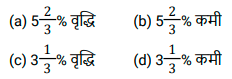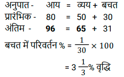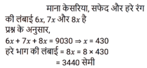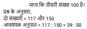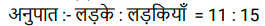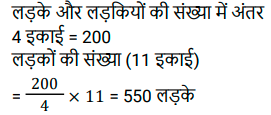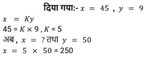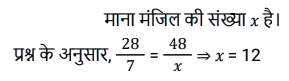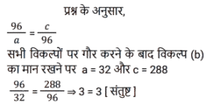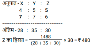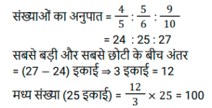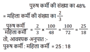 अनुपात – समानुपात (SSC) (Part-IV)Total Questions: 5021. यदि x, y के अनुक्रमानुपाती है और x = 45 है, जब y = 9 है तो, y = 50 होने पर x का मान क्या होगा? [SSC CHSL 17/08/2023 (1st Shift)](a) 225(b) 190(c) 175(d) 250Correct Answer: (d) 250Solution:22. ₹1488 को X, Y और Z में बाटिए। यदि उनके हिस्सों का अनुपात X : Y = 4 : 5, Y : Z = 7 : 6, है, तो Z का हिस्सा ज्ञात कीजिए। [SSC CHSL 17/08/2023 (3rd Shift)](a) ₹ 460(b) ₹ 450(c) ₹ 470(d) ₹ 480Correct Answer: (d) ₹ 480Solution:23. एक स्कूल में लड़कों की संख्या का लड़कियों की संख्या से अनुपात 11: 15 है। यदि स्कूल में लड़कों की तुलना में लड़कियों की संख्या 200 अधिक है, तो उस स्कूल में लड़कों की संख्या कितनी है? [SSC CGL 14/07/2023 (4th shift)](a) 550(b) 750(c) 506(d) 605Correct Answer: (a) 550Solution:24. वैदिक की मासिक आय और व्यय के बीच का अनुपात 8 : 5 है। यदि उसकी आय में 20% की वृद्धि होती है और उसके व्यय में 30% की वृद्धि होती है, तो उसकी मासिक बचत में प्रतिशत वृद्धि या कमी ज्ञात कीजिए। [SSC CGL 14/07/2023 (4th shift)](a)(b)(c)(d)Correct Answer: (c)Solution:25. एक कारखाने में, पुरुष श्रमिकों की संख्या का 48%, महिला श्रमिकों की संख्या के दो-तिहाई के बराबर है। कारखाने में पुरुषों की संख्या का महिलाओं की संख्या से अनुपात कितना है? [SSC CGL 18/07/2023 (2nd shift)](a) 25 : 12(b) 12 : 25(c) 18 : 25(d) 25 : 18Correct Answer: (d) 25 : 18Solution:26. दो संख्याएं एक तीसरी संख्या से क्रमशः 17% और 50% अधिक हैं। दोनों संख्याओं का अनुपात ज्ञात कीजिए। [SSC CGL 19/07/2023 (4th shift)](a) 27 : 25(b) 39 : 50(c) 19 : 11(d) 29 : 25Correct Answer: (b) 39 : 50Solution:27. यदि a : b :: b : c और b = 96 है, तो निम्नलिखित में से कौन-सा, a और c के मानों का एक संभावित युग्म हो सकता है? [SSC CGL 20/07/2023 (2nd shift)](a) a = 24 ; c = 374(b) a = 32 ; c = 288(c) a = 48 ; c = 168(d) a = 16 ; c = 586Correct Answer: (b) a = 32 ; c = 288Solution:28. तीन संख्याएं 4/5 : 5/6 : 9/10 के अनुपात में हैं। सबसे छोटी और सबसे बड़ी संख्या के बीच का अंतर 12 है। वह संख्या ज्ञात करें जो न तो सबसे छोटी है और न ही सबसे बड़ी । [ SSC CGL 24/07/2023 (2nd shift)](a) 96(b) 108(c) 100(d) 104Correct Answer: (c) 100Solution:29. एक खंभा 9030 cm लंबा है। यह 6 : 7 : 8 के अनुपात में केसरिया, सफेद और हरे रंग से रंगा गया है। खंभे के हरे भाग की लम्बाई ज्ञात करें। [SSC CGL 24/07/2023 (4th shift)](a) 3440 cm(b) 3010 cm(c) 3480 cm(d) 2580 cmCorrect Answer: (a) 3440 cmSolution:30. यदि 7 मंजिला एक इमारत की परछाई 28 मी. लंबी है, तो उस इमारत में मंजिलों की संख्या क्या होगी, जिसकी परछाई 48 मी. लंबी है? [SSC CGL 26/07/2023 (3rd shift)](a) 14(b) 24(c) 16(d) 12Correct Answer: (d) 12Solution:Submit Quiz« Previous12345Next »