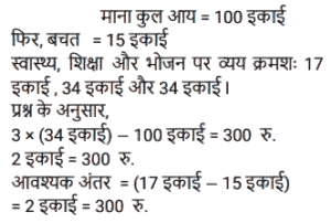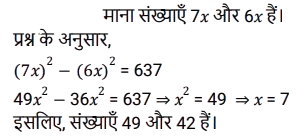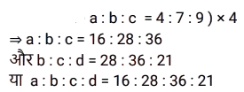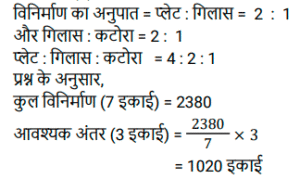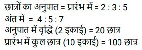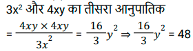 अनुपात – समानुपात (SSC) (Part-IV)Total Questions: 5031. वह छोटी से छोटी धनात्मक संख्या कौन-सी है जिसे 2 और 3 में से घटाए जाने पर उनका तृतीय अनुपात 4 होगा ? [SSC CGL 26/07/2023 (4th shift)](a) 1(b) 2(c) 4(d) 3Correct Answer: (a) 1Solution:32. यदि 3x² और 4xy का तृतीयानुपाती 48 है, तो y का धनात्मक मान ज्ञात करें। [SSC CGL 27/07/2023 (2nd shift)](a) 3(b) 5(c) 2(d) 4Correct Answer: (a) 3Solution:33. एक पिज़्ज़ा बनाने के लिए चीज़ और सॉस का अनुपात 1 कप : 1/2 कप है। यदि रमा एक निश्चित संख्या में पिज़्ज़ा बनाने के लिए 15 कप सॉस का उपयोग करती है, तो उन पिज़्ज़ा के लिए कितने कप चीज़ का उपयोग किया जाएगा? [Graduate Level 27/06/2023 (Shift - 4)](a) 20 कप(b) 10 कप(c) 40 कप(d) 30 कपCorrect Answer: (d) 30 कपSolution:34. एक परिवार अपनी कुल आय में से 15% की बचत करता है और शेष राशि तीन प्रकार के व्यय स्वास्थ्य, शिक्षा और भोजन पर 1 : 2 : 2 के अनुपात में व्यय करता है। आय, शिक्षा पर किए गए व्यय के तीन गुने से 300 रुपये कम है। बचत और स्वास्थ्य पर किए गए व्यय में कितना अंतर है? [Graduate Level 27/06/2023 (Shift - 4)](a) Rs.300(b) Rs.350(c) Rs.2,250(d) Rs.500Correct Answer: (a) Rs.300Solution:35. माना M, 16 और 9 के बीच के मध्यानुपाती को व्यक्त करता है और N, 9 और 15 के तृतीय समानुपाती को व्यक्त करता है। 5M + 3N का मान ज्ञात कीजिए । [Graduate Level 28/06/2023 (Shift - 3)](a) 300(b) 125(c) 135(d) 225Correct Answer: (c) 135Solution:36. एक कंपनी तीन अलग-अलग उत्पादों गिलास, प्लेट और कटोरे का निर्माण करती है। प्लेटों की संख्या, गिलासों की संख्या की दोगुनी है। निर्मित गिलासों की संख्या, कटोरों की संख्या की दोगुनी है। यदि कंपनी द्वारा निर्मित कुल इकाइयाँ 2380 हैं, तो प्लेटों की संख्या और कटोरों की संख्या के बीच अंतर कितना है ? [Graduate Level 28/06/2023 (Shift - 3)](a) 1360(b) 680(c) 1120(d) 1020Correct Answer: (d) 1020Solution:37. दो संख्याएँ 7 : 6 के अनुपात में हैं। यदि उनके वर्गों के बीच का अंतर 637 है, तो वे संख्याएँ कौन सी हैं ? [Higher Secondary 30/06/2023 (Shift - 2)](a) 49 और 42(b) 49 और 12(c) 43 और 36(d) 14 और 12Correct Answer: (a) 49 और 42Solution:38. एक नृत्य कक्षा के तीन बैचों में छात्रों का अनुपात 2 : 3 : 5 है। यदि प्रत्येक बैच में 20 छात्र बढ़ते हैं तो अनुपात बदलकर 4 : 5 : 7 हो जाता है। वृद्धि से पहले तीनों बैचों में छात्रों की कुल संख्या ज्ञात कीजिए । [Matriculation Level 27/06/2023 (Shift -1)](a) 120(b) 100(c) 150(d) 80Correct Answer: (b) 100Solution:39. एक परीक्षा में, प्रैक्टिकल और थ्योरी अंकों का अनुपात 3 : 7 है। यदि प्रैक्टिकल में 80% अंक प्राप्त होते हैं और थ्योरी में 60% अंक प्राप्त होते हैं, तो थ्योरी और प्रैक्टिकल में प्राप्त अंकों का अनुपात क्या है? [Matriculation Level 28/06/2023 (Shift - 1)](a) 6 : 7(b) 5 : 7(c) 7 : 4(d) 3 : 7Correct Answer: (c) 7 : 4Solution:40. यदि a : b : c = 4 : 7 : 9 और b : c : d = 28 : 36 : 21 है, तो a : b : c : d क्या होगा ? [Matriculation Level 28/06/2023 (Shift - 4)](a) 12 : 21 : 27 : 17(b) 16 : 28 : 36 : 21(c) 8 : 14 : 18 : 21(d) 4 : 7 : 9 : 11Correct Answer: (b) 16 : 28 : 36 : 21Solution:Submit Quiz« Previous12345Next »