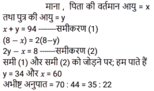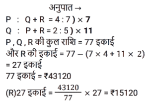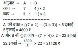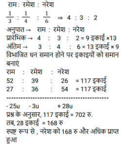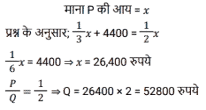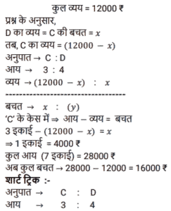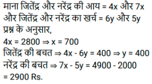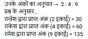 अनुपात – समानुपात (SSC) (Part-V)Total Questions: 501. जितेंद्र, और नरेंद्र की आय का अनुपात 4 : 7 है और उनके व्यय का अनुपात क्रमशः 6 : 5 है। यदि जितेंद्र Rs. 2,800 की आय में से Rs.400 बचाता है, तो नरेंद्र की बचत ज्ञात कीजिए। [SSC CHSL 13/03/2023 (2nd Shift)](a) Rs. 2,900(b) Rs. 2,000(c) Rs. 3,900(d) Rs, 4,900Correct Answer: (a) Rs. 2,900Solution:2. P और Q की आय का अनुपात 1:2 है Q और R की आय का अनुपात 3:2 है। यदि P की आय का एक तिहाई भाग P की आय के आधे से Rs. 4400 कम है, तो Q की आय कितनी है? [SSC CHSL 14/03/2023 (2nd Shift)](a) Rs. 56600(b) Rs. 52800(c) Rs. 46600(d) Rs. 41200Correct Answer: (b) Rs. 52800Solution:3. यदि दो संख्याओं के बीच का अंतर उनके योग का 20 प्रतिशत है, तो बड़ी संख्या और छोटी - संख्या का अनुपात क्या है ? [SSC CHSL 14/03/2023 (4th Shift)](a) 6 : 5(b) 5 : 4(c) 4 : 3(d) 3 : 2Correct Answer: (d) 3 : 2Solution:4. C और D की आय का अनुपात क्रमश: 3 : 4 है। उनके व्यय का योग Rs. 12000 है। C की बचत D के व्यय के बराबर है। उनकी बचत का योग क्या है? [SSC CHSL 16/03/2023 (2nd Shift)](a) Rs. 25000(b) Rs. 15000(c) Rs. 20000(d) Rs. 16000Correct Answer: (d) Rs. 16000Solution:5. एक पिता और उसके पुत्र की वर्तमान आयु का योग 94 वर्ष है। 8 वर्ष पहले उनकी क्रमशः आयु का अनुपात 2 : 1 था। 10 वर्ष बाद पिता और पुत्र की आयु का अनुपात क्या होगा ? [SSC CHSL 17/03/2023 (4th Shift)](a) 35 : 22(b) 14 :13(c) 25 : 18(d) 16 :15Correct Answer: (a) 35 : 22Solution:6. Rs. 43,120 को P, Q और R में इस प्रकार बांटा जाता है कि P का हिस्सा Q और R के है कुल हिस्से का 4/7 है और Q का हिस्सा P और R के कुल हिस्से का 2/5 है। R का हिस्सा कितना है ? [SSC CHSL 21/03/2023 (3rd Shift)](a) Rs.15120(b) Rs.14220(c) Rs.16400(d) Rs.18050Correct Answer: (a) Rs.15120Solution:7. दो कर्मचारियों की आय का अनुपात 7 : 4 है, और उनके व्यय का अनुपात 3 :1 है। यदि उनमें से प्रत्येक ₹4,800 प्रति माह बचत करता है, तो उनकी मासिक आय का योग (₹ में) ज्ञात कीजिए । [SSC CGL Tier II (02/03/2023)](a) 21120(b) 20120(c) 21150(d) 18150Correct Answer: (a) 21120Solution:8. एक परीक्षा में राजेश, राकेश और रमेश द्वारा प्राप्त अंकों का अनुपात 2:4:9 है। यदि राजेश ने परीक्षा में 30 अंक प्राप्त किए हैं, तो राकेश और रमेश द्वारा प्राप्त अंक क्या हैं? [SSC CGL Tier II (03/03/2023)](a) राकेश = 40, रमेश = 90(b) राकेश = 60, रमेश = 135(c) राकेश = 120, रमेश = 180(d) राकेश = 90, रमेश = 40Correct Answer: (b) राकेश = 60, रमेश = 135Solution:9. ₹702 को राम, रमेश और नरेश के बीच गलती से 1/3 : 1/4 : 1/6 के अनुपात में विभाजित करने के बजाय इसे 3 : 4 : 6 के अनुपात में विभाजित कर दिया गया था। सबसे अधिक किसने और कितना लाभ प्राप्त किया? [SSC CGL 02/12/2022 (1st Shift)](a) राम ₹158(b) रमेश ₹158(c) नरेश ₹168(d) राम ₹168Correct Answer: (c) नरेश ₹168Solution:10. 9 और 13 में प्रत्येक से सबसे छोटी धनात्मक कौन सी संख्या घटाई जानी चाहिए ताकि उनका तृतीयानुपात 18 हो? [SSC CGL 03/12/2022 (3rd Shift)](a) 2(b) 4(c) 3(d) 1Correct Answer: (d) 1Solution:Submit Quiz12345Next »