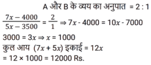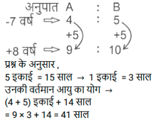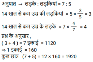 अनुपात – समानुपात (SSC) (Part-VI)Total Questions: 3431. A और B की आय का अनुपात 7 : 5 है। A और B क्रमशः 4,000 रु और 3,500 रु बचाते हैं। यदि B का व्यय A के व्यय का आधा है, तो A और B की कुल आय (रुपये में) होगी। [SSC CHSL 05/08/2021 (Afternoon)](a) 10,000(b) 13,500(c) 12,000(d) 15,000Correct Answer: (c) 12,000Solution:32. एक समानुपात में, पहले और चौथे पद का गुणनफल 70 है और दूसरे और तीसरे पद का गुणनफल 3.5y है। y का मान है। [SSC CHSL 09/08/2021 (Morning)](a) 17(b) 20(c) 15(d) 22Correct Answer: (b) 20Solution:33. सात साल पहले, A और B की आयु का अनुपात 4 : 5 था। आठ साल बाद A और B की आयु का अनुपात 9 : 10 होगा। वर्षों में उनके वर्तमान आयु का योग क्या है। [SSC CPO 23/11/2020 (Morning)](a) 41(b) 82(c) 32(d) 56Correct Answer: (a) 41Solution:34. एक स्कूल में, छात्रों की संख्या में से 5/12 लड़कियाँ हैं और शेष लड़के हैं, लड़कों की संख्या में से 4/7, 14 वर्ष से कम उम्र के हैं, और 2/5 की संख्या में लड़कियाँ 14 वर्ष या 14 वर्ष से अधिक हैं। यदि 14 वर्ष से कम आयु के छात्रों की संख्या 1120 है, तो स्कूल में छात्रों की कुल संख्या हैः [SSC CPO 25/11/2020 (Evening)](a) 1820(b) 1900(c) 1920(d) 1290Correct Answer: (c) 1920Solution:Submit Quiz« Previous1234