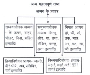 Solution:क्रियाविशेषण, सम्बन्धबोधक, समुच्चयबोधक तथा विस्मयादिबोधक अव्यय के भेद हैं। विसर्गबोधक अव्यय इसमें शामिल नहीं है। जिन शब्दों के रूप सदा एक-से बने रहते हैं; अर्थात् लिंग, वचन और कारक से कोई विकार नहीं होता, उन्हें 'अव्यय' कहते हैं।