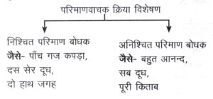 Solution:वह बिल्कुल थक गया है। इस वाक्य में परिमाणवाचक क्रियाविशेषण है। बहुत, अति, बड़ा, बिलकुल, अतिशय, अत्यन्त, निपट, सर्वथा, खूब इत्यादि परिमाणवाचक क्रियाविशेषण के अन्तर्गत आने वाले अधिकताबोधक क्रियाविशेषण के उदाहरण हैं।अन्य महत्त्वपूर्ण तथ्य-