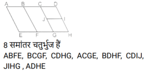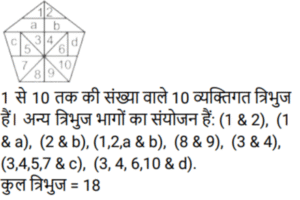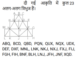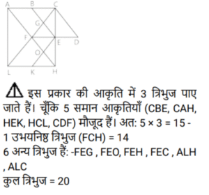 आकृतियों की गणना (भाग-I)Total Questions: 5021. दी गई आकृति में त्रिभुजों की संख्या ज्ञात कीजिए। [SSC CHSL 05/08/2021 (Evening)](a) 10(b) 9(c) 8(d) 11Correct Answer: (a) 10Solution:22. दी गई आकृति में त्रिभुजों की संख्या ज्ञात कीजिए [SSC CHSL 05/08/2021 (Morning)](a) 17(b) 18(c) 16(d) 19Correct Answer: (b) 18Solution:23. दी गई आकृति से त्रिभुजों की संख्या ज्ञात कीजिए । [SSC CHSL 15/04/2021 (Morning)](a) 20(b) 22(c) 23(d) 21Correct Answer: (c) 23Solution:24. दी गयी आकृति में कितने त्रिकोण है ? [SSC CHSL 26/10/2020 (Morning)](a) 6(b) 9(c) 8(d) 7Correct Answer: (c) 8Solution:25. निम्नलिखित आकृति में वर्गों की संख्या ज्ञात कीजिए। [SSC CHSL 20/10/2020 (Afternoon)](a) 12(b) 17(c) 13(d) 16Correct Answer: (b) 17Solution:झुके हुए वर्गों की संख्या = 2 सीधे वर्गों में वर्गों की कुल संख्या = 5 × 3 = 15 दी गई आकृति में वर्गों की कुल संख्या = 15 + 2 =1726. निम्नलिखित आकृति में कितने त्रिकोण हैं ? [SSC CHSL 12/10/2020 (Morning)](a) 20(b) 21(c) 22(d) 18Correct Answer: (a) 20Solution:27. दी गयी आकृति मेंकितने त्रिकोण है ? [SSC CHSL 18/03/2020 (Morning)](a) 8(b) 13(c) 12(d) 10Correct Answer: (a) 8Solution:28. दी गयी आकृति में कितने त्रिभुज मौजूद हैं? [SSC CGL 05/03/2020 (Morning)](a) 21(b) 22(c) 23(d) 20Correct Answer: (c) 23Solution:29. दी गयी आकृति में कितने आयत हैं ? [SSC CGL 03/03/2020 (Morning)](a) 34(b) 35(c) 32(d) 30Correct Answer: (b) 35Solution:कुल 35 आयत हैं।30. नीचे दी गई आकृति में कितने समांतर चतुर्भुज हैं ? [SSC Stenographer 10/12/2024 (Morning)](a) 8(b) 7(c) 9(d) 10Correct Answer: (a) 8Solution:Submit Quiz« Previous12345Next »