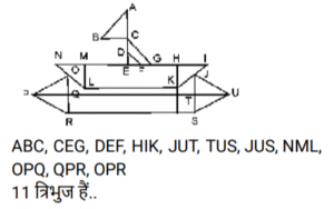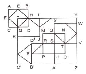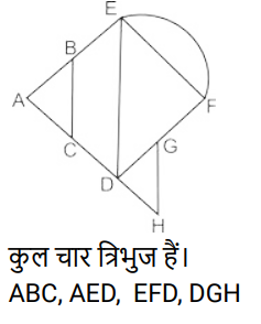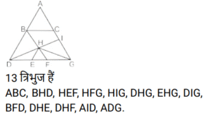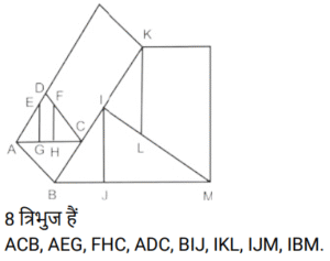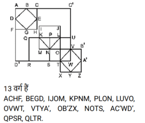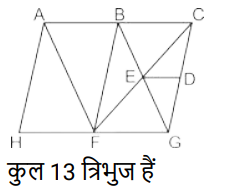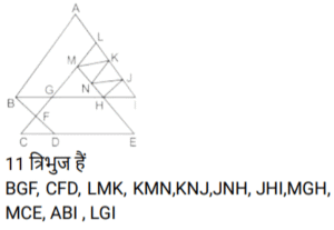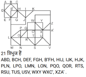 आकृतियों की गणना (भाग-I)Total Questions: 5031. दी गई आकृति में कितने त्रिभुज हैं? [SSC Stenographer 10/12/2024 (Afternoon)](a) 11(b) 12(c) 13(d) 14Correct Answer: (b) 12Solution:32. दी गई आकृति में कितने त्रिभुज हैं ? [SSC Stenographer 11/12/2024 (Afternoon)](a) 12(b) 13(c) 14(d) 15Correct Answer: (b) 13Solution:AHF, AFB, BFE, AFC, BEC, CED, DEG, FEG, CEG, BFC, BGC, BFG, CFG33. दी गई आकृति में कितने त्रिभुज हैं? [SSC Stenographer 11/12/2024 (Evening)](a) 12(b) 11(c) 13(d) 10Correct Answer: (b) 11Solution:34. दी गई आकृति में कितने त्रिभुज हैं? [SSC CGL 09/09/2024 (1st Shift)](a) 21(b) 20(c) 19(d) 18Correct Answer: (a) 21Solution:35. दी गई आकृति में कितने त्रिभुज हैं ? [SSC CGL 09/09/2024 (2nd Shift)](a) 5(b) 3(c) 4(d) 6Correct Answer: (c) 4Solution:36. दी गई आकृति में कितने त्रिभुज हैं? [SSC CGL 09/09/2024 (3rd Shift)](a) 6(b) 8(c) 4(d) 5Correct Answer: (b) 8Solution:37. दी गई आकृति में कितने वर्ग हैं? [SSC CGL 10/09/2024 (1st Shift)](a) 14(b) 12(c) 15(d) 13Correct Answer: (a) 14Solution:14 वर्ग हैं ABDC, EFGH, LHDG, LIJK, MQSR, QNTS, STOU, RSUP, MNOP, XWVS, SVZA’, D’SA’B’ , D’RPE’, LYZC’ .38. दी गई आकृति में कितने त्रिभुज हैं? [SSC CGL 10/09/2024 (2nd Shift)](a) 16(b) 17(c) 14(d) 15Correct Answer: (a) 16Solution:39. दी गई आकृति में कितने वर्ग हैं? [SSC CGL 10/09/2024 (3rd Shift)](a) 11(b) 10(c) 12(d) 13Correct Answer: (d) 13Solution:40. दी गई आकृति में कितने त्रिभुज हैं? [SSC CGL 11/09/2024 (1st Shift)](a) 11(b) 8(c) 9(d) 10Correct Answer: (a) 11Solution:Submit Quiz« Previous12345Next »