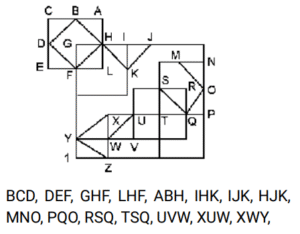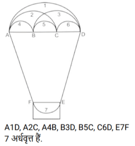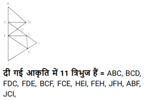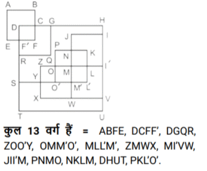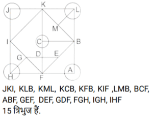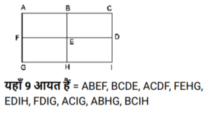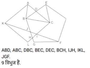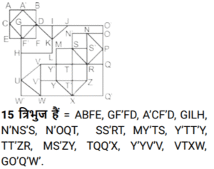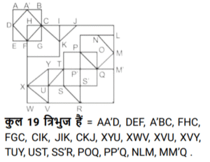 आकृतियों की गणना (भाग-II)Total Questions: 501. दी गई आकृति में कितने त्रिभुज हैं? [SSC CGL 18/09/2024 (2nd Shift)](a) 7(b) 11(c) 8(d) 9Correct Answer: (d) 9Solution:2. दी गई आकृति में कितने त्रिभुज हैं? [SSC CGL 18/09/2024 (3rd Shift)](a) 17(b) 12(c) 15(d) 18Correct Answer: (d) 18Solution:WYZ, XYZ , Y1Z 18 त्रिभुज हैं.3. दी गई आकृति में कितने त्रिभुज हैं? [SSC CGL 19/09/2024 (1st Shift)](a) 14(b) 13(c) 16(d) 15Correct Answer: (d) 15Solution:4. दी गई आकृति में कितने अर्धवृत्त हैं? [SSC CGL 19/09/2024 (2nd Shift)](a) 6(b) 5(c) 8(d) 7Correct Answer: (d) 7Solution:5. दी गई आकृति में कितने वर्ग हैं? [SSC CGL 23/09/2024 (1st Shift)](a) 14(b) 12(c) 11(d) 15Correct Answer: (d) 15Solution:6. दी गई आकृति में कितने आयत हैं? [SSC CGL 23/09/2024 (3rd Shift)](a) 9(b) 6(c) 4(d) 8Correct Answer: (a) 9Solution:7. नीचे दी गई आकृति में कितने त्रिभुज हैं? [SSC CGL 24/09/2024 (1st Shift)](a) 12(b) 11(c) 13(d) 10Correct Answer: (b) 11Solution:8. दी गई आकृति में कितने त्रिभुज हैं? [SSC CGL 24/09/2024 (2nd Shift)](a) 16(b) 17(c) 18(d) 19Correct Answer: (d) 19Solution:9. नीचे दर्शायी गयी आकृति में कितने वर्ग हैं? [SSC CGL 24/09/2024 (3rd Shift)](a) 11(b) 14(c) 12(d) 13Correct Answer: (d) 13Solution:10. नीचे दर्शायी गयी आकृति में कितने वर्ग हैं? [SSC CGL 25/09/2024 (1st Shift)](a) 17(b) 18(c) 16(d) 15Correct Answer: (a) 17Solution:Submit Quiz12345Next »