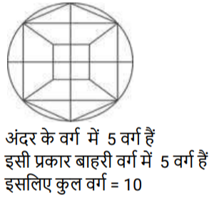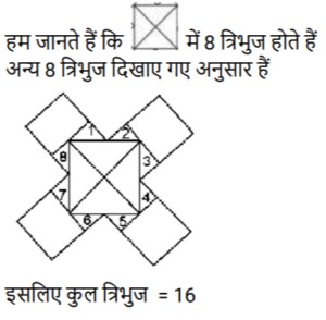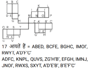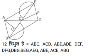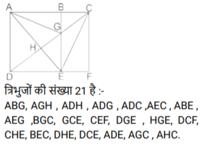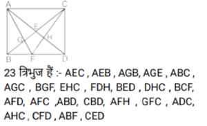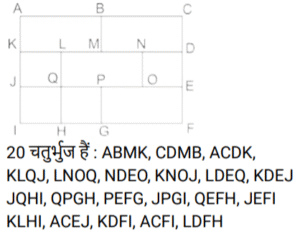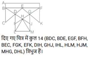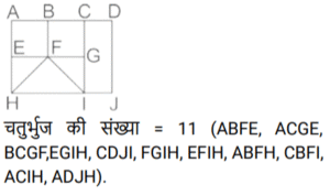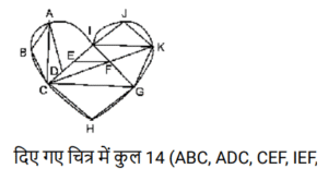 आकृतियों की गणना (भाग-III)Total Questions: 281. नीचे दी गई आकृति में कितने वर्ग हैं ? [SSC CHSL 08/08/2023 (4th Shift)](a) 11(b) 12(c) 10(d) 9Correct Answer: (c) 10Solution:2. दी गई आकृति में त्रिभुजों की संख्या ज्ञात कीजिए। [SSC CHSL 09/08/2023 (2nd Shift)](a) 12(b) 13(c) 10(d) 11Correct Answer: (a) 12Solution:3. नीचे दी गई आकृति में कितने त्रिभुज हैं? [SSC CHSL 10/08/2023 (1st Shift)](a) 14(b) 15(c) 16(d) 13Correct Answer: (a) 14Solution:ICG, ICF, IJK, IKF, ICK, JCK, CFG, FKG, CKG, CGH) त्रिभुज हैं|4. दी गई आकृति में आयतों की संख्या ज्ञात कीजिए। [SSC CHSL 10/08/2023 (2nd Shift)](a) 16(b) 24(c) 17(d) 28Correct Answer: (c) 17Solution:5. नीचे दी गई आकृति में कितने त्रिभुज हैं? [SSC CHSL 14/08/2023 (2nd Shift)](a) 14(b) 12(c) 15(d) 16Correct Answer: (d) 16Solution:6. नीचे दी गई आकृति में कितने त्रिभुज हैं? [SSC CHSL 17/08/2023 (1st Shift)](a) 14(b) 15(c) 16(d) 13Correct Answer: (a) 14Solution:7. दी गई आकृति में कितने चतुर्भुज हैं? [SSC CHSL 09/03/2023 (4th Shift)](a) 18(b) 17(c) 19(d) 20Correct Answer: (d) 20Solution:8. नीचे दी गई आकृति में कितने त्रिभुज हैं? [SSC CHSL 10/03/2023 (1st Shift)](a) 21(b) 22(c) 20(d) 19Correct Answer: (a) 21Solution:9. दी गयी आकृति में कितने त्रिभुज हैं? [SSC CHSL 13/03/2023 (3rd Shift)](a) 21(b) 23(c) 20(d) 22Correct Answer: (b) 23Solution:10. दी गई आकृति में कितने चतुर्भुज हैं? [SSC CHSL 14/03/2023 (3rd Shift)](a) 11(b) 12(c) 10(d) 9Correct Answer: (a) 11Solution:Submit Quiz123Next »