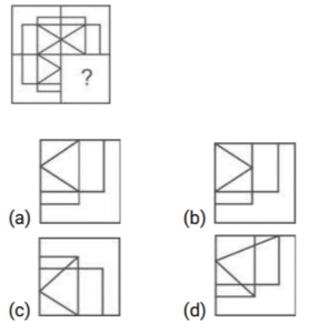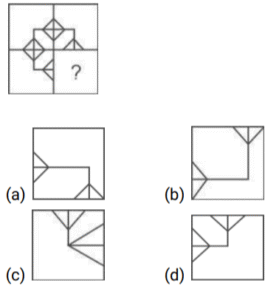 आकृति संकलन (भाग-II)Total Questions: 4341. उस विकल्प आकृति का चयन करें जो पैटर्न को पूरा करने के लिए नीचे दी गई प्रश्न आकृति में प्रश्न चिह्न (?)/रिक्त स्थान को प्रतिस्थापित करेगी। [SSC MTS 05/08/2019 (Morning)](a)(b)(c)(d)Correct Answer: (a)Solution:42. उस विकल्प आकृति का चयन करें जो पैटर्न को पूरा करने के लिए नीचे दी गई प्रश्न आकृति में प्रश्न चिह्न (?)/रिक्त स्थान को प्रतिस्थापित करेगी। [SSC MTS 05/08/2019 (Evening)](a)(b)(c)(d)Correct Answer: (d)Solution:43. उस विकल्प आकृति का चयन करें जो पैटर्न को पूरा करने के लिए नीचे दी गई प्रश्न आकृति में प्रश्न चिह्न (?)/रिक्त स्थान को प्रतिस्थापित करेगी। [SSC CHSL 17/03/2020 (Evening)](a)(b)(c)(d)Correct Answer: (c)Solution:Submit Quiz« Previous12345