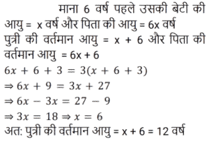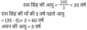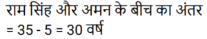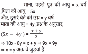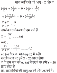 आयुTotal Questions: 5011. एक पिता की आयु, उसके पुत्र की आयु की चार गुनी है। 10 वर्ष बाद, पिता की आयु, उसके पुत्र की आयु की 2.5 गुना होगी। पुत्र की वर्तमान आयु ज्ञात कीजिए। [Group D 19/09/2022 (Afternoon)](a) 60 वर्ष (b) 40 वर्ष (c) 10 वर्ष(d) 15 वर्षCorrect Answer: (c) 10 वर्षSolution:12. तीन व्यक्तियों की आयु का योग 44 वर्ष है और उनकी आयु का संख्यात्मक गुणनफल 1950 है। साथ ही, दूसरे और तीसरे व्यक्ति की आयु के अंतर को पहले व्यक्ति और दूसरे व्यक्ति की आयु के अंतर से घटाने पर 5 वर्ष है। दूसरे व्यक्ति की वर्तमान आयु ज्ञात कीजिए। [Group D 26/09/2022 (Morning)](a) 10 वर्ष (b) 6 वर्ष (c) 13 वर्ष(d) 25 वर्षCorrect Answer: (c) 13 वर्षSolution:13. महेंद्र और जाहिद की आयु का अनुपात 6 : 7 है। पंद्रह वर्ष पहले उनकी आयु 9 : 11 के अनुपात में थी। महेंद्र की वर्तमान आयु कितनी है? [NTPC CBT-I 10/01/2021 (Morning)](a) 18 वर्ष (b) 54 वर्ष (c) 60 वर्ष(d) 10 वर्षCorrect Answer: (c) 60 वर्षSolution:14. अमन के परदादा की आयु 105 साल है। अमन के पिता राम सिंह की आयु उसके दादा की 1/3 है। पाँच साल पहले, जब अमन का जन्म हुआ था, राम सिंह की माँ की आयु राम सिंह की आयु से दोगुनी थी। अमन और राम सिंह की आयु में कितना अंतर है? [NTPC CBT-I 13/01/2021 (Morning)](a) 20 वर्ष (b) 25 वर्ष (c) 35 वर्ष (d) 30 वर्षCorrect Answer: (d) 30 वर्षSolution:15. दो सहकर्मियों की आयु के व्युत्क्रमों का योग उनकी आयु के व्युत्क्रमों के अंतर का नौ गुना है। यदि उनकी आयु के गुणनफल का उनकी आयु के योग से अनुपात 100 : 9 है, तो उनकी आयु ज्ञात कीजिए ? [NTPC CBT-I 30/01/2021 (Evening)](a) 20 साल, 25 साल (b) 15 साल, 10 साल(c) 24 साल, 45 साल (d) 25 साल, 4 सालCorrect Answer: (a) 20 साल, 25 साल Solution:16. एक परिवार में, पिता की आयु उसके एक बेटे की आयु का 5 गुना है। माँ की आयु उसके दूसरे बेटे की आयु का 4 गुनी है। माता-पिता की आयु का अंतर, बेटों की आयु के योग के आधा है। तो : [RRB JE 02/06/2019 (Evening)](a) वे जुड़वां हैं।(b) उनकी उम्र का अंतर 5 है।(c) एक बेटे की आयु दूसरे की तुलना में दोगुनी है।(d) उनकी आयु का योग 5 से अधिक है।Correct Answer: (a) वे जुड़वां हैं।Solution:17. चार्ल्स और श्रिया की उम्र के बीच 6 साल का अंतर है। जब उन्होंने 30 साल पहले एक-दूसरे से शादी की थी तो चार्ल्स की उम्र का 4 गुना उतना था जितना कि श्रिया की उम्र का 5 गुना। उनकी वर्तमान उम्रों का योग क्या है? [RRB ALP Tier-I 10/08/2018 (Evening)](a) 114 वर्ष (b) 110 वर्ष (c) 115 वर्ष (d) 112 वर्षCorrect Answer: (a) 114 वर्ष Solution:18. A की आयु B से दोगुनी है। B की आयु C की आयु का 1/3 है। A, B और C की आयु का योग 42 वर्ष है, A और B की आयु का योग ज्ञात कीजिए। [Group D 17/08/2022 (Afternoon)](a) 12 वर्ष (b) 15 वर्ष (c) 21 वर्ष(d) 23 वर्षCorrect Answer: (c) 21 वर्षSolution:19. छह वर्ष पूर्व एक पिता की आयु अपनी पुत्री की तत्कालीन आयु की छह गुनी थी। तीन वर्ष बाद, पिता की आयु अपनी पुत्री की आयु की तीन गुनी होगी। पुत्री की वर्तमान आयु क्या है? [Group D 17/08/2022 (Evening)](a) 15 वर्ष (b) 12 वर्ष(c) 17 वर्ष (d) 20 वर्षCorrect Answer: (b) 12 वर्षSolution:20. अरुणा की एक छोटी बहन है जिसकी आयु अरुणा से 8 वर्ष कम है। यदि अरुणा की बहन की आयु 18 वर्ष है, तो अरुणा की आयु क्या है: [Group D 17/08/2022 (Evening)](a) 28 वर्ष (b) 26 वर्ष(c) 10 व