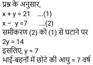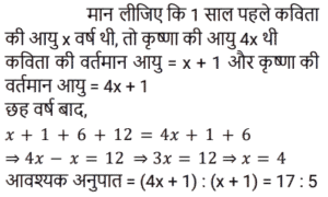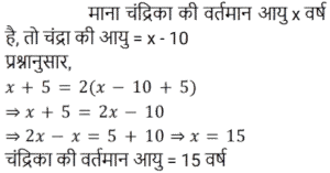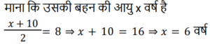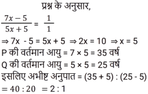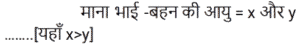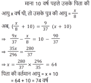 आयुTotal Questions: 5031. दस वर्ष पहले, एक पुत्र की आयु उसके पिता की आयु के 1/8 के बराबर थी। अब, उसकी आयु, उसके पिता की वर्तमान आयु के 9/37 के बराबर है। पिता की वर्तमान आयु ज्ञात कीजिए। [Group D 25/08/2022 (Morning)](a) 67 साल (b) 74 साल(c) 57 साल (d) 87 सालCorrect Answer: (b) 74 सालSolution:32. एक वर्ष पहले, कृष्ण की आयु उसकी पुत्री कविता की आयु की चार गुनी थी। छह वर्ष बाद, कृष्ण की आयु, उसकी पुत्री की आयु से 12 वर्ष अधिक होगी। कृष्ण और उसकी पुत्री की वर्तमान आयु का अनुपात ज्ञात कीजिए। [Group D 25/08/2022 (Morning)](a) 11 : 3 (b) 9 : 2 (c) 12 : 5 (d) 17 : 5Correct Answer: (d) 17 : 5Solution:33. राज और उसकी बहन की औसत आयु 8 वर्ष है। यदि राज की आयु 10 वर्ष है, तो उसकी बहन की आयु ज्ञात कीजिए। [Group D 25/08/2022 (Afternoon)](a) 7 साल(b) 9 साल(c) 6 साल(d) 8 सालCorrect Answer: (c) 6 सालSolution:34. वर्तमान में, एक पिता की आयु, उसके 3 बच्चों की आयु के योगफल की दोगुनी है। 15 वर्ष बाद, पिता की आयु उसके बच्चों की आयु के योगफल के बराबर होगी। आज से 15 वर्ष बाद पिता की आयु कितनी होगी? [Group D 25/08/2022 (Evening)](a) 90 वर्ष (b) 85 वर्ष (c) 75 वर्ष(d) 95 वर्षCorrect Answer: (c) 75 वर्षSolution:35. चंद्रा की आयु, चंद्रिका की आयु से 10 वर्ष कम है। 5 वर्ष बाद चंद्रिका की आयु, चंद्रा की आयु की दोगुनी हो जाएगी। चंद्रिका की वर्तमान आयु ज्ञात कीजिए। [Group D 25/08/2022 (Evening)](a) 20 वर्ष (b) 10 वर्ष (c) 15 वर्ष(d) 25 वर्षCorrect Answer: (c) 15 वर्षSolution:36. दो भाई-बहनों की आयु का अंतर 7 वर्ष है। यदि उनकी आयु का योग 21 वर्ष है, तो भाई-बहनों में सबसे छोटे की आयु कितनी है? [Group D 26/08/2022 (Morning)](a) 3 वर्ष (b) 7 वर्ष(c) 14 वर्ष (d) 10 वर्षCorrect Answer: (b) 7 वर्षSolution:37. P और Q की वर्तमान आयु के बीच क्रमशः: 7 : 5 का अनुपात है। 5 वर्ष पहले P की उम्र और 5 वर्ष बाद Q की उम्र के बीच का अनुपात 1:1 है। 5 वर्ष बाद P की उम्र और 5 वर्ष पहले Q की उम्र के बीच का अनुपात क्या है? [Group D 26/08/2022 (Morning)](a) 1 : 2 (b) 2 : 1(c) 3 : 2 (d) 2 : 3Correct Answer: (b) 2 : 1Solution:38. प्रत्येक तीन वर्ष के अंतराल पर जन्म लेने वाले पाँच बच्चों की आयु का योग 60 वर्ष है। सबसे छोटे बच्चे की आयु कितनी है? [Group D 26/08/2022 (Evening)](a) 6 वर्ष (b) 4 वर्ष (c) 7 वर्ष (d) 5 वर्षCorrect Answer: (a) 6 वर्ष Solution:39. राधा का विवाह 10 वर्ष पूर्व हुआ था। अब उसकी आयु, विवाह के समय उसकी आयु की 1⅕ गुनी है। उसकी पुत्री की आयु उसकी वर्तमान आयु के 1/10 के बराबर है। उसकी पुत्री की वर्तमान आयु ज्ञात कीजिए। [Group D 26/08/2022 (Evening)](a) 12 वर्ष (b) 14 वर्ष (c) 20 वर्ष (d) 6 वर्षCorrect Answer: (d) 6 वर्षSolution:40. यदि रतन की आयु जतिन की आयु का एक तिहाई है और उनकी आयु का योग 84 वर्ष है, तो जतिन की आयु ज्ञात कीजिए। [Group D 29/08/2022 (Afternoon)](a) 36 वर्ष (b) 25 वर्ष(c) 63 वर्ष (d) 52 वर्षCorrect Answer: (b) 25 वर्षSolution:Submit Quiz« Previous12345Next »
